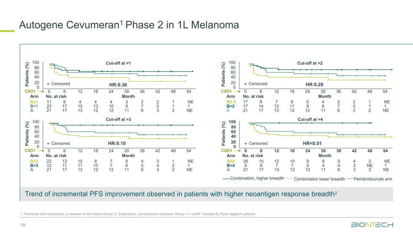 156 1. Partnered with Genentech, a member of the Roche Group; 2. Exploratory, non-powered analyses; Group “<= cutoff” includes ELISpot negative patients Trend of incremental PFS improvement observed in patients with higher neoantigen response breadth2 0 0 6 12 20 40 60 80 100 2418 30 36 42 48 54 P a ti e n ts ( % ) HR<0.01 Cut-off at >4 Month 26 15 12 910 8 5 4 2 NE 21 17 13 1212 11 6 3 2 NE 8 8 7 57 4 4 3 NE 1 B≤4 B>4 A No. at riskArm C8D1 Censored HR:0.28 Cut-off at >2 0 0 6 12 20 40 60 80 100 2418 30 36 42 48 54 Month 17 9 7 56 4 2 2 1 NE 21 17 13 1212 11 6 3 2 NE 17 14 12 911 8 7 5 1 1 B≤ 2 B>2 A No. at riskArm C8D1 CensoredP a ti e n ts ( % ) P a ti e n ts ( % ) Month 11 6 4 44 3 2 2 1 NE 21 17 13 1212 11 6 3 2 NE 23 17 15 1013 9 7 5 1 1 B≤1 B>1 A No. at riskArm C8D1 0 0 6 12 20 40 60 80 100 2418 30 36 42 48 54 HR:0.36 Cut-off at >1 Censored P a ti e n ts ( % ) HR:0.10 Cut-off at >3 Month 22 12 10 78 6 4 3 1 NE 21 17 13 1212 11 6 3 2 NE 12 11 11 710 6 5 4 2 1 B≤3 B>3 A No. at riskArm C8D1 0 0 6 12 20 40 60 80 100 2418 30 36 42 48 54 Censored Combination, higher breadth Combination lower breadth Pembrolizumab arm Autogene Cevumeran1 Phase 2 in 1L Melanoma