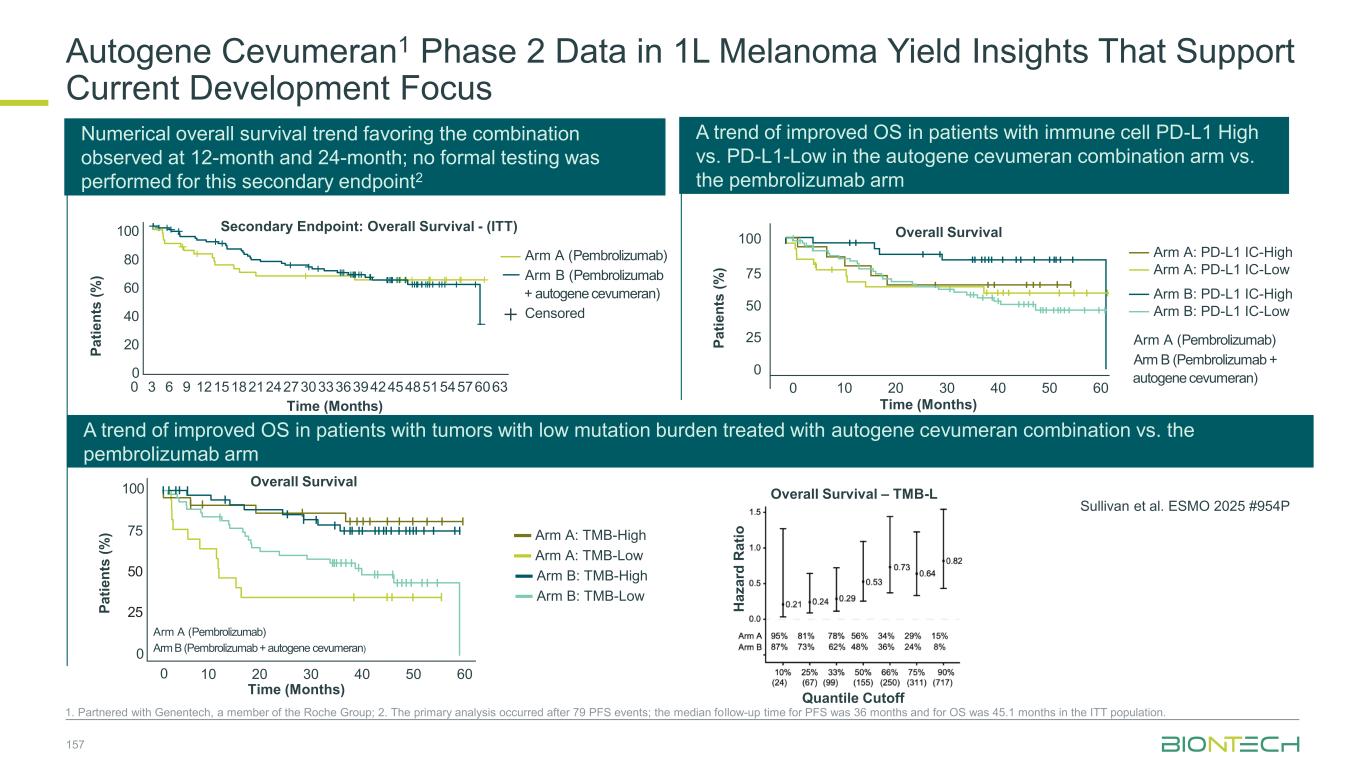 Autogene Cevumeran1 Phase 2 Data in 1L Melanoma Yield Insights That Support Current Development Focus 1. Partnered with Genentech, a member of the Roche Group; 2. The primary analysis occurred after 79 PFS events; the median follow-up time for PFS was 36 months and for OS was 45.1 months in the ITT population. A trend of improved OS in patients with immune cell PD-L1 High vs. PD-L1-Low in the autogene cevumeran combination arm vs. the pembrolizumab arm A trend of improved OS in patients with tumors with low mutation burden treated with autogene cevumeran combination vs. the pembrolizumab arm Time (Months) Overall Survival P a ti e n ts ( % ) Arm A (Pembrolizumab) Arm B (Pembrolizumab + autogene cevumeran) Arm A: PD-L1 IC-High Arm A: PD-L1 IC-Low Arm B: PD-L1 IC-High Arm B: PD-L1 IC-Low 0 10 20 30 40 50 60 0 25 50 75 100 Sullivan et al. ESMO 2025 #954P Numerical overall survival trend favoring the combination observed at 12-month and 24-month; no formal testing was performed for this secondary endpoint2 Time (Months) P a ti e n ts ( % ) 100 80 0 20 40 60 0 3 6 9 121518212427303336394245485154576063 Secondary Endpoint: Overall Survival - (ITT) Overall Survival – TMB-L Quantile Cutoff H a z a rd R a ti o Arm A (Pembrolizumab) Arm B (Pembrolizumab + autogene cevumeran) Censored 100 75 0 25 50 Time (Months) P a ti e n ts ( % ) Arm A (Pembrolizumab) Arm B (Pembrolizumab + autogene cevumeran) Arm A: TMB-High Arm A: TMB-Low Arm B: TMB-High Arm B: TMB-Low Overall Survival 0 10 20 30 40 50 60 157