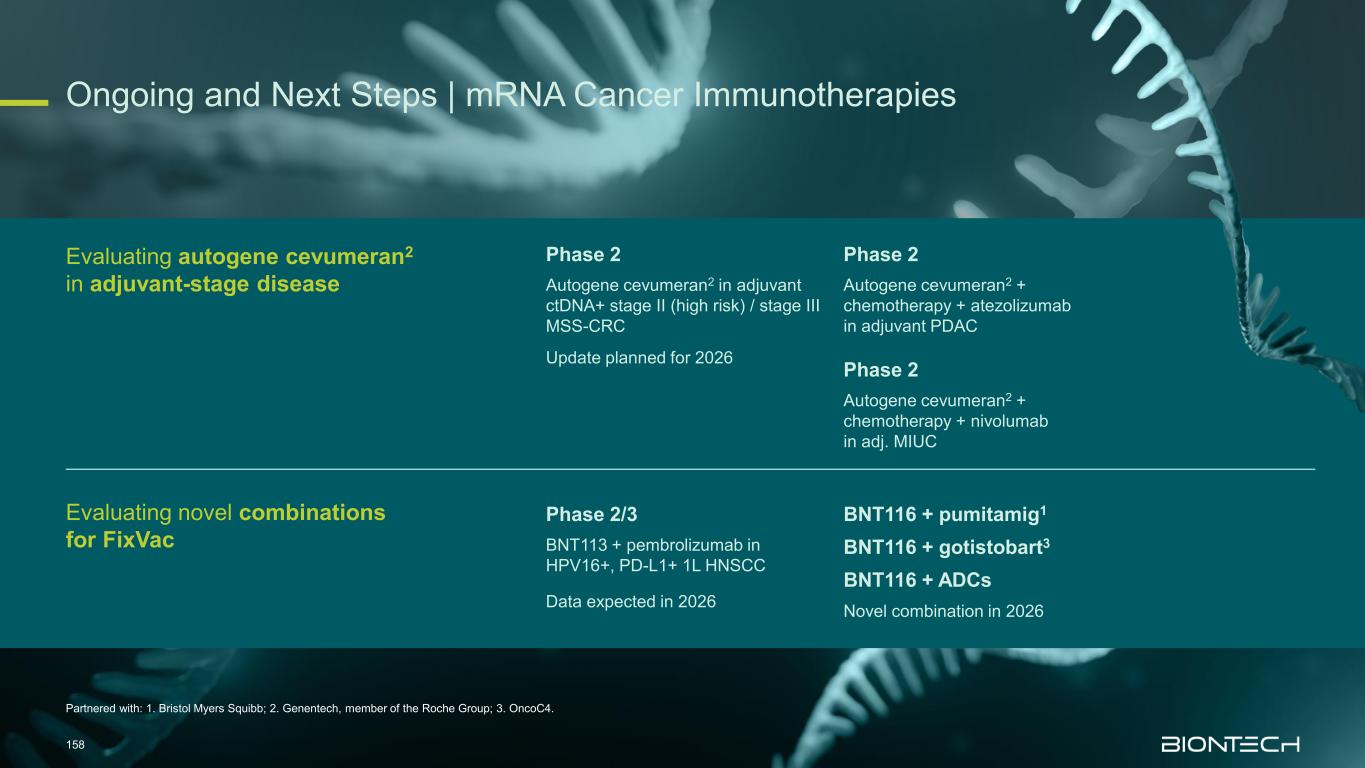 Partnered with: 1. Bristol Myers Squibb; 2. Genentech, member of the Roche Group; 3. OncoC4. Ongoing and Next Steps | mRNA Cancer Immunotherapies 158 Evaluating autogene cevumeran2 in adjuvant-stage disease Evaluating novel combinations for FixVac Phase 2 Autogene cevumeran2 in adjuvant ctDNA+ stage II (high risk) / stage III MSS-CRC Phase 2 Autogene cevumeran2 + chemotherapy + atezolizumab in adjuvant PDAC Update planned for 2026 Phase 2 Autogene cevumeran2 + chemotherapy + nivolumab in adj. MIUC Phase 2/3 BNT113 + pembrolizumab in HPV16+, PD-L1+ 1L HNSCC BNT116 + pumitamig1 BNT116 + ADCs BNT116 + gotistobart3 Data expected in 2026 Novel combination in 2026