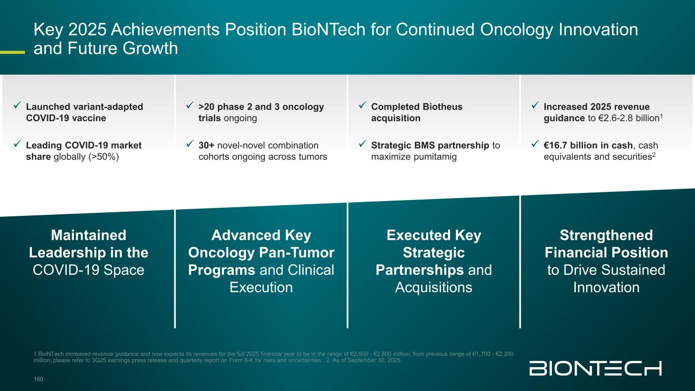 ✓ Launched variant-adapted COVID-19 vaccine ✓ Leading COVID-19 market share globally (>50%) ✓ >20 phase 2 and 3 oncology trials ongoing ✓ 30+ novel-novel combination cohorts ongoing across tumors ✓ Completed Biotheus acquisition ✓ Strategic BMS partnership to maximize pumitamig ✓ Increased 2025 revenue guidance to €2.6-2.8 billion1 ✓ €16.7 billion in cash, cash equivalents and securities2 Maintained Leadership in the COVID-19 Space Advanced Key Oncology Pan-Tumor Programs and Clinical Execution Executed Key Strategic Partnerships and Acquisitions Strengthened Financial Position to Drive Sustained Innovation 1 BioNTech increased revenue guidance and now expects its revenues for the full 2025 financial year to be in the range of €2,600 - €2,800 million, from previous range of €1,700 - €2,200 million; please refer to 3Q25 earnings press release and quarterly report on Form 6-K for risks and uncertainties. 2. As of September 30, 2025. Key 2025 Achievements Position BioNTech for Continued Oncology Innovation and Future Growth 160