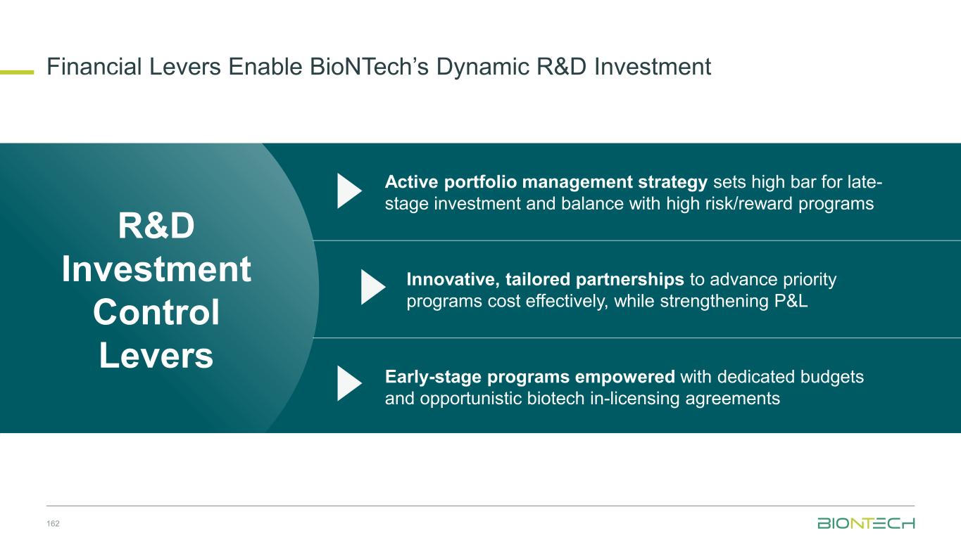 Financial Levers Enable BioNTech’s Dynamic R&D Investment 162 R&D Investment Control Levers Active portfolio management strategy sets high bar for late- stage investment and balance with high risk/reward programs Innovative, tailored partnerships to advance priority programs cost effectively, while strengthening P&L Early-stage programs empowered with dedicated budgets and opportunistic biotech in-licensing agreements