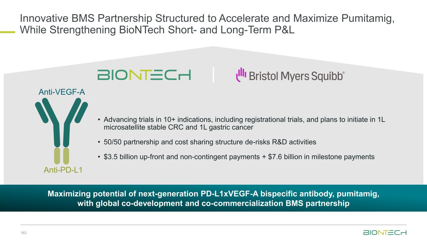 163 Innovative BMS Partnership Structured to Accelerate and Maximize Pumitamig, While Strengthening BioNTech Short- and Long-Term P&L Maximizing potential of next-generation PD-L1xVEGF-A bispecific antibody, pumitamig, with global co-development and co-commercialization BMS partnership • Advancing trials in 10+ indications, including registrational trials, and plans to initiate in 1L microsatellite stable CRC and 1L gastric cancer • 50/50 partnership and cost sharing structure de-risks R&D activities • $3.5 billion up-front and non-contingent payments + $7.6 billion in milestone payments Anti-PD-L1 Anti-VEGF-A