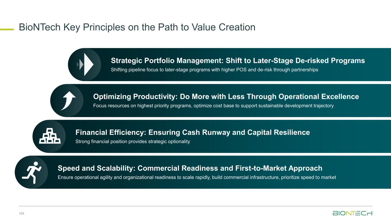 BioNTech Key Principles on the Path to Value Creation 164 Speed and Scalability: Commercial Readiness and First-to-Market Approach Ensure operational agility and organizational readiness to scale rapidly, build commercial infrastructure, prioritize speed to market Financial Efficiency: Ensuring Cash Runway and Capital Resilience Strong financial position provides strategic optionality Optimizing Productivity: Do More with Less Through Operational Excellence Focus resources on highest priority programs, optimize cost base to support sustainable development trajectory Strategic Portfolio Management: Shift to Later-Stage De-risked Programs Shifting pipeline focus to later-stage programs with higher POS and de-risk through partnerships 164
