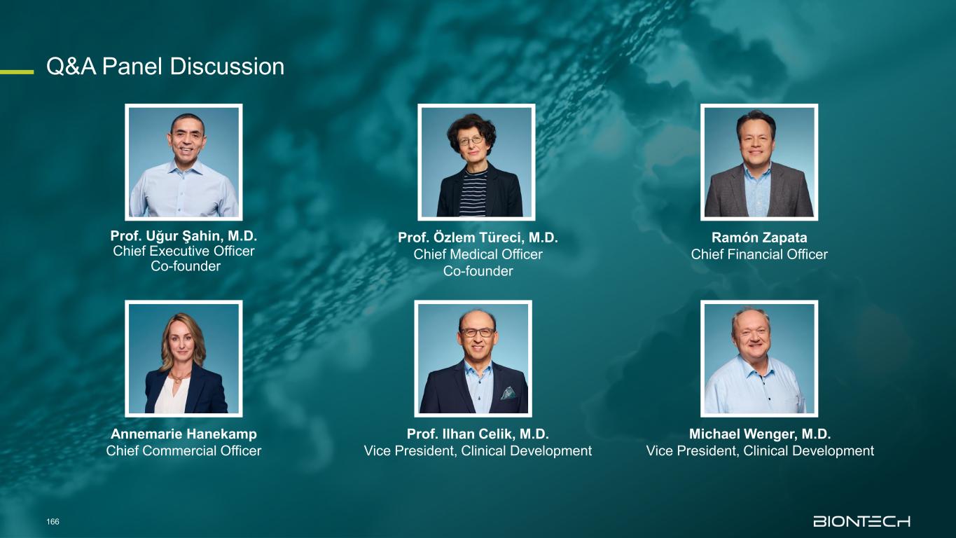 Prof. Uğur Şahin, M.D. Chief Executive Officer Co-founder Annemarie Hanekamp Chief Commercial Officer Prof. Özlem Türeci, M.D. Chief Medical Officer Co-founder Ramón Zapata Chief Financial Officer Michael Wenger, M.D. Vice President, Clinical Development Prof. Ilhan Celik, M.D. Vice President, Clinical Development Q&A Panel Discussion 166
