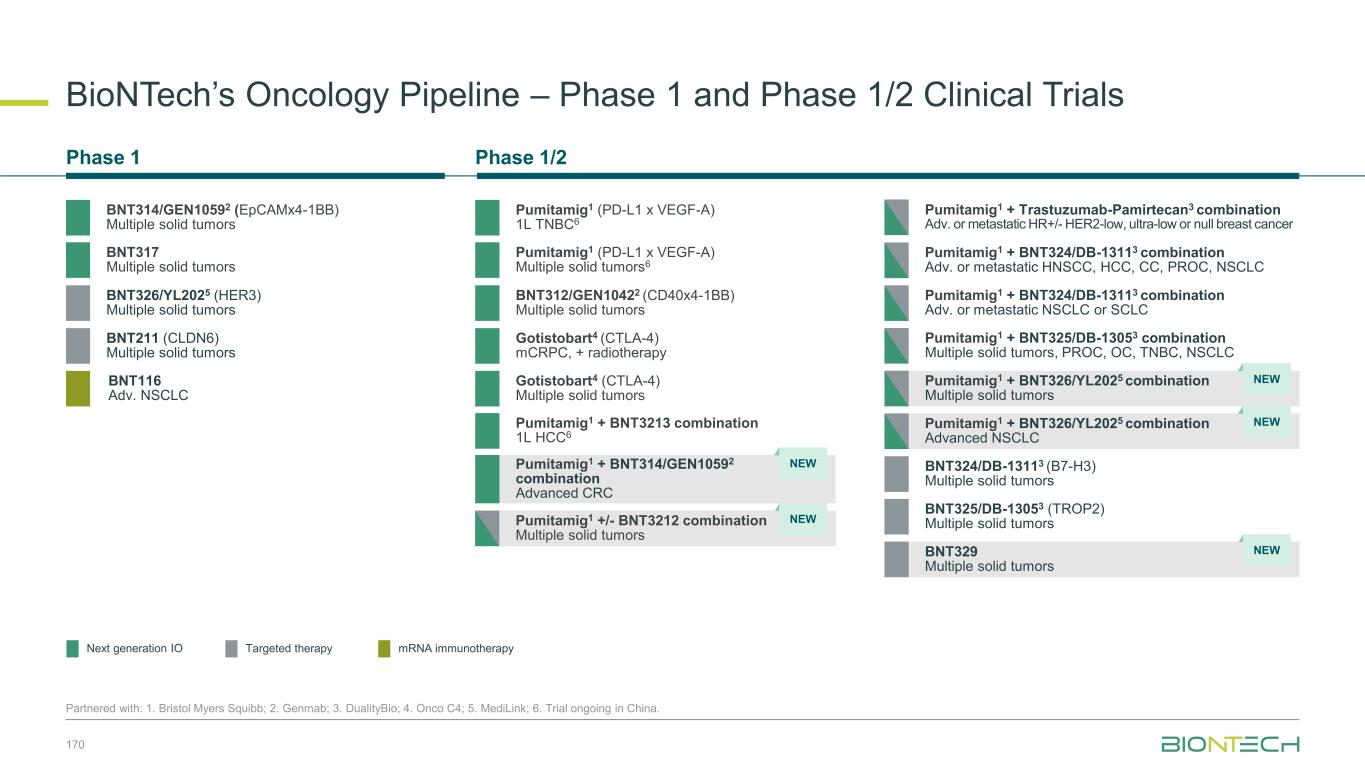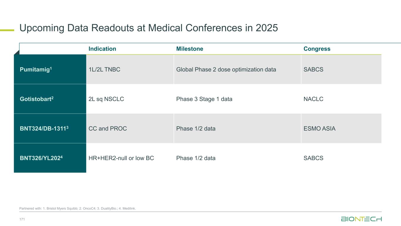 BioNTech’s Oncology Pipeline – Phase 1 and Phase 1/2 Clinical Trials 170 Partnered with: 1. Bristol Myers Squibb; 2. Genmab; 3. DualityBio; 4. Onco C4; 5. MediLink; 6. Trial ongoing in China. Phase 1/2Phase 1 BNT312/GEN10422 (CD40x4-1BB) Multiple solid tumors Gotistobart4 (CTLA-4) Multiple solid tumors BNT116 Adv. NSCLC BNT211 (CLDN6) Multiple solid tumors BNT314/GEN10592 (EpCAMx4-1BB) Multiple solid tumors BNT326/YL2025 (HER3) Multiple solid tumors BNT317 Multiple solid tumors Gotistobart4 (CTLA-4) mCRPC, + radiotherapy Pumitamig1 (PD-L1 x VEGF-A) 1L TNBC6 Pumitamig1 (PD-L1 x VEGF-A) Multiple solid tumors6 Pumitamig1 + BNT3213 combination 1L HCC6 BNT325/DB-13053 (TROP2) Multiple solid tumors BNT324/DB-13113 (B7-H3) Multiple solid tumors BNT329 Multiple solid tumors NEW Pumitamig1 + BNT325/DB-13053 combination Multiple solid tumors, PROC, OC, TNBC, NSCLC Pumitamig1 + BNT324/DB-13113 combination Adv. or metastatic HNSCC, HCC, CC, PROC, NSCLC Pumitamig1 + BNT324/DB-13113 combination Adv. or metastatic NSCLC or SCLC Pumitamig1 + BNT326/YL2025 combination Multiple solid tumors Pumitamig1 + Trastuzumab-Pamirtecan3 combination Adv. or metastatic HR+/- HER2-low, ultra-low or null breast cancer Pumitamig1 + BNT326/YL2025 combination Advanced NSCLC NEW NEW Pumitamig1 +/- BNT3212 combination Multiple solid tumors NEW mRNA immunotherapyNext generation IO Targeted therapy Pumitamig1 + BNT314/GEN10592 combination Advanced CRC NEW