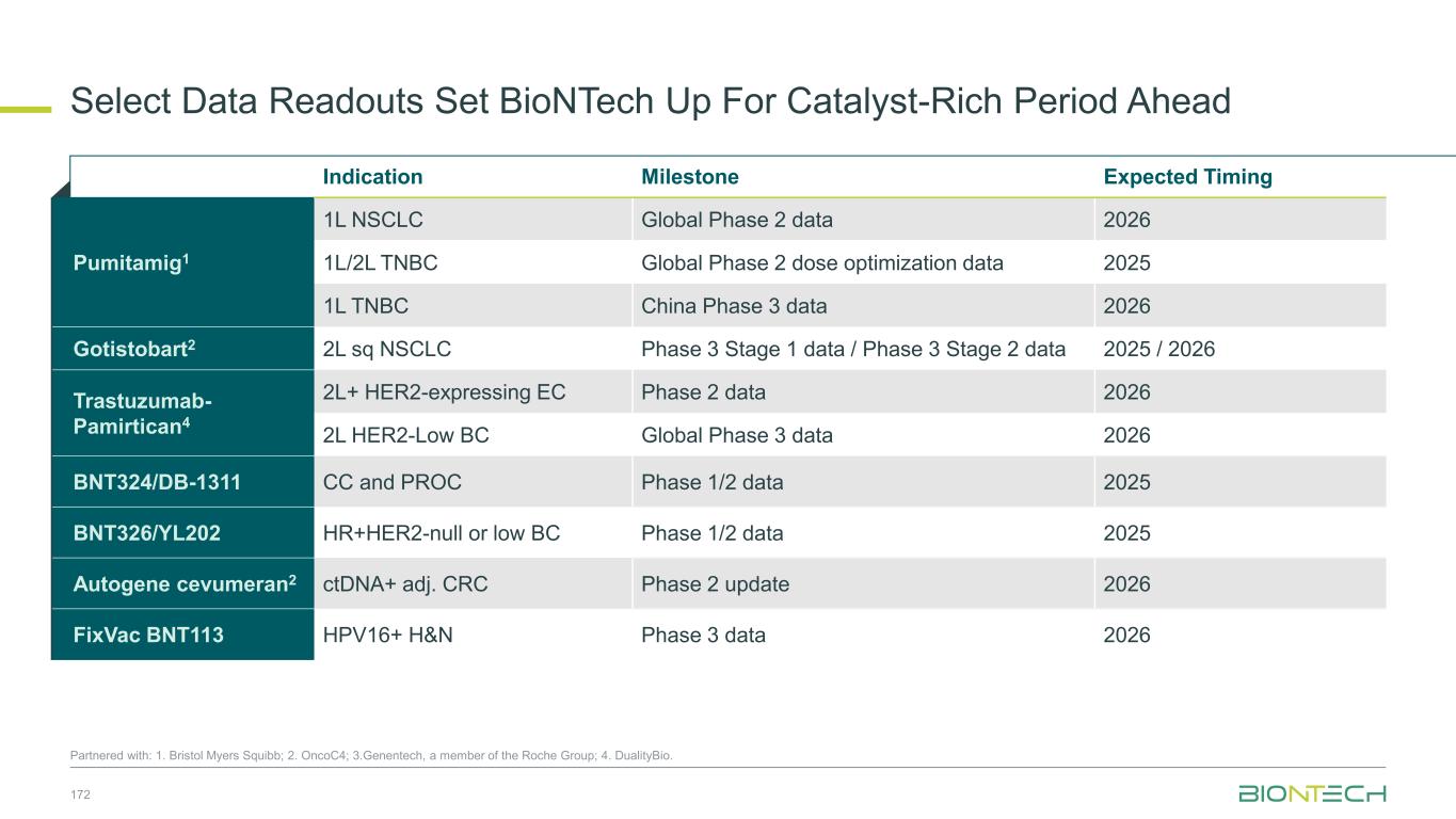 Upcoming Data Readouts at Medical Conferences in 2025 171 Indication Milestone Congress Pumitamig1 1L/2L TNBC Global Phase 2 dose optimization data SABCS Gotistobart2 2L sq NSCLC Phase 3 Stage 1 data NACLC BNT324/DB-13113 CC and PROC Phase 1/2 data ESMO ASIA BNT326/YL2024 HR+HER2-null or low BC Phase 1/2 data SABCS Partnered with: 1. Bristol Myers Squibb; 2. OncoC4; 3. DualityBio.; 4. Medilink.