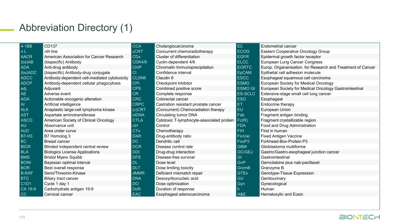 Select Data Readouts Set BioNTech Up For Catalyst-Rich Period Ahead 172 Partnered with: 1. Bristol Myers Squibb; 2. OncoC4; 3.Genentech, a member of the Roche Group; 4. DualityBio. Indication Milestone Expected Timing Pumitamig1 1L NSCLC Global Phase 2 data 2026 1L/2L TNBC Global Phase 2 dose optimization data 2025 1L TNBC China Phase 3 data 2026 Gotistobart2 2L sq NSCLC Phase 3 Stage 1 data / Phase 3 Stage 2 data 2025 / 2026 Trastuzumab- Pamirtican4 2L+ HER2-expressing EC Phase 2 data 2026 2L HER2-Low BC Global Phase 3 data 2026 BNT324/DB-1311 CC and PROC Phase 1/2 data 2025 BNT326/YL202 HR+HER2-null or low BC Phase 1/2 data 2025 Autogene cevumeran2 ctDNA+ adj. CRC Phase 2 update 2026 FixVac BNT113 HPV16+ H&N Phase 3 data 2026