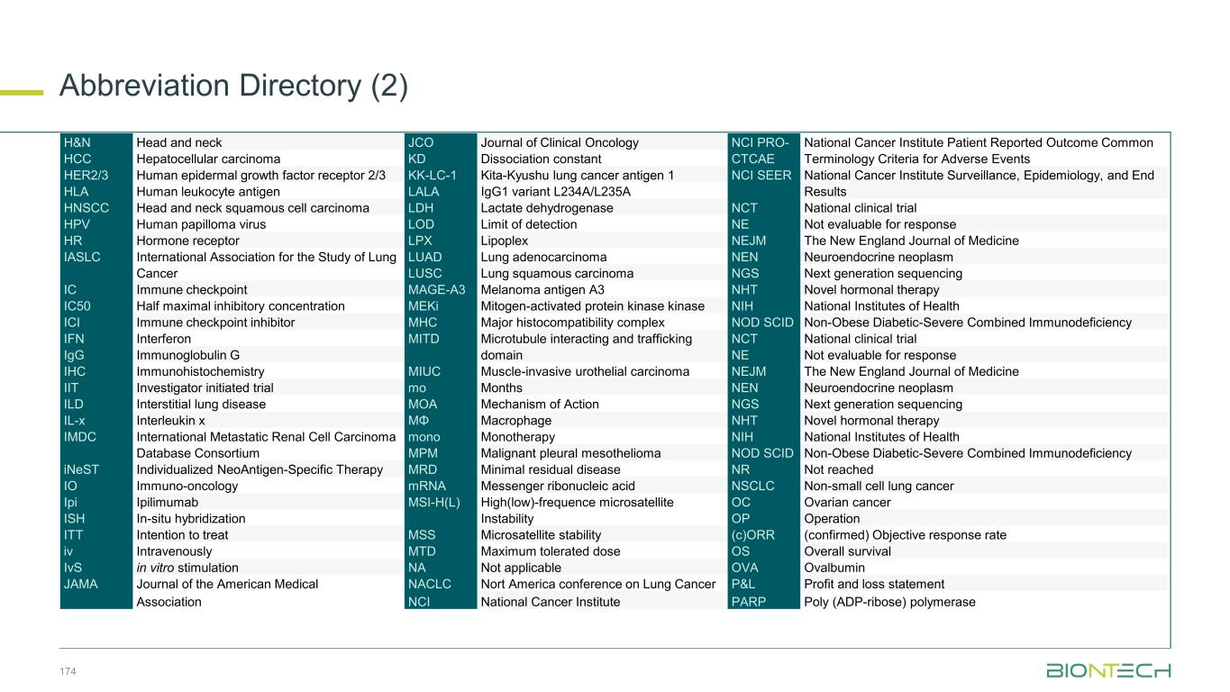 Abbreviation Directory (2) H&N Head and neck JCO Journal of Clinical Oncology NCI PRO- National Cancer Institute Patient Reported Outcome Common HCC Hepatocellular carcinoma KD Dissociation constant CTCAE Terminology Criteria for Adverse Events HER2/3 Human epidermal growth factor receptor 2/3 KK-LC-1 Kita-Kyushu lung cancer antigen 1 NCI SEER National Cancer Institute Surveillance, Epidemiology, and End HLA Human leukocyte antigen LALA IgG1 variant L234A/L235A Results HNSCC Head and neck squamous cell carcinoma LDH Lactate dehydrogenase NCT National clinical trial HPV Human papilloma virus LOD Limit of detection NE Not evaluable for response HR Hormone receptor LPX Lipoplex NEJM The New England Journal of Medicine IASLC International Association for the Study of Lung LUAD Lung adenocarcinoma NEN Neuroendocrine neoplasm Cancer LUSC Lung squamous carcinoma NGS Next generation sequencing IC Immune checkpoint MAGE-A3 Melanoma antigen A3 NHT Novel hormonal therapy IC50 Half maximal inhibitory concentration MEKi Mitogen-activated protein kinase kinase NIH National Institutes of Health ICI Immune checkpoint inhibitor MHC Major histocompatibility complex NOD SCID Non-Obese Diabetic-Severe Combined Immunodeficiency IFN Interferon MITD Microtubule interacting and trafficking NCT National clinical trial IgG Immunoglobulin G domain NE Not evaluable for response IHC Immunohistochemistry MIUC Muscle-invasive urothelial carcinoma NEJM The New England Journal of Medicine IIT Investigator initiated trial mo Months NEN Neuroendocrine neoplasm ILD Interstitial lung disease MOA Mechanism of Action NGS Next generation sequencing IL-x Interleukin x MΦ Macrophage NHT Novel hormonal therapy IMDC International Metastatic Renal Cell Carcinoma mono Monotherapy NIH National Institutes of Health Database Consortium MPM Malignant pleural mesothelioma NOD SCID Non-Obese Diabetic-Severe Combined Immunodeficiency iNeST Individualized NeoAntigen-Specific Therapy MRD Minimal residual disease NR Not reached IO Immuno-oncology mRNA Messenger ribonucleic acid NSCLC Non-small cell lung cancer Ipi Ipilimumab MSI-H(L) High(low)-frequence microsatellite OC Ovarian cancer ISH In-situ hybridization Instability OP Operation ITT Intention to treat MSS Microsatellite stability (c)ORR (confirmed) Objective response rate iv Intravenously MTD Maximum tolerated dose OS Overall survival IvS in vitro stimulation NA Not applicable OVA Ovalbumin JAMA Journal of the American Medical NACLC Nort America conference on Lung Cancer P&L Profit and loss statement Association NCI National Cancer Institute PARP Poly (ADP-ribose) polymerase 174