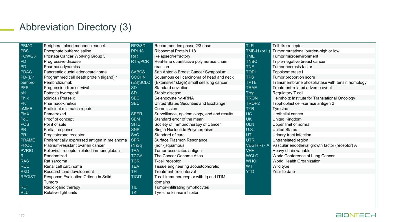 Abbreviation Directory (3) PBMC Peripheral blood mononuclear cell RP2/3D Recommended phase 2/3 dose TLR Toll-like receptor PBS Phosphate buffered saline RPL18 Ribosomal Protein L18 TMB-H (or L) Tumor mutational burden-high or low PCWG3 Prostate Cancer Working Group 3 R/R Relapsed/refractory TME Tumor microenvironment PD Progressive disease RT-qPCR Real-time quantitative polymerase chain TNBC Triple-negative breast cancer PD Pharmacodynamics reaction TNF Tumor necrosis factor PDAC Pancreatic ductal adenocarcinoma SABCS San Antonio Breast Cancer Symposium TOP1 Topoisomerase I PD-(L)1 Programmed cell death protein (ligand) 1 SCCHN Squamous cell carcinoma of head and neck TPS Tumor proportion score pembro Pembrolizumab (ES)SCLC (Extensive/ stage) small cell lung cancer TPTE Transmembrane phosphatase with tensin homology PFS Progression-free survival SD Standard deviation TRAE Treatment-related adverse event pH Potentia hydrogenii SD Stable disease Treg Regulatory T cell Ph x (clinical) Phase x SEC Selenocysteinyl-tRNA TRON Helmholtz Institute for Translational Oncology PK Pharmacokinetics SEC United States Securities and Exchange TROP2 Trophoblast cell-surface antigen 2 pMMR Proficient mismatch repair Commission TYR Tyrosine PMX Pemetrexed SEER Surveillance, epidemiology, and end results UC Urothelial cancer PoC Proof of concept SEM Standard error of the mean UK United Kingdom POS Point of sale SITC Society of Immunotherapy of Cancer ULN Upper limit of normal PR Partial response SNP Single Nucleotide Polymorphism U.S. United States PR Progesterone receptor SoC Standard of care UTI Urinary tract infection PRAME Preferentially expressed antigen in melanoma SPR Surface Plasmon Resonance UTR Untranslated region PROC Platinum-resistant ovarian cancer (N)Sq (non-)squamous VEGF(R) - A Vascular endothelial growth factor (receptor) A PVRIG Poliovirus receptor-related immunoglobulin TAA Tumor-associated antigen VHH Heavy chain variable R Randomized TCGA The Cancer Genome Atlas WCLC World Conference of Lung Cancer RAS Rat sarcoma TCR T-cell receptor WHO World Health Organization RCC Renal cell carcinoma TEA Tissue engineering acoustophoretic WT Wild type R&D Research and development TFI Treatment-free interval YTD Year to date RECIST Response Evaluation Criteria in Solid TIGIT T cell immunoreceptor with Ig and ITIM Tumors domains RLT Radioligand therapy TIL Tumor-infiltrating lymphocytes RLU Relative light units TKI Tyrosine kinase inhibitor 175
