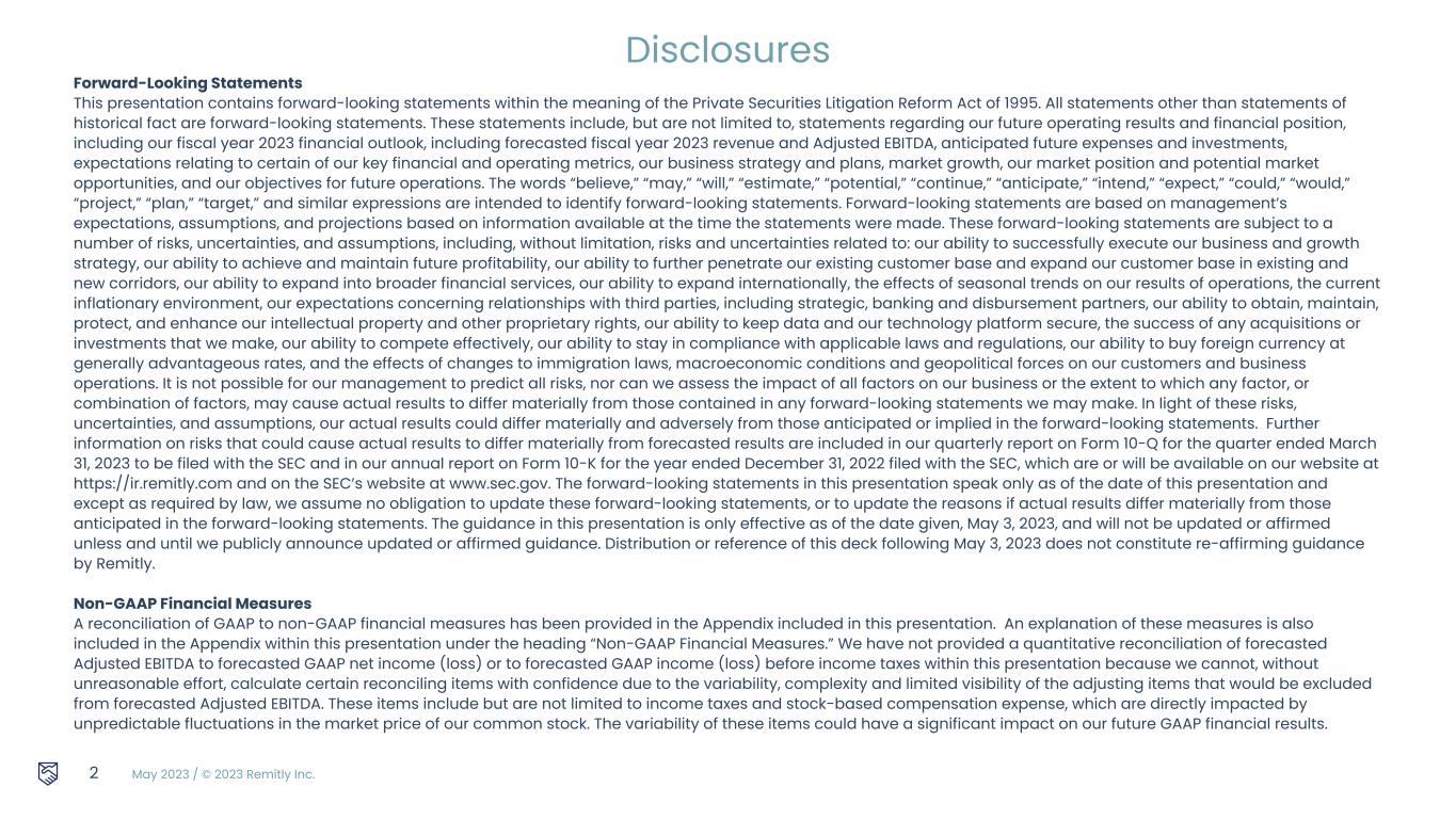 このプレスリリースには、1995年米国私募証券訴訟改革法にいうところの「将来予想に関する記述」が含まれています。歴史的事実に関する記述以外のすべての記述は、将来予想に関する記述です。これらの記述には、2023年度の売上高および調整後EBITDAの予測を含む2023年度の財務見通し、予想される将来の費用および投資、特定の主要財務および営業指標に関する予想、当社の事業戦略および計画、市場の成長、当社の市場における地位および潜在的な市場機会、ならびに将来の事業に関する当社の目標など、当社の将来の営業成績および財務状態に関する記述が含まれますが、これらに限定されません。なお、「確信」、「可能性」、「予定」、「推定」、「可能性」、「継続」、「予測」、「意図」、「期待」、「可能性」、「するだろう」、「プロジェクト」、「計画」、「目標」、及び同様の表現は、将来に関する記述を識別するためのものです。将来予想に関する記述は、その記述がなされた時点で入手可能な情報に基づく経営者の期待、仮定及び予測に基づくものです。これらの将来予想に関する記述は、当社の事業および成長戦略を成功させる能力、将来の収益性を達成し維持する能力、既存の顧客基盤にさらに浸透し、既存および新規の通路において顧客基盤を拡大する能力、より幅広い金融サービスに進出する能力、国際的に拡大する能力、当社の業績に対する季節動向の影響、現在のインフレ環境、第三者との関係に関する当社の期待などに関するリスクや不確実性、仮定などを含む多くのリスクを含んでいます、戦略的提携先、銀行提携先、資金提供先を含む提携先、当社の知的財産権およびその他の財産権を取得、維持、保護、強化する能力、データおよび当社の技術プラットフォームを安全に保つ能力、当社が行う買収または投資の成功、効果的に競争する能力、適用法令を遵守する能力、一般的に有利なレートで外貨を購入する能力、移民法、マクロ経済状況、地政学的勢力が当社の顧客や事業活動に与える影響などです。当社の経営陣がすべてのリスクを予測することは不可能であり、また、すべての要因が当社のビジネスに与える影響や、いかなる要因、または要因の組み合わせが、当社が行う将来見通しに関する記述に含まれるものと実際の結果が大きく異なる可能性をどの程度引き起こすかを評価することはできません。これらのリスク、不確実性および仮定を考慮した場合、当社の実際の業績は、将来予想に関する記述で予想または暗示されているものとは大きく異なる可能性があります。実際の結果が予測結果と大きく異なる原因となるリスクに関する詳細な情報は、SECに提出される2023年3月31日に終了した四半期のフォーム10-Qによる四半期報告書、およびSECに提出される2022年12月31日に終了した年度のフォーム10-Kによる年次報告書に含まれており、これらは当社のウェブサイトhttps://ir.remitly.com、SECのウェブサイトwww.sec.gov で入手可能か今後入手可能になります。法律で義務付けられている場合を除き、当社はこれらの将来予想に関する記述を更新する義務、または実際の結果が将来予想に関する記述で予想されたものと大きく異なる場合にその理由を更新する義務を負いません。
