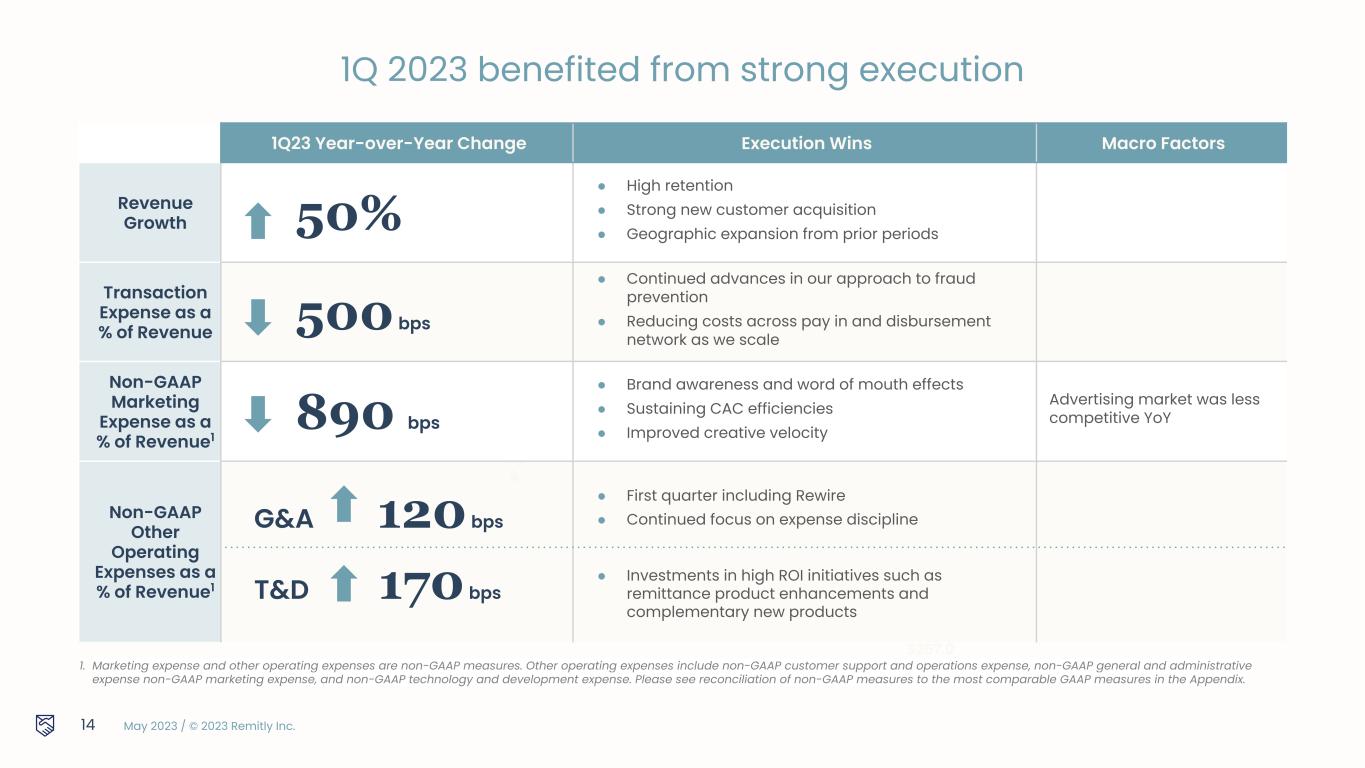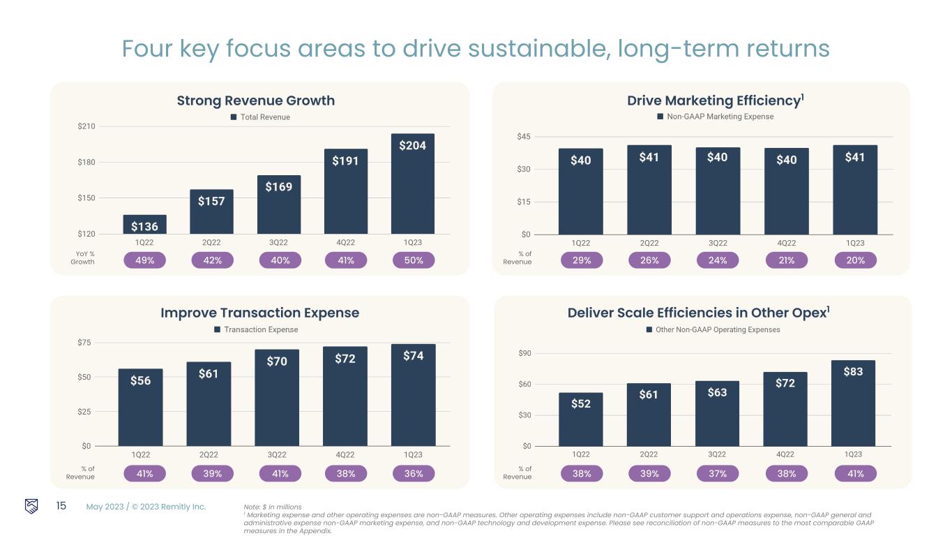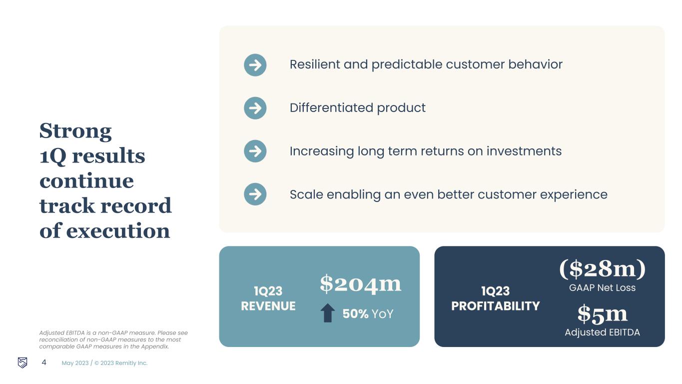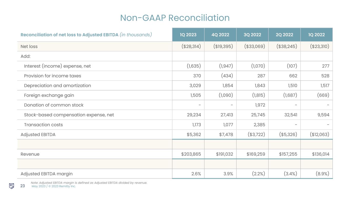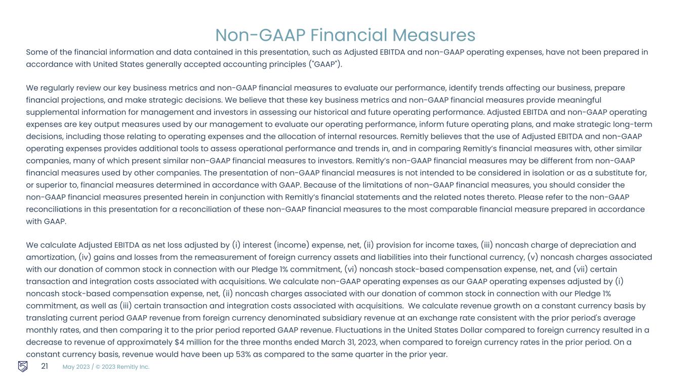私たちは、業績の評価、事業に影響を与える傾向の特定、財務予測の作成、戦略的意思決定のために、主要なビジネス指標と非GAAPベースの財務指標を定期的に見直しています。当社は、これらの主要なビジネス指標および非GAAPベースの財務指標は、経営者および投資家が当社の過去および将来の営業成績を評価する際に、意味のある補足情報を提供すると考えています。調整後EBITDAおよび非GAAP営業費用は、当社の経営陣が当社の営業成績を評価し、将来の営業計画を伝え、営業費用および内部資源の配分に関連するものを含む戦略的長期決定を行うために使用する主要な出力指標です。レミトリーは、調整後EBITDAおよび非GAAP営業費用の使用は、投資家に対して同様の非GAAP財務指標を提示する他の類似企業との比較において、業務実績および傾向を評価する追加ツールを提供すると考えています。Remitlyの非GAAP財務指標は、他の企業が使用する非GAAP財務指標と異なる場合があります。非GAAP財務指標の提示は、単独で、またはGAAPに従って決定された財務指標の代替または優位性として考慮されることを意図していません。非GAAP財務指標には限界があるため、ここに示された非GAAP財務指標は、Remitlyの財務諸表およびその関連注記と合わせて検討する必要があります。これらの非GAAP財務指標とGAAPに従って作成された最も比較可能な財務指標との調整については、このプレスリリースの非GAAP調整表を参照してください。