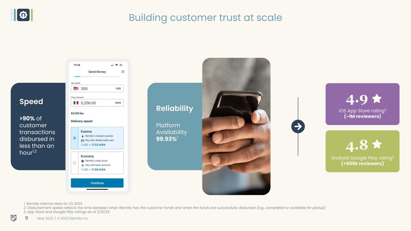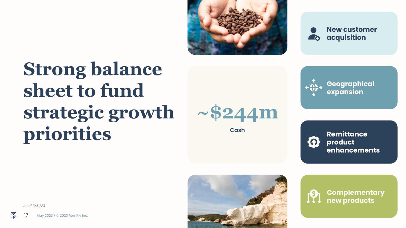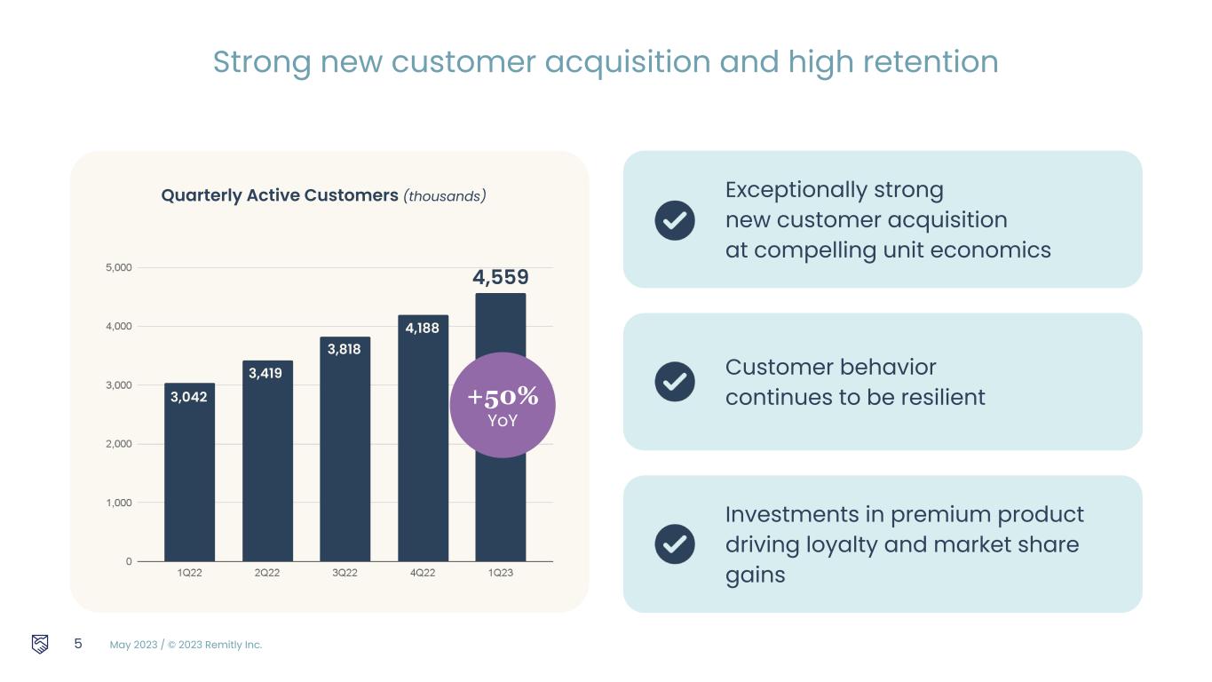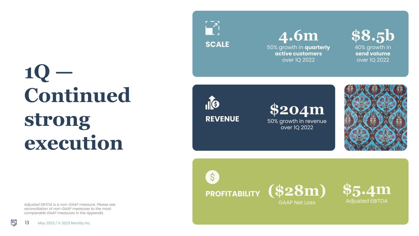 ワシントン州シアトル / 2023年5月3日 / GlobeNewswire / - 世界170カ国以上で移民とその家族のためにデジタル金融サービスを提供する大手企業、Remitly Global, Inc. (NASDAQ: RELY) は、2023年3月31日に終了した第1四半期の業績を報告しました。