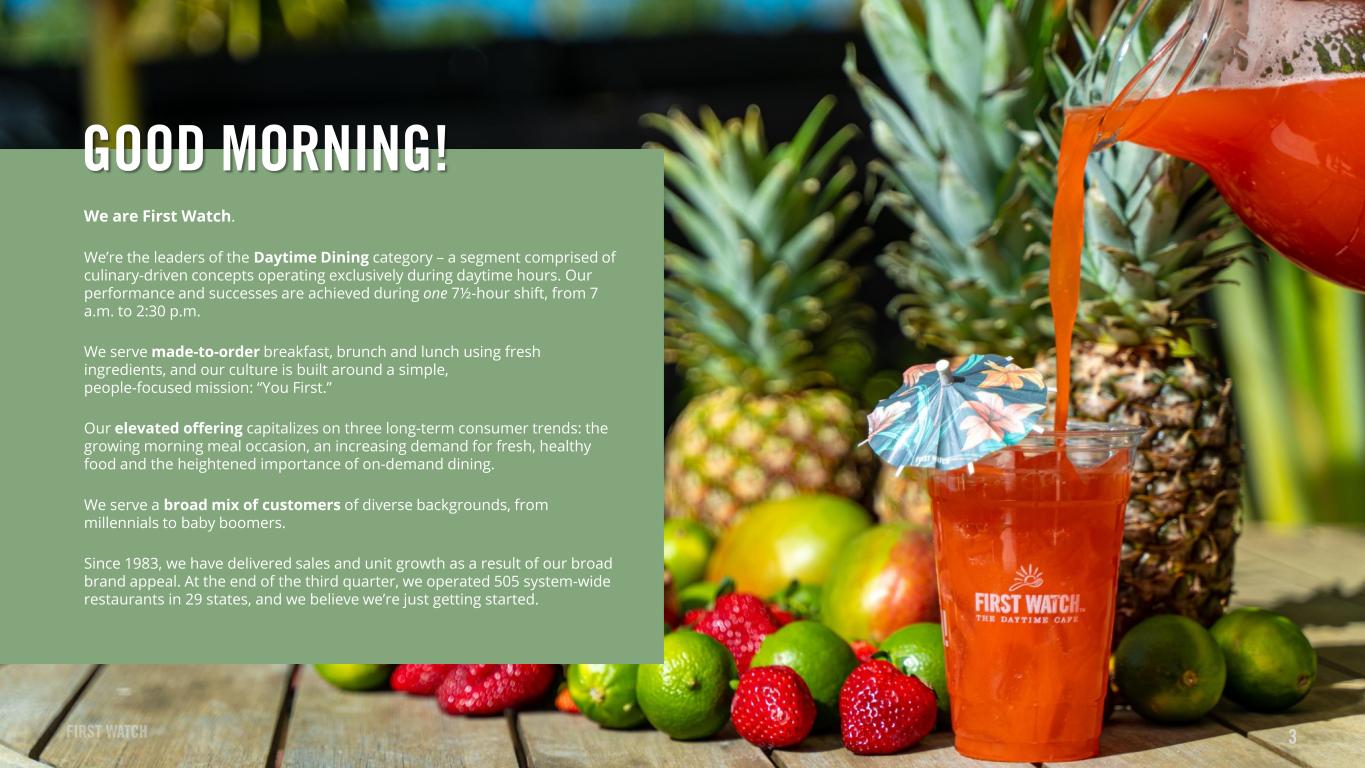 フロリダ州ブレイデントン-2023年11月1日-朝食、ブランチ、ランチを提供するデイタイム・ダイニングの大手であるファースト・ウォッチ・レストラン・グループ(NASDAQ: FWRG)(以下「ファースト・ウォッチ」または「当社」)は本日、2023年9月24日に終了した13週間(以下「2023年第3四半期」)の業績を報告し、2023会計年度のガイダンスを更新した。