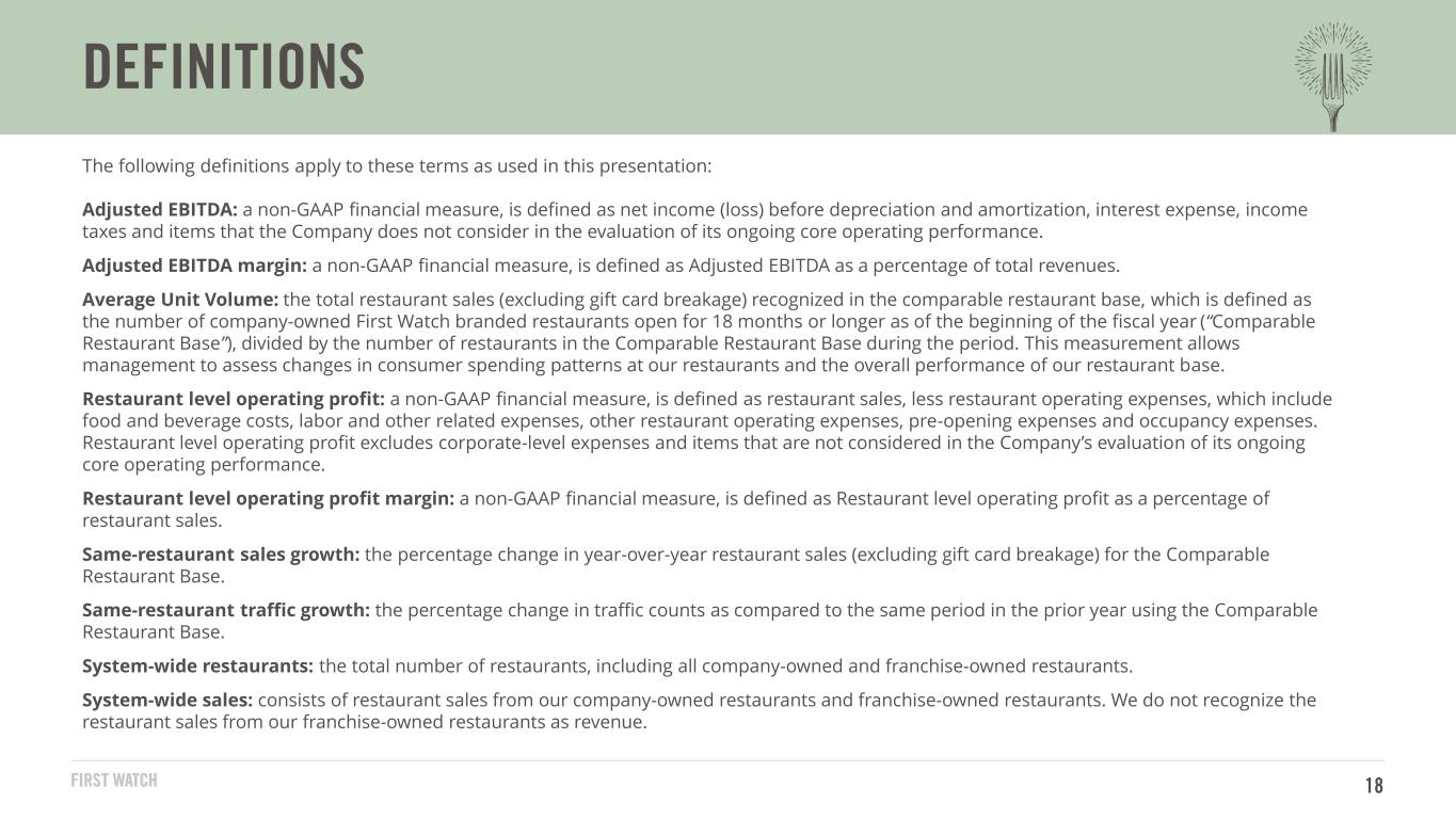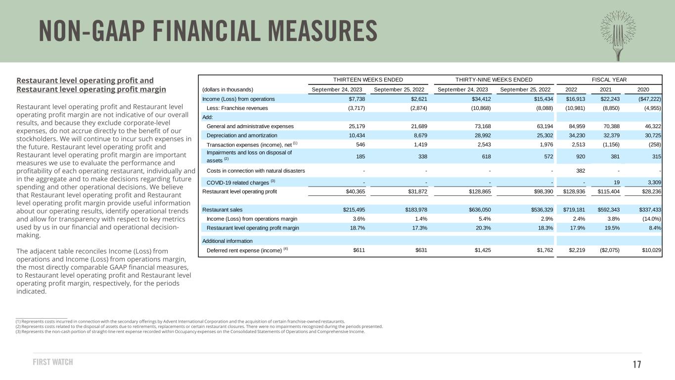 2023年9月24日に終了した第13週に関する追加財務情報については、2023年11月1日に米国証券取引委員会に提出された当社の四半期報告書(フォーム10-Q)を参照されたい。同報告書は、https://investors.firstwatch.com「財務&ファイリング」セクションからアクセスできる。