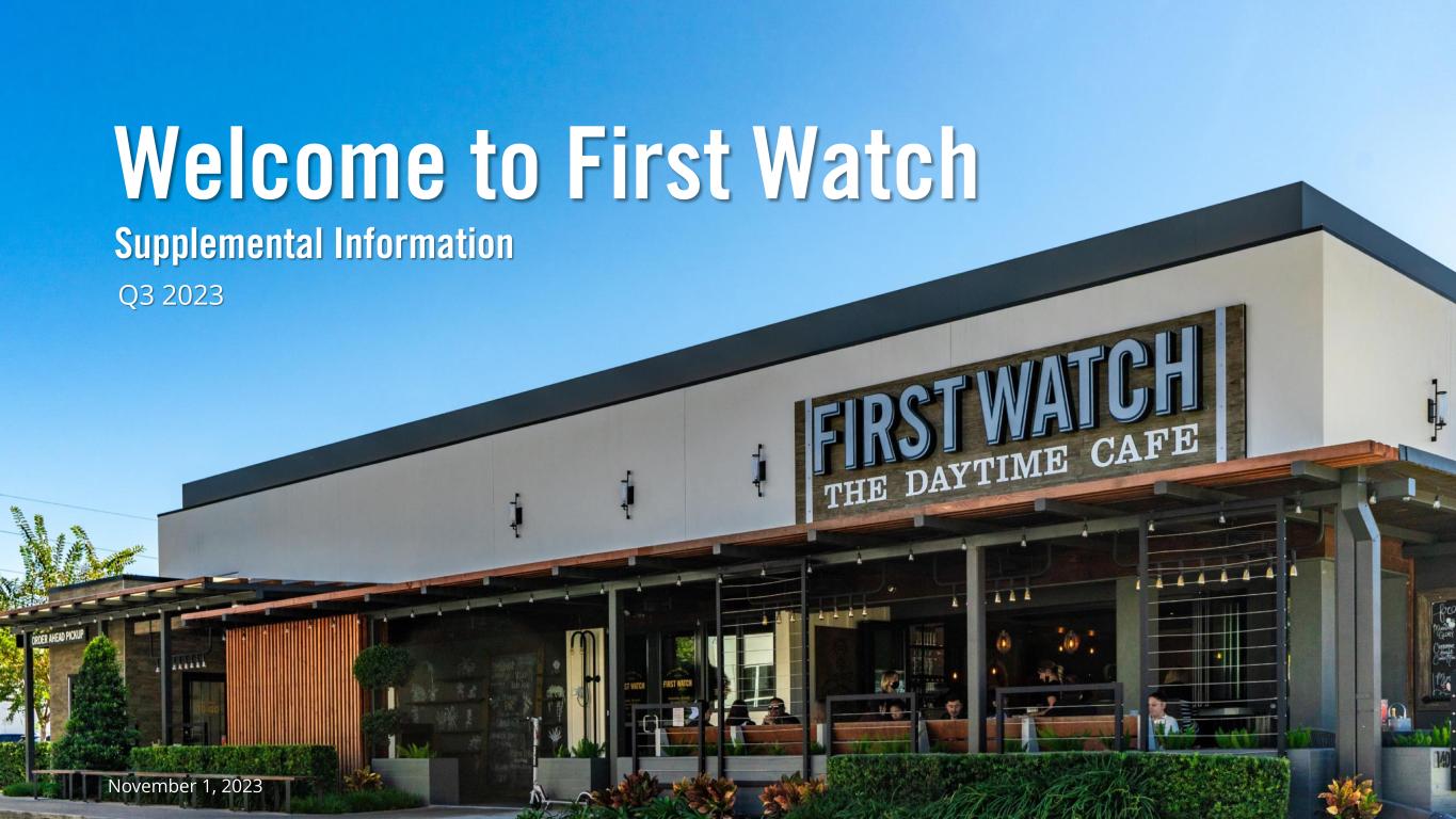 BRADENTON, Fla. — November 1, 2023 — First Watch Restaurant Group, Inc. (NASDAQ: FWRG) (“First Watch” or the “Company”), the leading Daytime Dining concept serving breakfast, brunch and lunch, today reported financial results for the thirteen weeks ended September 24, 2023 (“Q3 2023”) and updates its fiscal year 2023 guidance.