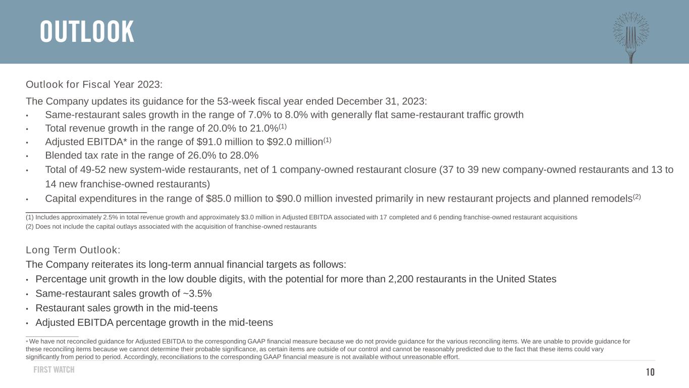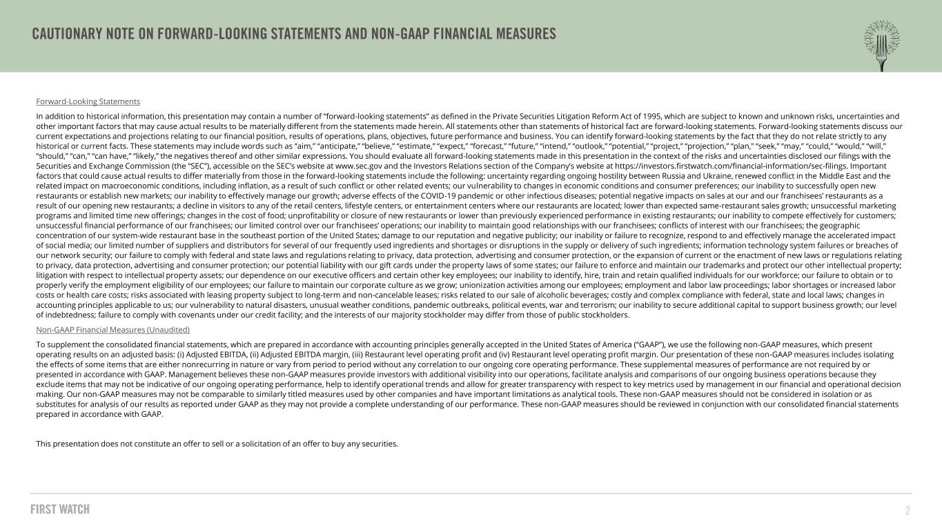 This release contains forward-looking statements within the meaning of the Private Securities Litigation Reform Act of 1995, which are subject to known and unknown risks, uncertainties and other important factors that may cause actual results to be materially different from the statements made herein. All statements other than statements of historical fact are forward-looking statements. Forward-looking statements discuss our current expectations and projections relating to our financial position, results of operations, plans, objectives, future performance and business. You can identify forward-looking statements by the fact that they do not relate strictly to any historical or current facts. These statements may include words such as “aim,” “anticipate,” “believe,” “estimate,” “expect,” “forecast,” “future,” “intend,” “outlook,” “potential,” “project,” “projection,” “plan,” “seek,” “may,” “could,” “would,” “will,” “should,” “can,” “can have,” “likely,” the negatives thereof and other similar expressions. You should evaluate all forward-looking statements made in this press release in the context of the risks and uncertainties disclosed herein, in our Annual Report on Form 10-K as of and for the year ended December 25, 2022, including under Part I. Item 1A. “Risk Factors” and Part II. Item 7. “Management’s Discussion and Analysis of Financial Condition and Results of Operations,” and our other filings with the Securities and Exchange Commission (the “SEC”), accessible on the SEC’s website at www.sec.gov and the Investors Relations section of the Company’s website at https://investors.firstwatch.com/financial-information/sec-filings. Important factors that could cause actual results to differ materially from those in the forward-looking statements include the following: uncertainty regarding ongoing hostility between Russia and Ukraine, renewed conflict in the Middle East and the related impact on macroeconomic conditions, including inflation, as a result of such conflict or other related events; our vulnerability to changes in economic conditions and consumer preferences; our inability to successfully open new restaurants or establish new markets; our inability to effectively manage our growth; adverse effects of the COVID-19 pandemic or other infectious diseases; potential negative impacts on sales at our and our franchisees’ restaurants as a result of our opening new restaurants; a decline in visitors to any of the retail centers, lifestyle centers, or entertainment centers where our restaurants are located; lower than expected same-restaurant sales growth; unsuccessful marketing programs and limited time new offerings; changes in the cost of food; unprofitability or closure of new restaurants or lower than previously experienced performance in existing restaurants; our inability to compete effectively for customers; unsuccessful financial performance of our franchisees; our limited control over our franchisees’ operations; our inability to maintain good relationships with our franchisees; conflicts of interest with our franchisees; the geographic concentration of our system-wide restaurant base in the southeast portion of the United States; damage to our reputation and negative publicity; our inability or failure to recognize, respond to and effectively manage the accelerated impact of social media; our limited number of suppliers and distributors for several of our frequently used ingredients and shortages or disruptions in the supply or delivery of such ingredients; information technology system failures or breaches of our network security; our failure to comply with federal and state laws and regulations relating to privacy, data protection, advertising and consumer protection, or the expansion of current or the enactment of new laws or regulations relating to privacy, data protection, advertising and consumer protection; our potential liability with our gift cards under the property laws of some states; our failure to enforce and maintain our trademarks and protect our other intellectual property; litigation with respect to intellectual property assets; our dependence on our executive officers and certain other key employees; our inability to identify, hire, train and retain qualified individuals for our workforce; our failure to obtain or to properly verify the employment eligibility of our employees; our failure to maintain our corporate culture as we grow; unionization activities among our employees; employment and labor law proceedings; labor shortages or increased labor costs or health care costs; risks associated with leasing property subject to long-term and non-cancelable leases; risks related to our sale of alcoholic beverages; costly and complex compliance with federal, state and local laws; changes in accounting principles applicable to us; our vulnerability to natural disasters, unusual weather conditions, pandemic outbreaks, political events, war and terrorism; our inability to secure additional capital to support business growth; our level of indebtedness; failure to comply with covenants under our credit facility; and the interests of our majority stockholder may differ from those of public stockholders.