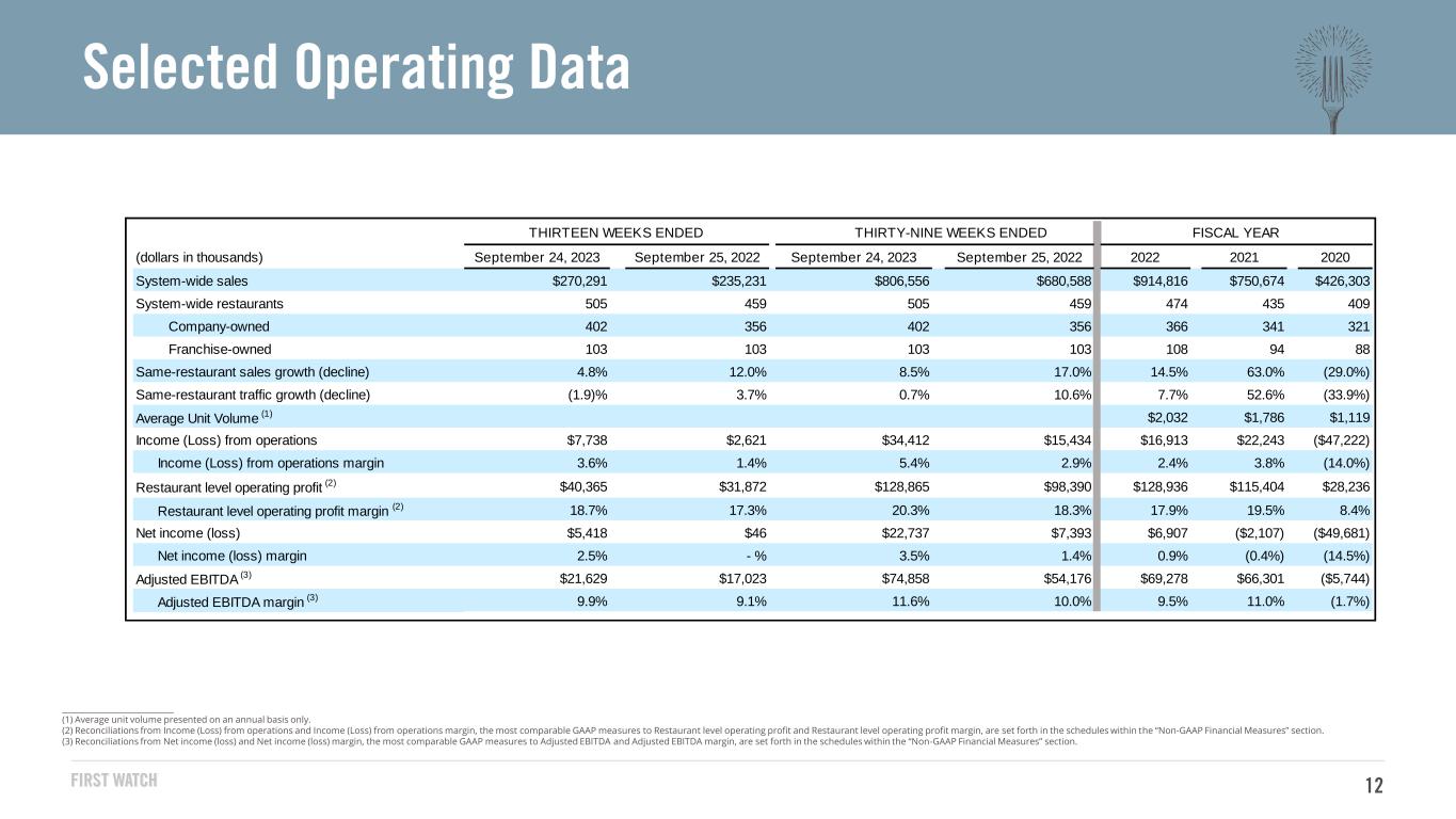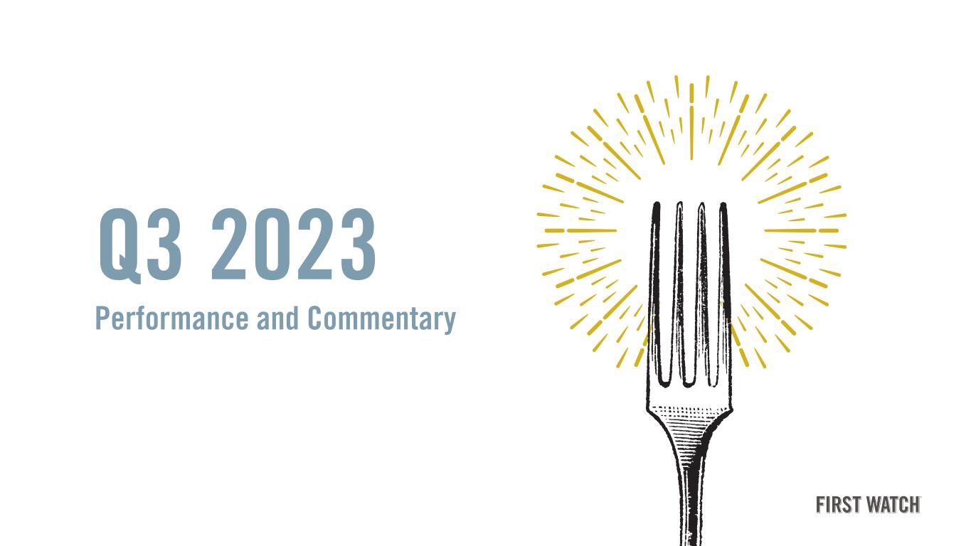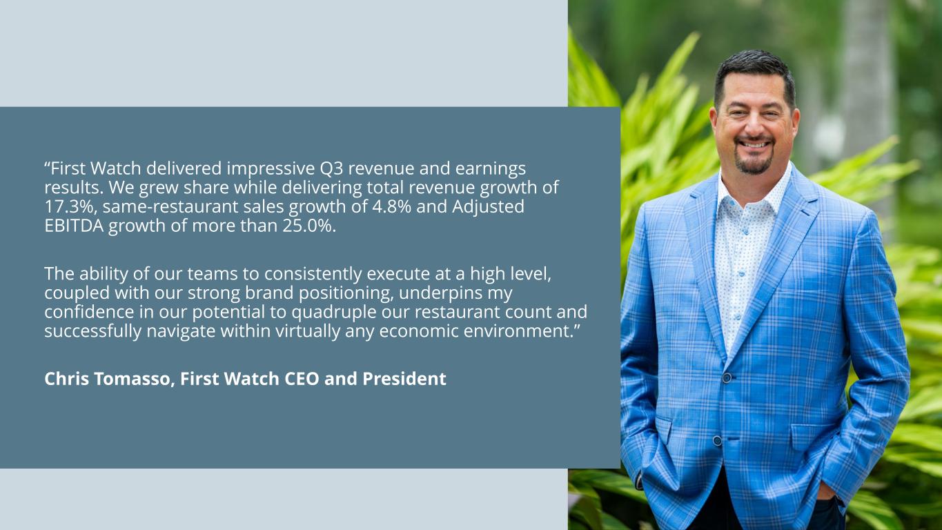“First Watch delivered impressive Q3 revenue and earnings results,” said Chris Tomasso, First Watch CEO and President. “We grew share while delivering total revenue growth of 17.3%, same-restaurant sales growth of 4.8% and Adjusted EBITDA growth of more than 25.0%. The ability of our teams to consistently execute at a high level, coupled with our strong brand positioning, underpins my confidence in our potential to quadruple our restaurant count and successfully navigate within virtually any economic environment.”