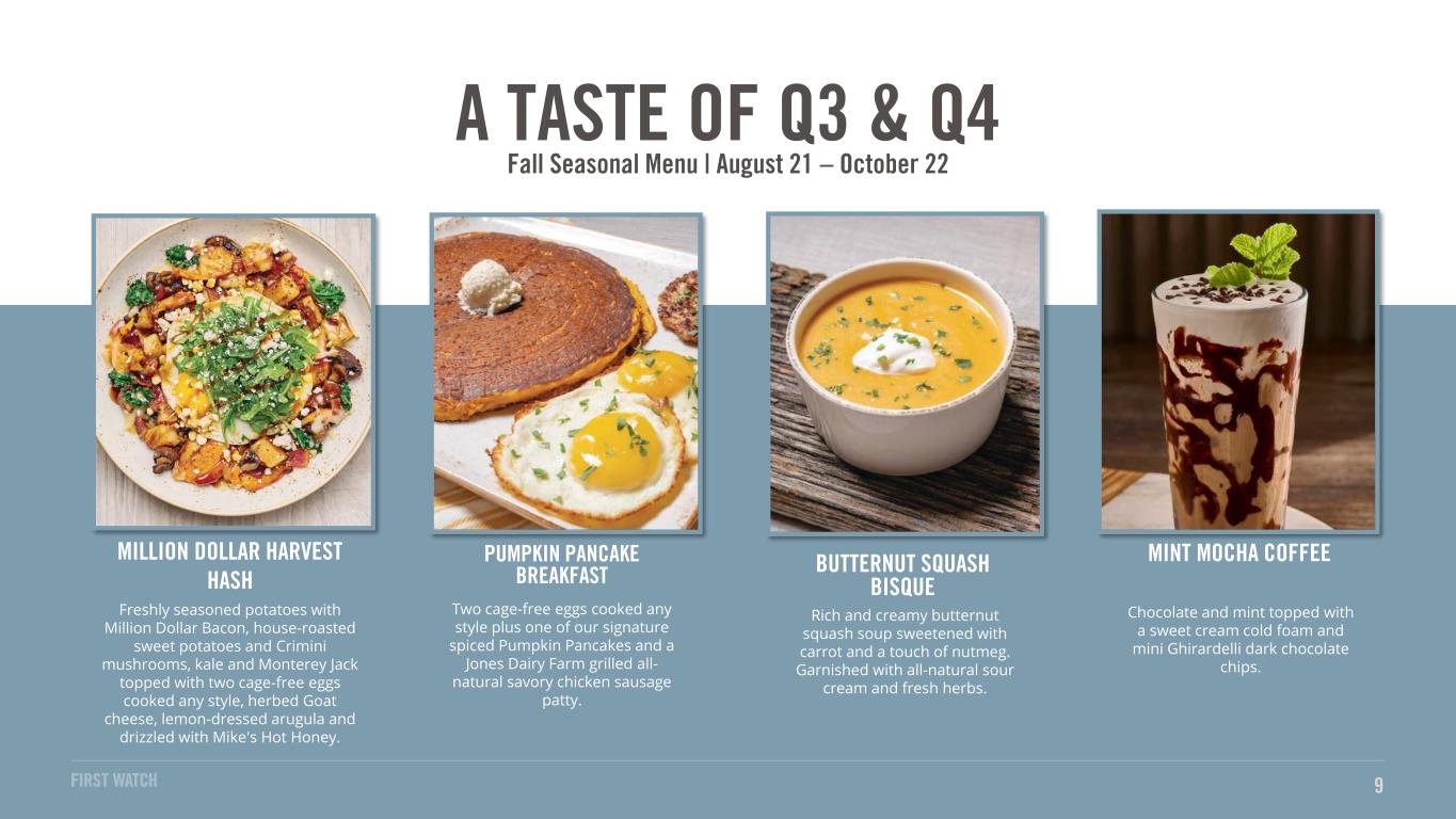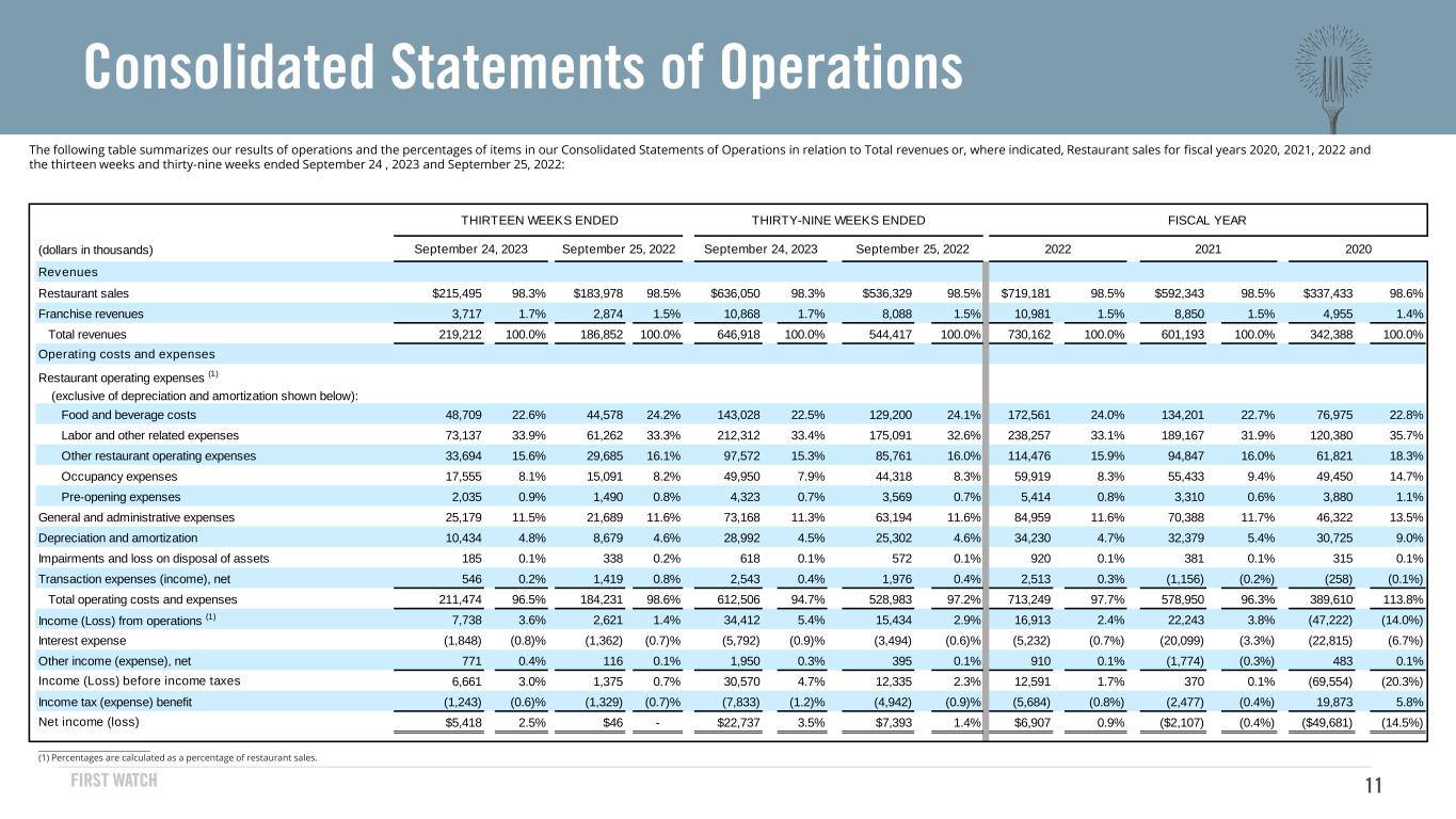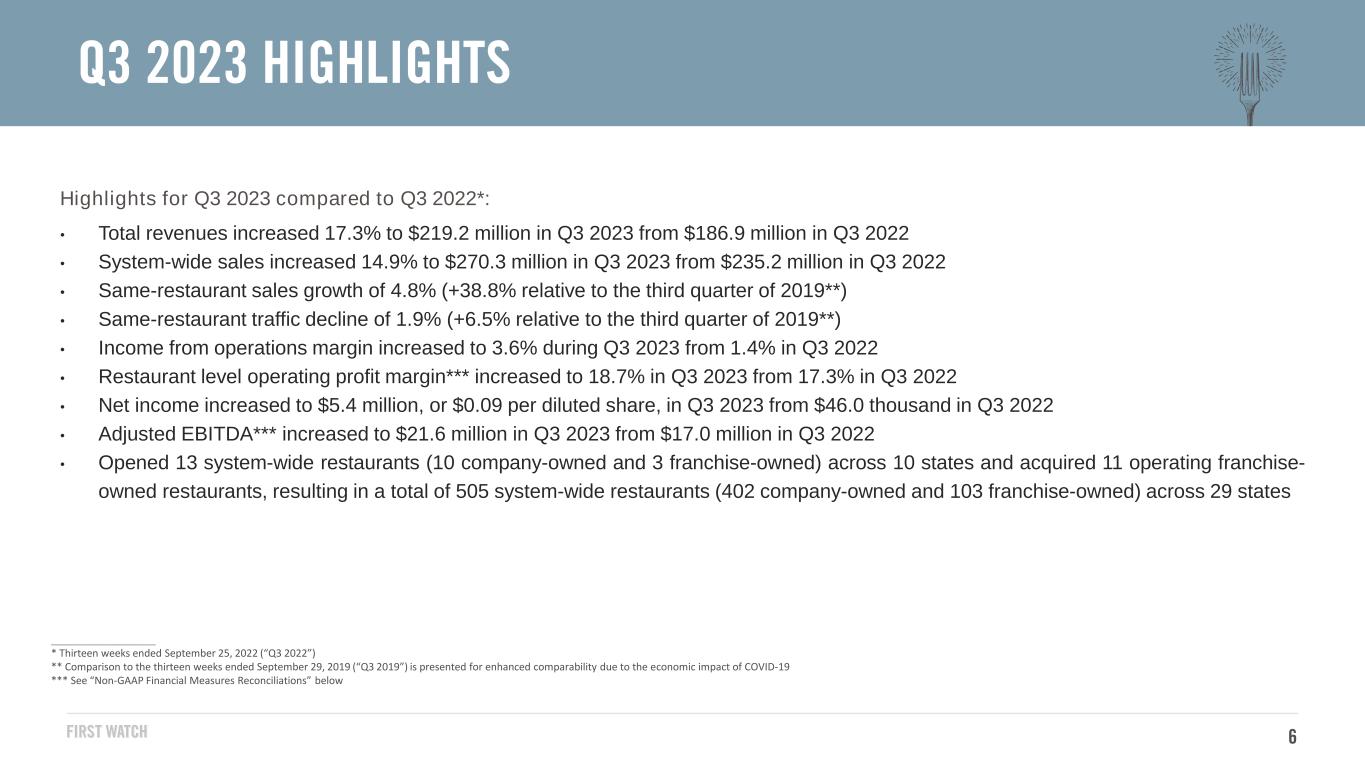 “First Watch delivered impressive Q3 revenue and earnings results,” said Chris Tomasso, First Watch CEO and President. “We grew share while delivering total revenue growth of 17.3%, same-restaurant sales growth of 4.8% and Adjusted EBITDA growth of more than 25.0%. The ability of our teams to consistently execute at a high level, coupled with our strong brand positioning, underpins my confidence in our potential to quadruple our restaurant count and successfully navigate within virtually any economic environment.”