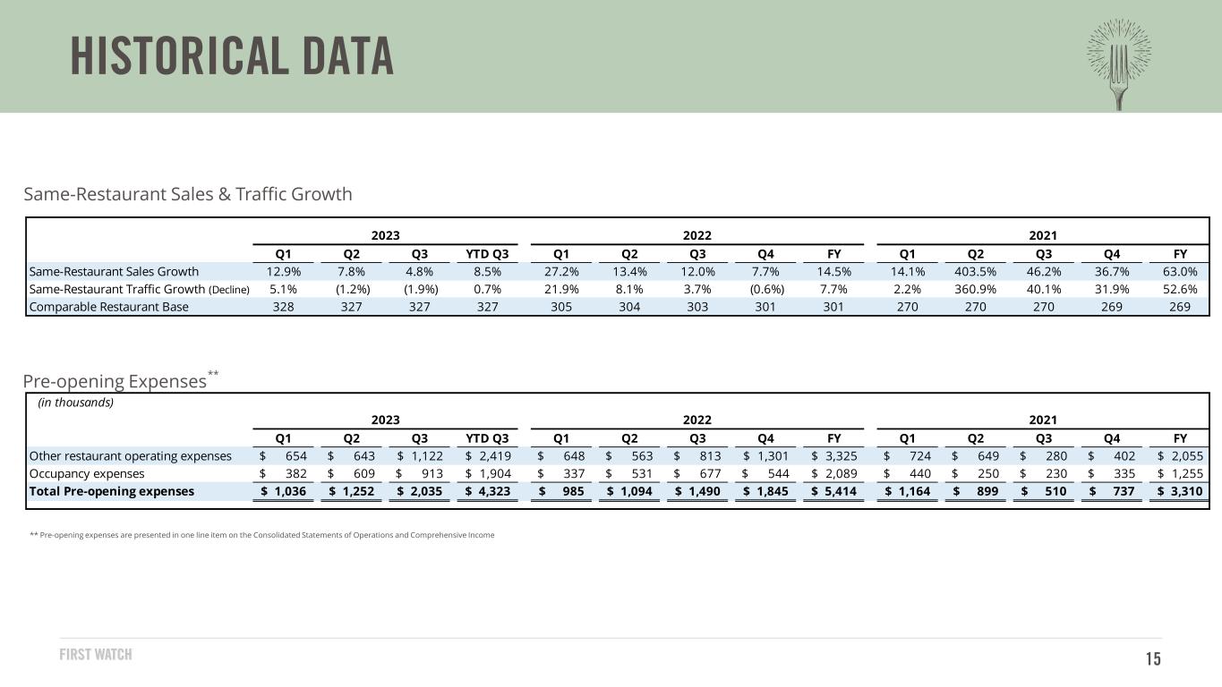 Same-restaurant sales growth: the percentage change in year-over-year restaurant sales (excluding gift card breakage) for the comparable restaurant base, which is defined as the number of company-owned First Watch branded restaurants open for 18 months or longer as of the beginning of the fiscal year (“Comparable Restaurant Base”). For the thirteen weeks ended September 24, 2023 and September 25, 2022, there were 327 restaurants and 303 restaurants, respectively, in our Comparable Restaurant Base.