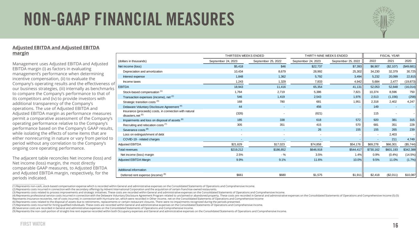 To supplement the consolidated financial statements, which are prepared in accordance with accounting principles generally accepted in the United States of America (“GAAP”), we use the following non-GAAP measures, which present operating results on an adjusted basis: (i) Adjusted EBITDA, (ii) Adjusted EBITDA margin, (iii) Restaurant level operating profit and (iv) Restaurant level operating profit margin. Our presentation of these non-GAAP measures includes isolating the effects of some items that are either nonrecurring in nature or vary from period to period without any correlation to our ongoing core operating performance. These supplemental measures of performance are not required by or presented in accordance with GAAP. Management believes these non-GAAP measures provide investors with additional visibility into our operations, facilitate analysis and comparisons of our ongoing business operations because they exclude items that may not be indicative of our ongoing operating performance, help to identify operational trends and allow for greater transparency with respect to key metrics used by management in our financial and operational decision making. Our non-GAAP measures may not be comparable to similarly titled measures used by other companies and have important limitations as analytical tools. These non-GAAP measures should not be considered in isolation or as substitutes for analysis of our results as reported under GAAP as they may not provide a complete understanding of our performance. These non-GAAP measures should be reviewed in conjunction with our consolidated financial statements prepared in accordance with GAAP.