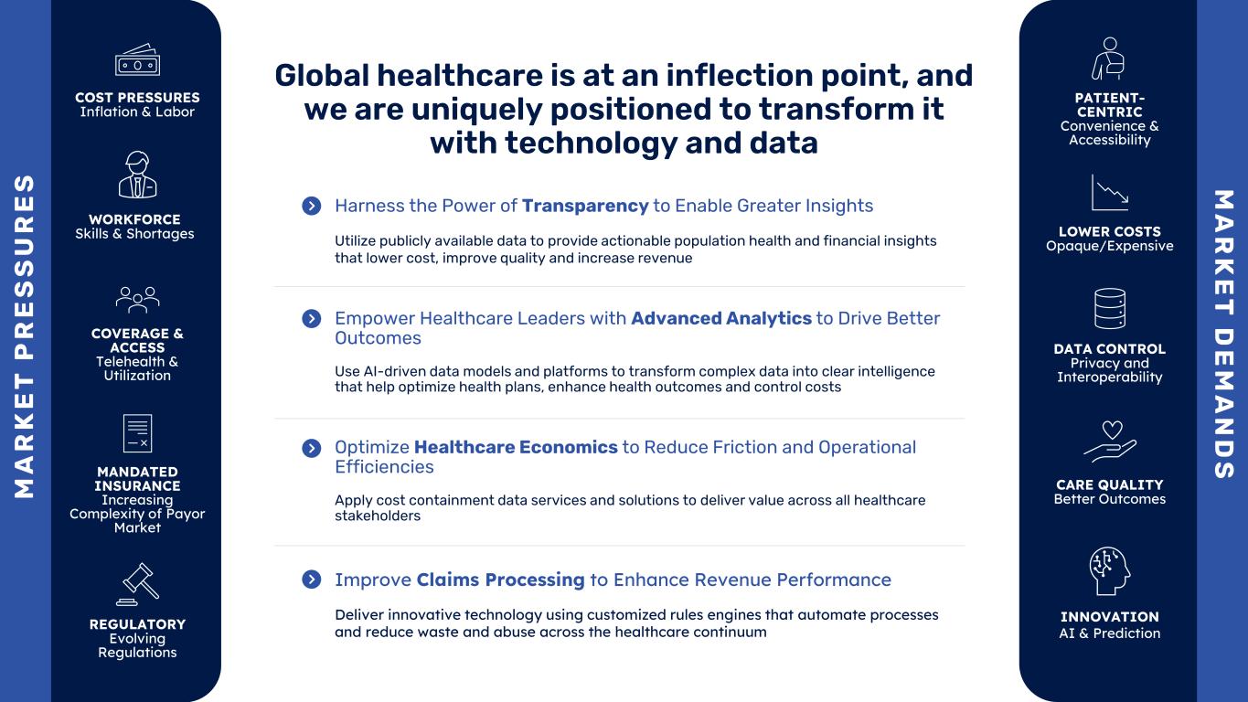 8 Global healthcare is at an inflection point, and we are uniquely positioned to transform it with technology and data Harness the Power of Transparency to Enable Greater Insights Utilize publicly available data to provide actionable population health and financial insights that lower cost, improve quality and increase revenue Empower Healthcare Leaders with Advanced Analytics to Drive Better Outcomes Use AI-driven data models and platforms to transform complex data into clear intelligence that help optimize health plans, enhance health outcomes and control costs Optimize Healthcare Economics to Reduce Friction and Operational Efficiencies Apply cost containment data services and solutions to deliver value across all healthcare stakeholders Improve Claims Processing to Enhance Revenue Performance Deliver innovative technology using customized rules engines that automate processes and reduce waste and abuse across the healthcare continuum M A R K E T P R E S S U R E S COST PRESSURES Inflation & Labor WORKFORCE Skills & Shortages COVERAGE & ACCESS Telehealth & Utilization MANDATED INSURANCE Increasing Complexity of Payor Market REGULATORY Evolving Regulations M A R K E T D E M A N D S PATIENT- CENTRIC Convenience & Accessibility LOWER COSTS Opaque/Expensive DATA CONTROL Privacy and Interoperability CARE QUALITY Better Outcomes INNOVATION AI & Prediction