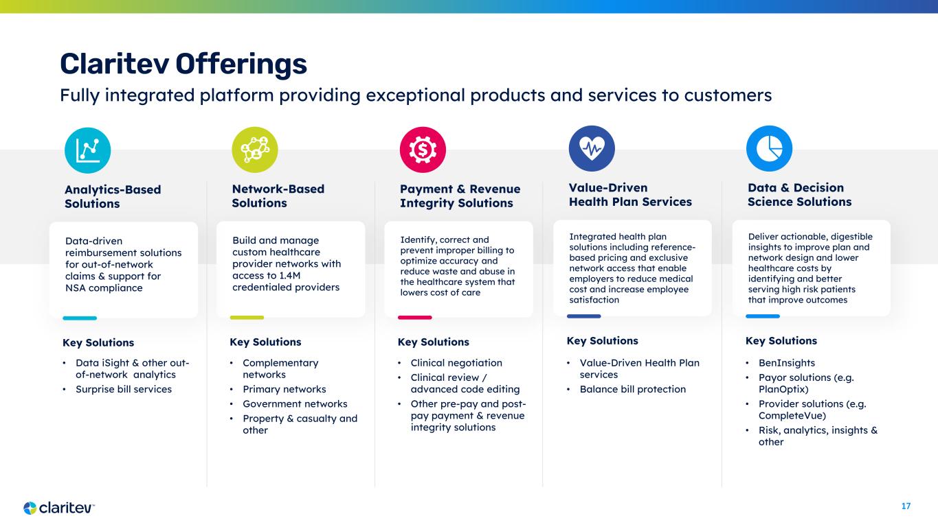 17 Build and manage custom healthcare provider networks with access to 1.4M credentialed providers Data-driven reimbursement solutions for out-of-network claims & support for NSA compliance Identify, correct and prevent improper billing to optimize accuracy and reduce waste and abuse in the healthcare system that lowers cost of care Deliver actionable, digestible insights to improve plan and network design and lower healthcare costs by identifying and better serving high risk patients that improve outcomes Integrated health plan solutions including reference- based pricing and exclusive network access that enable employers to reduce medical cost and increase employee satisfaction Network-Based Solutions Key Solutions • Complementary networks • Primary networks • Government networks • Property & casualty and other Analytics-Based Solutions Key Solutions • Data iSight & other out- of-network analytics • Surprise bill services Payment & Revenue Integrity Solutions Key Solutions • Clinical negotiation • Clinical review / advanced code editing • Other pre-pay and post- pay payment & revenue integrity solutions Data & Decision Science Solutions Key Solutions • BenInsights • Payor solutions (e.g. PlanOptix) • Provider solutions (e.g. CompleteVue) • Risk, analytics, insights & other Value-Driven Health Plan Services Key Solutions • Value-Driven Health Plan services • Balance bill protection Claritev Offerings Fully integrated platform providing exceptional products and services to customers