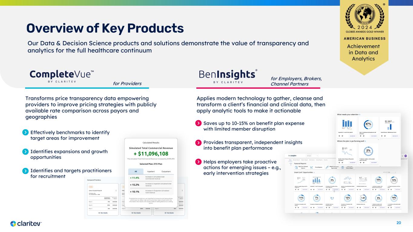 19 Supplementing Claritev’s Broad Existing Offering with New Product Launches and Enhancements Across Multiple Verticals Red denotes items that support our new Vision * Includes Payors & Providers Note: All new products and enhancements deepen expansion efforts into federal and state government markets for all service lines (except VDHP) Product / Enhancement Payors | TPA Brokers | Employers Providers Government Channel Partners International* Analytics State Surprise Bill ProPricer - Dynamic Routing to Negotiations NSA - Secondary Appeal & What If Logic ProPricer - without RBP AI Initiatives to Improve Discounts Network High Performing Network & Network Builder ValuePoint B2B2C MA Network Expansion Specialty Networks High Performing Network Market Expansion P&RI IBR Enhanced Automation ACE for UAE ACE for Oman & KSA ACE for Providers ACE for Qatar P&RI Partnerships (e.g. Signature) Pre-Pay Subro SaaS VDHP Client Reporting Enhancements Virtual Care Expansion Member Concierge Partnership Integration & Expansion (e.g. Lantern) Direct Contracting Expansion D&DS Price Transparency DaaS Plan Optix Utilization Study BenInsights - UX Redesign SaaS Tools – Provider Quality (incl. CompleteVue) BenInsights - Deepen Rx Value Prop BenInsights Partner Program CompleteVue Operational Analytics Black denotes new product launches and enhancements not directly driven by new Vision