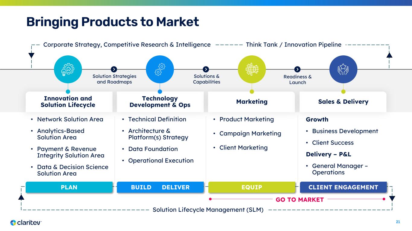21 Bringing Products to Market Innovation and Solution Lifecycle Technology Development & Ops Marketing • Network Solution Area • Analytics-Based Solution Area • Payment & Revenue Integrity Solution Area • Data & Decision Science Solution Area • Technical Definition • Architecture & Platform(s) Strategy • Data Foundation • Operational Execution • Product Marketing • Campaign Marketing • Client Marketing Sales & Delivery Solution Strategies and Roadmaps Solutions & Capabilities Readiness & Launch Growth • Business Development • Client Success Delivery – P&L • General Manager – Operations Corporate Strategy, Competitive Research & Intelligence Think Tank / Innovation Pipeline PLAN BUILD DELIVER EQUIP CLIENT ENGAGEMENT Solution Lifecycle Management (SLM) GO TO MARKET