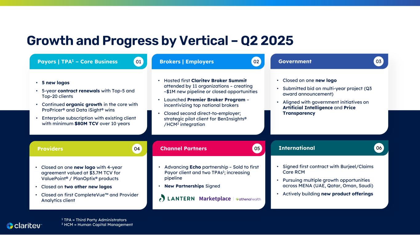 31 Growth and Progress by Vertical – Q2 2025 • 5 new logos • 5-year contract renewals with Top-5 and Top-20 clients • Continued organic growth in the core with ProPricer® and Data iSight® wins • Enterprise subscription with existing client with minimum $80M TCV over 10 years Payors | TPA1 – Core Business 01 • Closed on one new logo • Submitted bid on multi-year project (Q3 award announcement) • Aligned with government initiatives on Artificial Intelligence and Price Transparency Government 03 • Hosted first Claritev Broker Summit attended by 11 organizations – creating ~$1M new pipeline or closed opportunities • Launched Premier Broker Program – incentivizing top national brokers • Closed second direct-to-employer; strategic pilot client for BenInsights® /HCM2 integration Brokers | Employers 02 • Closed on one new logo with 4-year agreement valued at $3.7M TCV for ValuePoint® / PlanOptix® products • Closed on two other new logos • Closed on first CompleteVue and Provider Analytics client Providers 04 • Advancing Echo partnership – Sold to first Payor client and two TPAs1; increasing pipeline • New Partnerships Signed Channel Partners 05 • Signed first contract with Burjeel/Claims Care RCM • Pursuing multiple growth opportunities across MENA (UAE, Qatar, Oman, Saudi) • Actively building new product offerings International 06 1 TPA = Third Party Administrators 2 HCM = Human Capital Management