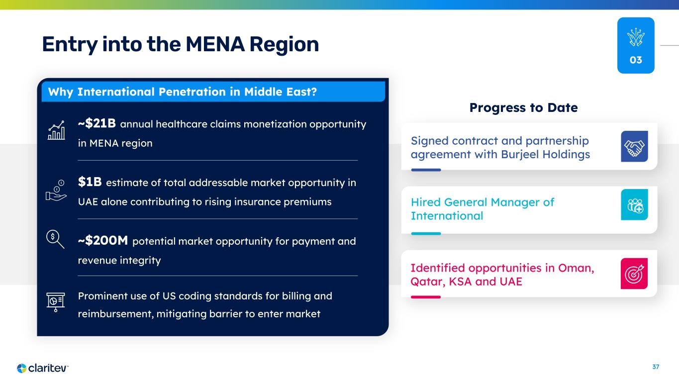 37 Why International Penetration in Middle East? ~$21B annual healthcare claims monetization opportunity in MENA region $1B estimate of total addressable market opportunity in UAE alone contributing to rising insurance premiums ~$200M potential market opportunity for payment and revenue integrity Prominent use of US coding standards for billing and reimbursement, mitigating barrier to enter market 03 Entry into the MENA Region Signed contract and partnership agreement with Burjeel Holdings Hired General Manager of International Progress to Date Identified opportunities in Oman, Qatar, KSA and UAE