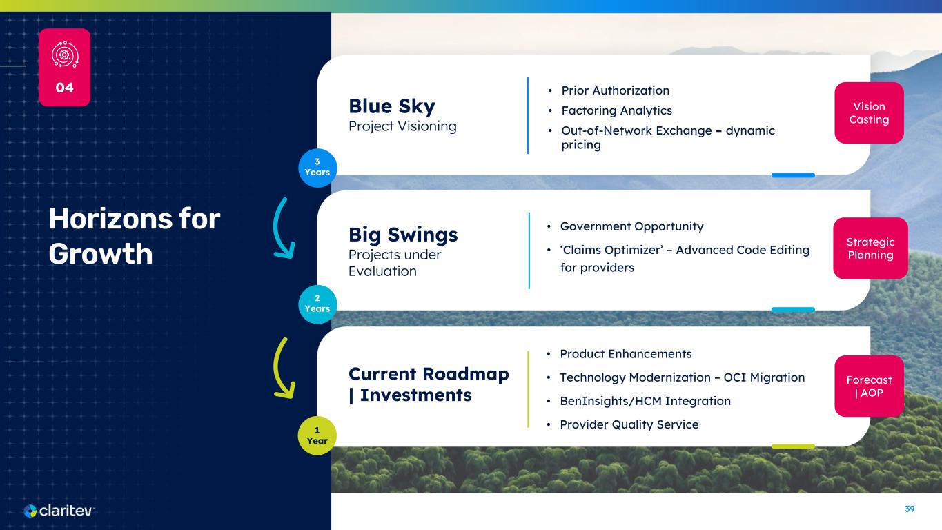 39 Horizons for Growth 1 Year 3 Years 2 Years Current Roadmap | Investments • Product Enhancements • Technology Modernization – OCI Migration • BenInsights/HCM Integration • Provider Quality Service Forecast | AOP Big Swings Projects under Evaluation • Government Opportunity • ‘Claims Optimizer’ – Advanced Code Editing for providers Blue Sky Project Visioning • Prior Authorization • Factoring Analytics • Out-of-Network Exchange – dynamic pricing Strategic Planning Vision Casting 04