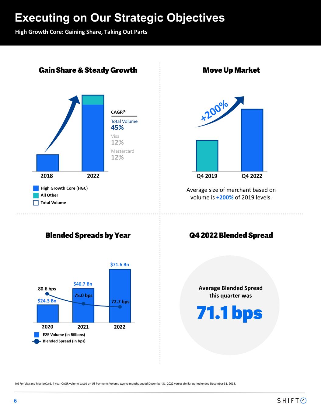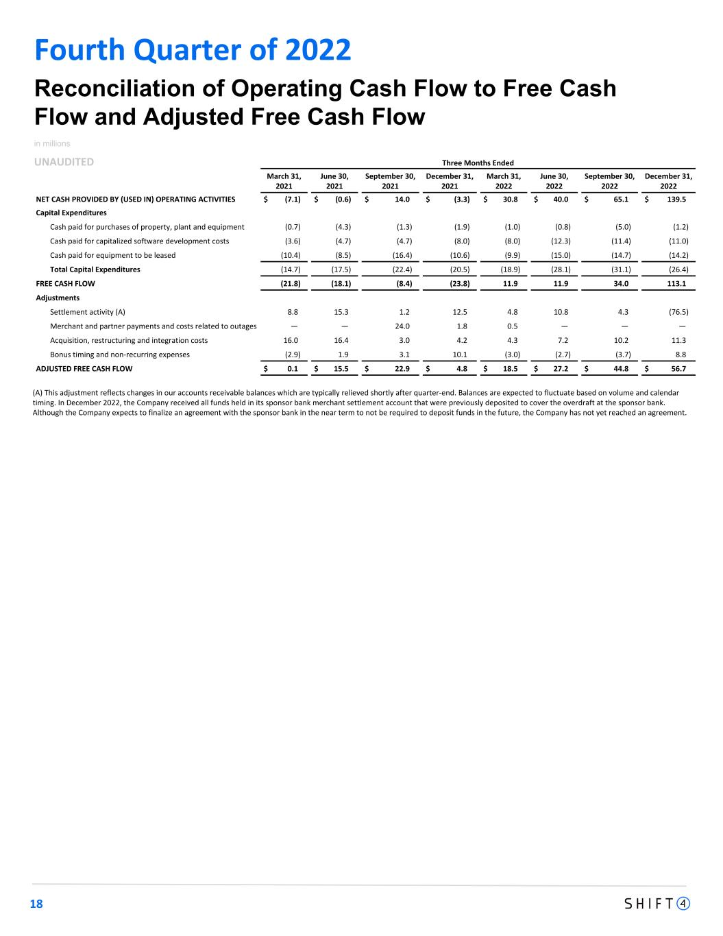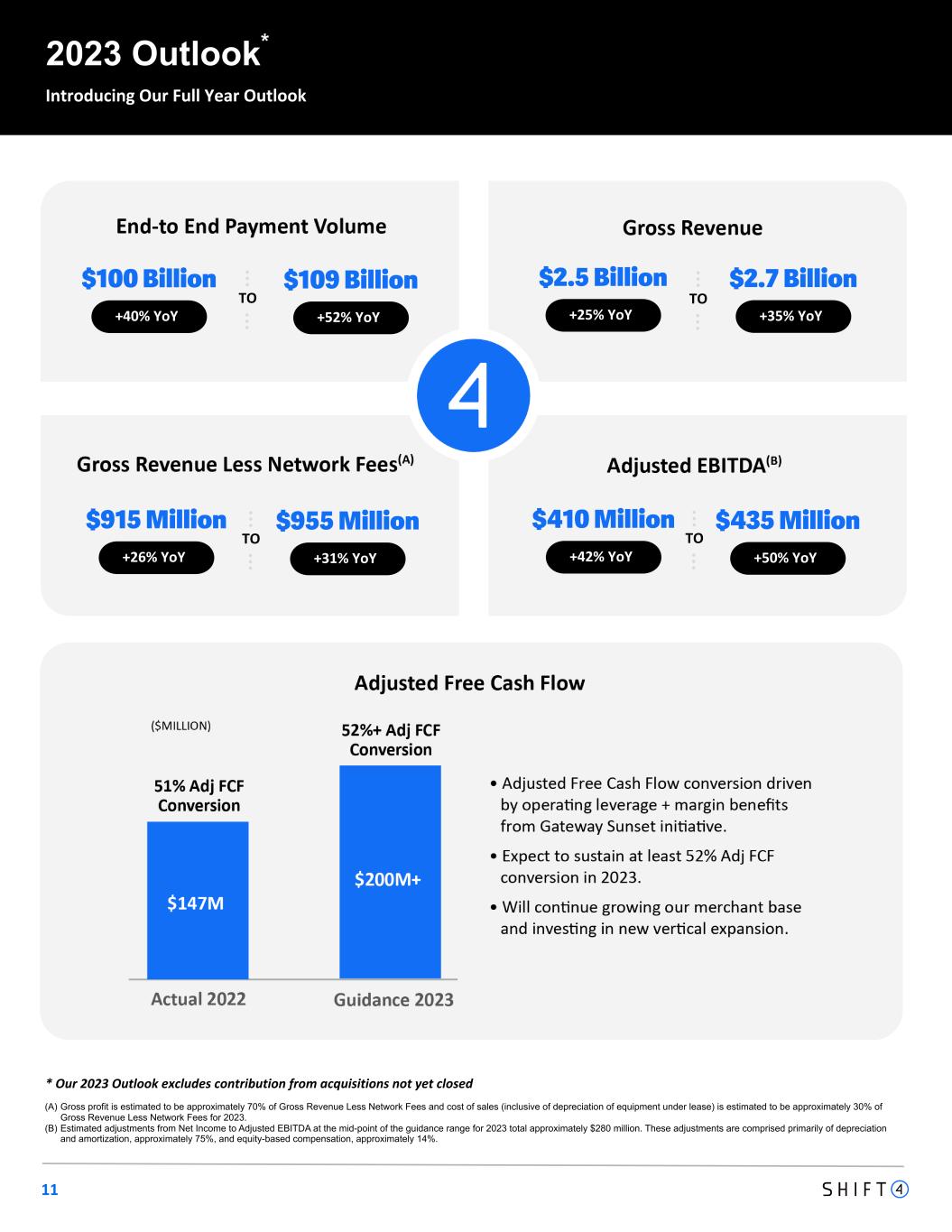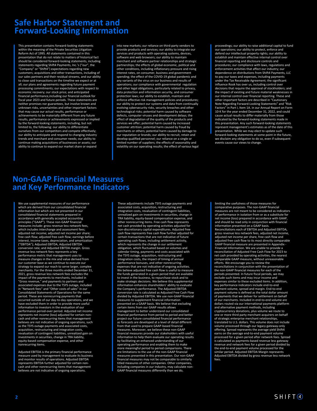 Non-GAAP Financial Measures and Key Performance Indicators Safe Harbor Statement and Forward-Looking Information We use supplemental measures of our performance which are derived from our consolidated financial information but which are not presented in our consolidated financial statements prepared in accordance with generally accepted accounting principles ("GAAP"). These non-GAAP financial measures include: gross revenue less network fees, which includes interchange and assessment fees; adjusted net income; adjusted net income per share; free cash flow; adjusted free cash flow; earnings before interest, income taxes, depreciation, and amortization (“EBITDA”); Adjusted EBITDA, Adjusted EBITDA conversion rate; and Adjusted EBITDA margin. Gross revenue less network fees represents a key performance metric that management uses to measure changes in the mix and value derived from our customer base as we continue to execute our strategy to expand our reach to serve larger, complex merchants. For the three months ended December 31, 2021, gross revenue less network fees excludes the impact of the payments to merchants, included in "Gross revenue," and payments to partners and associated expenses due to the TSYS outage, included in "Network fees" and "Other costs of sales" in our Consolidated Statements of Operations for the same period. These are nonrecurring payments that occurred outside of our day-to-day operations, and we have excluded them in order to provide more useful information to investors in the evaluation of our performance period-over period. Adjusted net income represents net income (loss) adjusted for certain non- cash and other nonrecurring items that management believes are not indicative of ongoing operations, such as the TSYS outage payments and associated costs, acquisition, restructuring and integration costs, revaluation of contingent liabilities, unrealized gain on investments in securities, change in TRA liability, equity-based compensation expense, and other nonrecurring items. Adjusted EBITDA is the primary financial performance measure used by management to evaluate its business and monitor results of operations. Adjusted EBITDA represents EBITDA further adjusted for certain non- cash and other nonrecurring items that management believes are not indicative of ongoing operations. This presentation contains forward-looking statements within the meaning of the Private Securities Litigation Reform Act of 1995. All statements contained in this presentation that do not relate to matters of historical fact should be considered forward-looking statements, including statements regarding Shift4 Payments, Inc.’s (“our”, the “Company” or "Shift4”) expectations regarding new customers; acquisitions and other transactions, including of our sales partners and their residual streams, and our ability to close said transactions on the timeline we expect or at all; our plans and agreements regarding future payment processing commitments; our expectations with respect to economic recovery; our stock price; and anticipated financial performance,including our financial outlook for fiscal year 2023 and future periods. These statements are neither promises nor guarantees, but involve known and unknown risks, uncertainties and other important factors that may cause our actual results, performance or achievements to be materially different from any future results, performance or achievements expressed or implied by the forward-looking statements, including, but not limited to, the following: our ability to differentiate ourselves from our competitors and compete effectively; our ability to anticipate and respond to changing industry trends and merchant and consumer needs; our ability to continue making acquisitions of businesses or assets; our ability to continue to expand our market share or expand These adjustments include TSYS outage payments and associated costs, acquisition, restructuring and integration costs, revaluation of contingent liabilities, unrealized gain on investments in securities, change in TRA liability, equity-based compensation expense, and other nonrecurring items. Free cash flow represents net cash provided by operating activities adjusted for non-discretionary capital expenditures. Adjusted free cash flow represents free cash flow further adjusted for certain transactions that are not indicative of future operating cash flows, including settlement activity, which represents the change in our settlement obligation, which fluctuated based on volumes and calendar timing, payments and costs associated with the TSYS outage, acquisition, restructuring and integration costs, the impact of timing of annual performance bonuses, and other nonrecurring expenses that are not indicative of ongoing activities. We believe adjusted free cash flow is useful to measure the funds generated in a given period that are available to invest in the business, to repurchase stock and to make strategic decisions. We believe this supplemental information enhances shareholders’ ability to evaluate the Company’s performance. The Adjusted EBITDA conversion rate is calculated as Adjusted Free Cash Flow divided by Adjusted EBITDA. We use non-GAAP financial measures to supplement financial information presented on a GAAP basis. We believe that excluding certain items from our GAAP results allows management to better understand our consolidated financial performance from period to period and better project our future consolidated financial performance as forecasts are developed at a level of detail different from that used to prepare GAAP-based financial measures. Moreover, we believe these non-GAAP financial measures provide our stakeholders with useful information to help them evaluate our operating results by facilitating an enhanced understanding of our operating performance and enabling them to make more meaningful period to period comparisons. There are limitations to the use