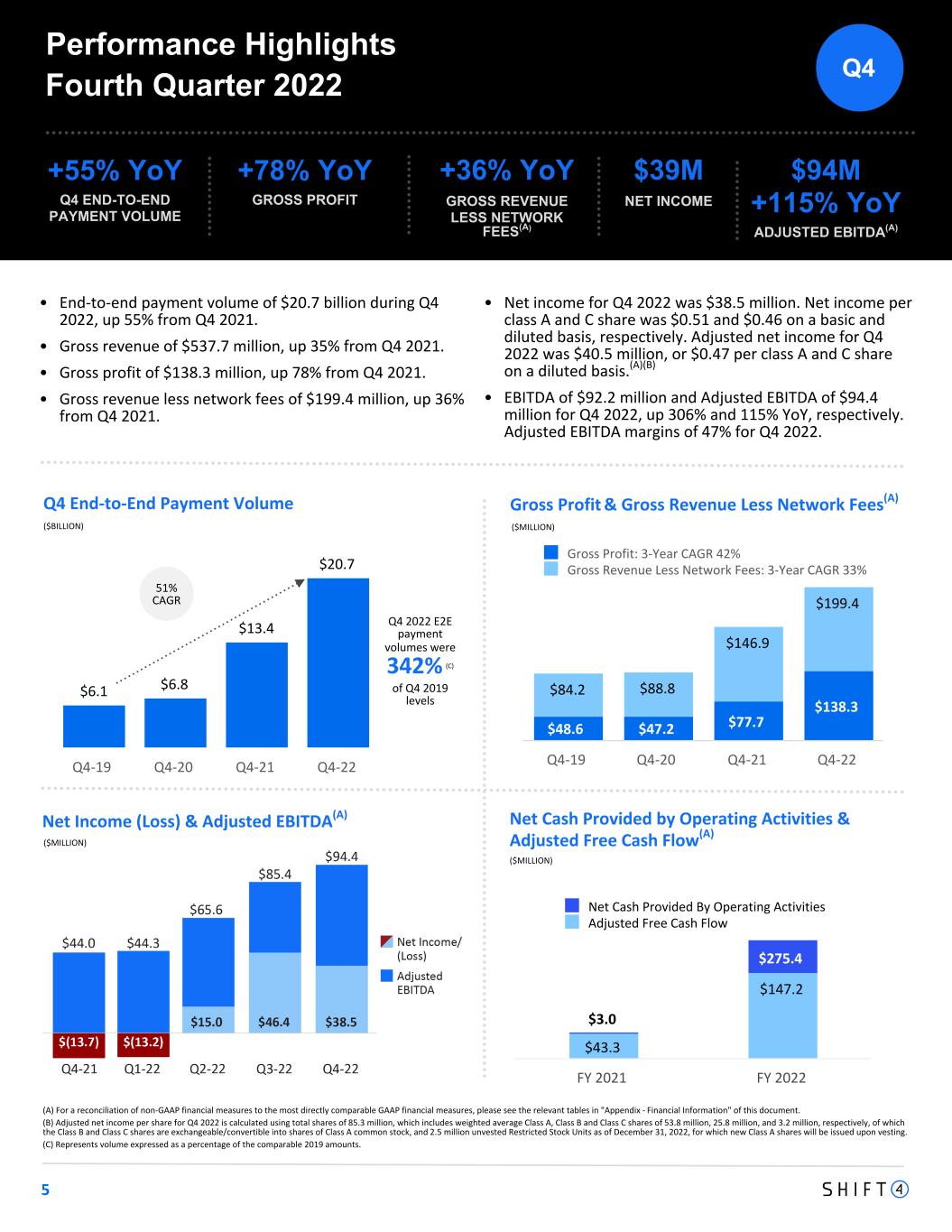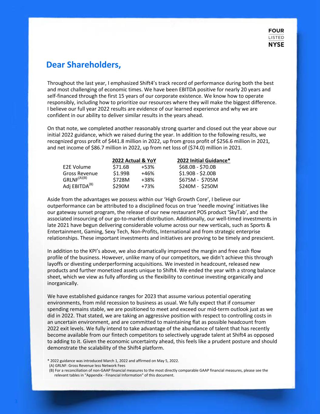 Dear Shareholders, 3 Throughout the last year, I emphasized Shift4’s track record of performance during both the best and most challenging of economic times. We have been EBITDA positive for nearly 20 years and self-financed through the first 15 years of our corporate existence. We know how to operate responsibly, including how to prioritize our resources where they will make the biggest difference. I believe our full year 2022 results are evidence of our learned experience and why we are confident in our ability to deliver similar results in the years ahead. On that note, we completed another reasonably strong quarter and closed out the year above our initial 2022 guidance, which we raised during the year. In addition to the following results, we recognized gross profit of $441.8 million in 2022, up from gross profit of $256.6 million in 2021, and net income of $86.7 million in 2022, up from net loss of ($74.0) million in 2021. 2022 Actual & YoY 2022 Initial Guidance* E2E Volume $71.6B +53% $68.0B - $70.0B Gross Revenue $1.99B +46% $1.90B - $2.00B GRLNF(A)(B) $728M +38% $675M - $705M Adj EBITDA(B) $290M +73% $240M - $250M Aside from the advantages we possess within our ‘High Growth Core’, I believe our outperformance can be attributed to a disciplined focus on true ‘needle moving’ initiatives like our gateway sunset program, the release of our new restaurant POS product ‘SkyTab’, and the associated insourcing of our go-to-market distribution. Additionally, our well-timed investments in late 2021 have begun delivering considerable volume across our new verticals, such as Sports & Entertainment, Gaming, Sexy Tech, Non-Profits, International and from strategic enterprise relationships. These important investments and initiatives are proving to be timely and prescient. In addition to the KPI’s above, we also dramatically improved the margin and free cash flow profile of the business. However, unlike many of our competitors, we didn’t achieve this through layoffs or divesting underperforming acquisitions. We invested in headcount, released new products and further monetized assets unique to Shift4. We ended the year with a strong balance sheet, which we view as fully affording us the flexibility to continue investing organically and inorganically. We have established guidance ranges for 2023 that assume various potential operating environments, from mild recession to business as usual. We fully expect that if consumer spending remains stable, we are positioned to meet and exceed our mid-term outlook just as we did in 2022. That stated, we are taking an aggressive position with respect to controlling costs in an uncertain environment, and are committed to maintaining flat as possible headcount from 2022 exit levels. We fully intend to take advantage of the abundance of talent that has recently become available from our fintech competitors to selectively upgrade talent at Shift4 as opposed to adding to it. Given the economic uncertainty ahead, this feels like a prudent posture and should demonstrate the scalability of the Shift4 platform. * 2022 guidance was introduced March 1, 2022 and affirmed on May 5, 2022. (A) GRLNF: Gross Revenue less Network Fees (B) For a reconciliation of non-GAAP financial measures to the most directly comparable GAAP financial measures, please see the relevant tables in "Appendix - Financial Information" of this document.