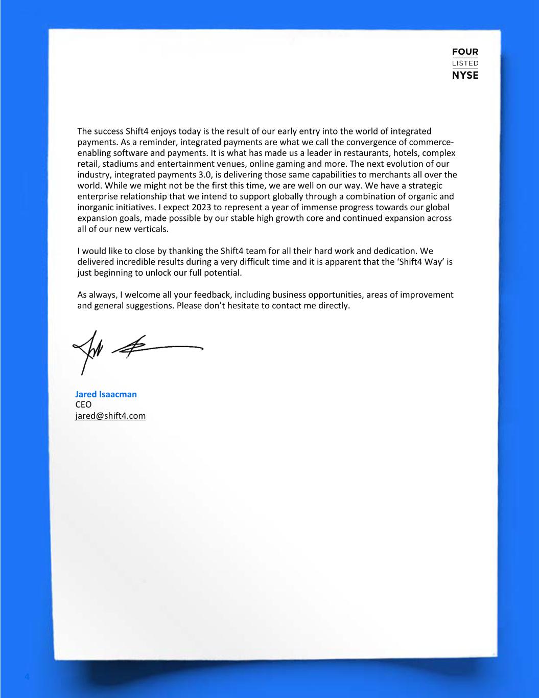 4 Jared Isaacman CEO jared@shift4.com The success Shift4 enjoys today is the result of our early entry into the world of integrated payments. As a reminder, integrated payments are what we call the convergence of commerce- enabling software and payments. It is what has made us a leader in restaurants, hotels, complex retail, stadiums and entertainment venues, online gaming and more. The next evolution of our industry, integrated payments 3.0, is delivering those same capabilities to merchants all over the world. While we might not be the first this time, we are well on our way. We have a strategic enterprise relationship that we intend to support globally through a combination of organic and inorganic initiatives. I expect 2023 to represent a year of immense progress towards our global expansion goals, made possible by our stable high growth core and continued expansion across all of our new verticals. I would like to close by thanking the Shift4 team for all their hard work and dedication. We delivered incredible results during a very difficult time and it is apparent that the ‘Shift4 Way’ is just beginning to unlock our full potential. As always, I welcome all your feedback, including business opportunities, areas of improvement and general suggestions. Please don’t hesitate to contact me directly.