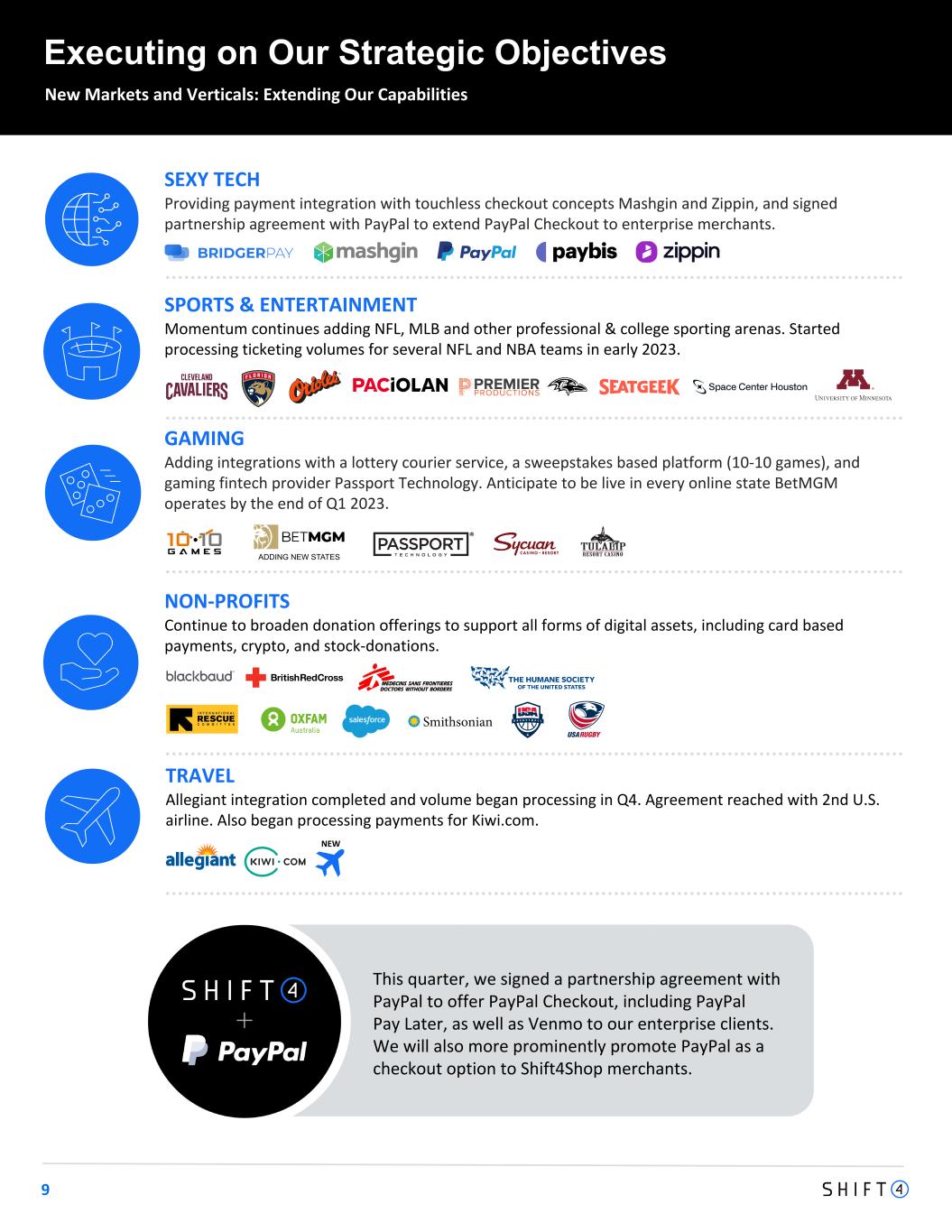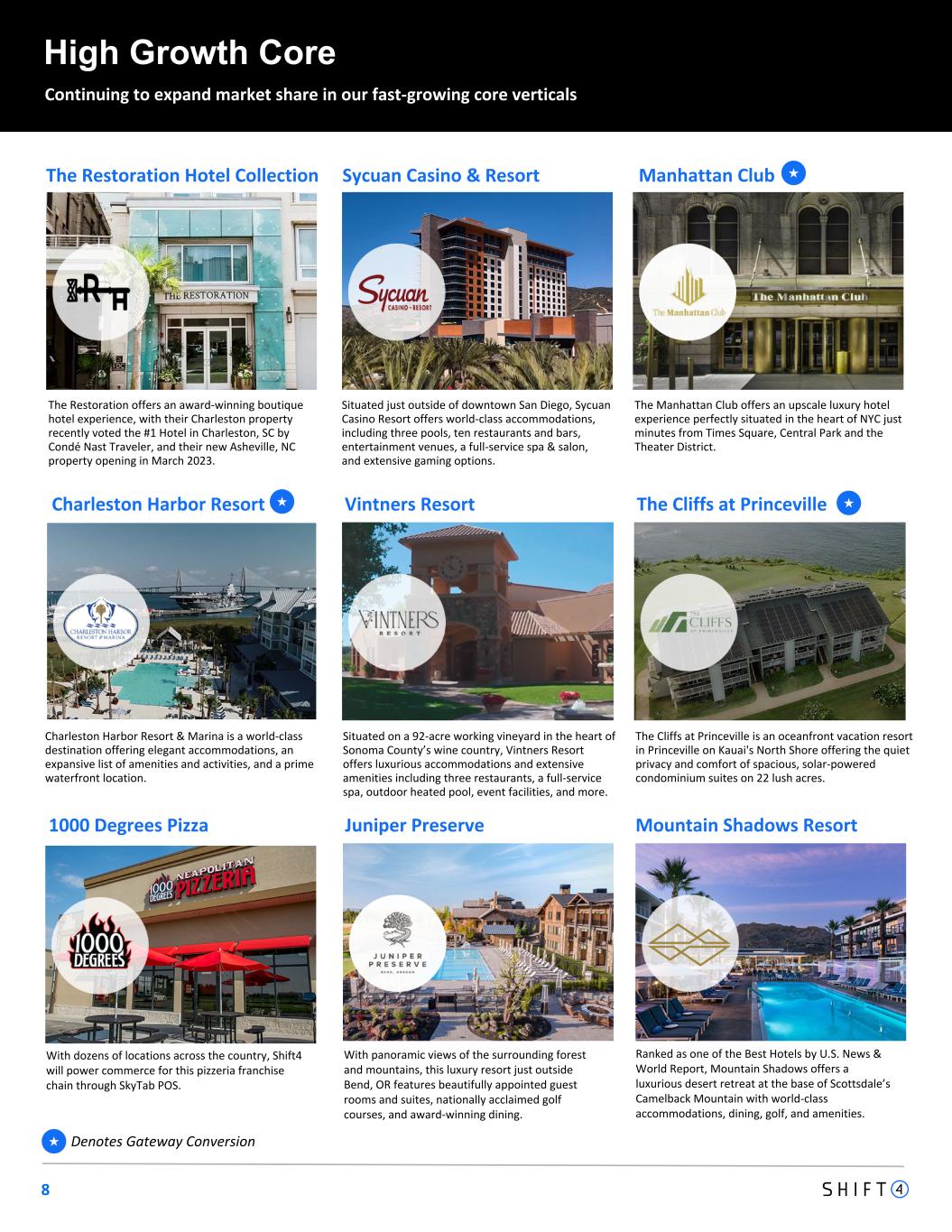 8 High Growth Core Continuing to expand market share in our fast-growing core verticals Denotes Gateway Conversion★ Situated just outside of downtown San Diego, Sycuan Casino Resort offers world-class accommodations, including three pools, ten restaurants and bars, entertainment venues, a full-service spa & salon, and extensive gaming options. Sycuan Casino & Resort The Manhattan Club offers an upscale luxury hotel experience perfectly situated in the heart of NYC just minutes from Times Square, Central Park and the Theater District. Manhattan Club Charleston Harbor Resort & Marina is a world-class destination offering elegant accommodations, an expansive list of amenities and activities, and a prime waterfront location. Charleston Harbor Resort Situated on a 92-acre working vineyard in the heart of Sonoma County’s wine country, Vintners Resort offers luxurious accommodations and extensive amenities including three restaurants, a full-service spa, outdoor heated pool, event facilities, and more. Vintners Resort The Cliffs at Princeville is an oceanfront vacation resort in Princeville on Kauai's North Shore offering the quiet privacy and comfort of spacious, solar-powered condominium suites on 22 lush acres. The Cliffs at Princeville The Restoration offers an award-winning boutique hotel experience, with their Charleston property recently voted the #1 Hotel in Charleston, SC by Condé Nast Traveler, and their new Asheville, NC property opening in March 2023. The Restoration Hotel Collection ★ ★ ★ Juniper Preserve Mountain Shadows Resort1000 Degrees Pizza With dozens of locations across the country, Shift4 will power commerce for this pizzeria franchise chain through SkyTab POS. With panoramic views of the surrounding forest and mountains, this luxury resort just outside Bend, OR features beautifully appointed guest rooms and suites, nationally acclaimed golf courses, and award-winning dining. Ranked as one of the Best Hotels by U.S. News & World Report, Mountain Shadows offers a luxurious desert retreat at the base of Scottsdale’s Camelback Mountain with world-class accommodations, dining, golf, and amenities.