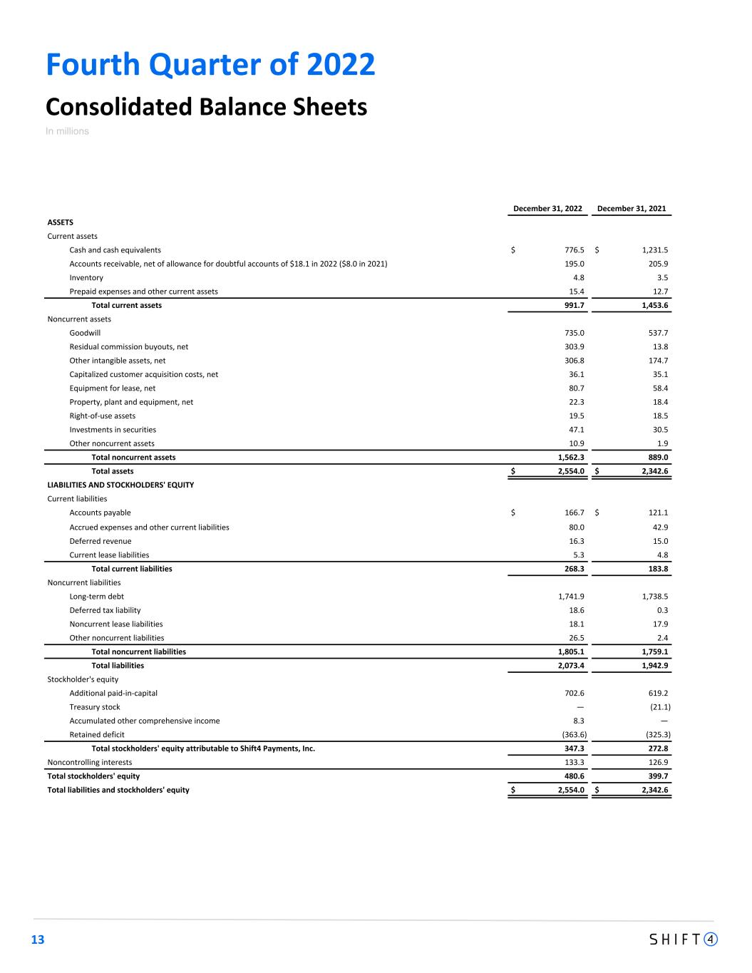 13 Fourth Quarter of 2022 Consolidated Balance Sheets In millions December 31, 2022 December 31, 2021 ASSETS Current assets Cash and cash equivalents $ 776.5 $ 1,231.5 Accounts receivable, net of allowance for doubtful accounts of $18.1 in 2022 ($8.0 in 2021) 195.0 205.9 Inventory 4.8 3.5 Prepaid expenses and other current assets 15.4 12.7 Total current assets 991.7 1,453.6 Noncurrent assets Goodwill 735.0 537.7 Residual commission buyouts, net 303.9 13.8 Other intangible assets, net 306.8 174.7 Capitalized customer acquisition costs, net 36.1 35.1 Equipment for lease, net 80.7 58.4 Property, plant and equipment, net 22.3 18.4 Right-of-use assets 19.5 18.5 Investments in securities 47.1 30.5 Other noncurrent assets 10.9 1.9 Total noncurrent assets 1,562.3 889.0 Total assets $ 2,554.0 $ 2,342.6 LIABILITIES AND STOCKHOLDERS' EQUITY Current liabilities Accounts payable $ 166.7 $ 121.1 Accrued expenses and other current liabilities 80.0 42.9 Deferred revenue 16.3 15.0 Current lease liabilities 5.3 4.8 Total current liabilities 268.3 183.8 Noncurrent liabilities Long-term debt 1,741.9 1,738.5 Deferred tax liability 18.6 0.3 Noncurrent lease liabilities 18.1 17.9 Other noncurrent liabilities 26.5 2.4 Total noncurrent liabilities 1,805.1 1,759.1 Total liabilities 2,073.4 1,942.9 Stockholder's equity Additional paid-in-capital 702.6 619.2 Treasury stock — (21.1) Accumulated other comprehensive income 8.3 — Retained deficit (363.6) (325.3) Total stockholders' equity attributable to Shift4 Payments, Inc. 347.3 272.8 Noncontrolling interests 133.3 126.9 Total stockholders' equity 480.6 399.7 Total liabilities and stockholders' equity $ 2,554.0 $ 2,342.6