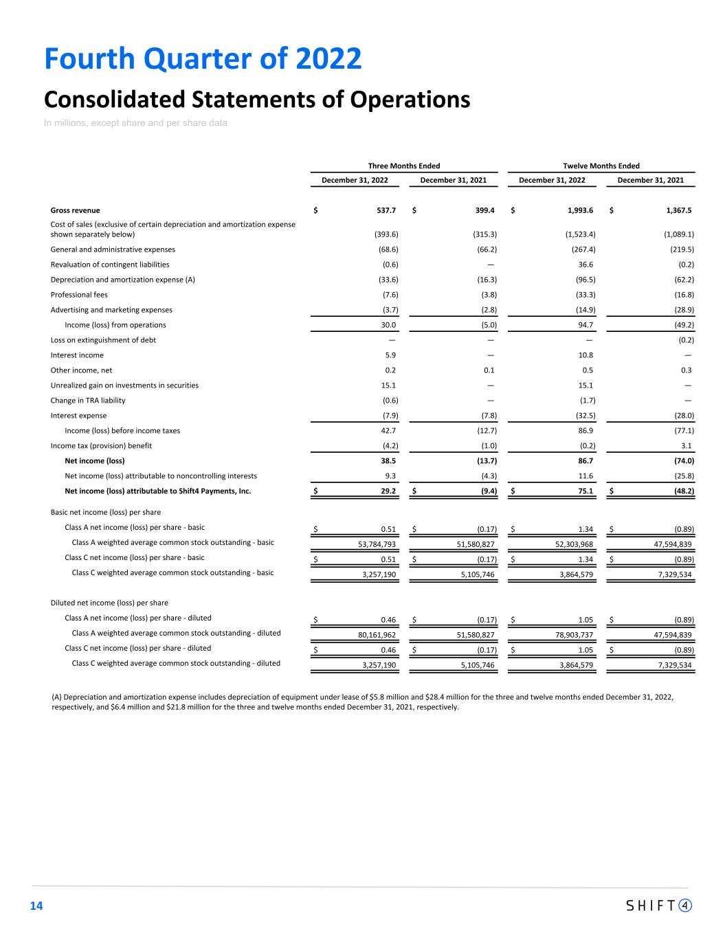 14 Fourth Quarter of 2022 Consolidated Statements of Operations In millions, except share and per share data Three Months Ended Twelve Months Ended December 31, 2022 December 31, 2021 December 31, 2022 December 31, 2021 Gross revenue $ 537.7 $ 399.4 $ 1,993.6 $ 1,367.5 Cost of sales (exclusive of certain depreciation and amortization expense shown separately below) (393.6) (315.3) (1,523.4) (1,089.1) General and administrative expenses (68.6) (66.2) (267.4) (219.5) Revaluation of contingent liabilities (0.6) — 36.6 (0.2) Depreciation and amortization expense (A) (33.6) (16.3) (96.5) (62.2) Professional fees (7.6) (3.8) (33.3) (16.8) Advertising and marketing expenses (3.7) (2.8) (14.9) (28.9) Income (loss) from operations 30.0 (5.0) 94.7 (49.2) Loss on extinguishment of debt — — — (0.2) Interest income 5.9 — 10.8 — Other income, net 0.2 0.1 0.5 0.3 Unrealized gain on investments in securities 15.1 — 15.1 — Change in TRA liability (0.6) — (1.7) — Interest expense (7.9) (7.8) (32.5) (28.0) Income (loss) before income taxes 42.7 (12.7) 86.9 (77.1) Income tax (provision) benefit (4.2) (1.0) (0.2) 3.1 Net income (loss) 38.5 (13.7) 86.7 (74.0) Net income (loss) attributable to noncontrolling interests 9.3 (4.3) 11.6 (25.8) Net income (loss) attributable to Shift4 Payments, Inc. $ 29.2 $ (9.4) $ 75.1 $ (48.2) Basic net income (loss) per share Class A net income (loss) per share - basic $ 0.51 $ (0.17) $ 1.34 $ (0.89) Class A weighted average common stock outstanding - basic 53,784,793 51,580,827 52,303,968 47,594,839 Class C net income (loss) per share - basic $ 0.51 $ (0.17) $ 1.34 $ (0.89) Class C weighted average common stock outstanding - basic 3,257,190 5,105,746 3,864,579 7,329,534 Diluted net income (loss) per share Class A net income (loss) per share - diluted $ 0.46 $ (0.17) $ 1.05 $ (0.89) Class A weighted average common stock outstanding - diluted 80,161,962 51,580,827 78,903,737 47,594,839 Class C net income (loss) per share - diluted $ 0.46 $ (0.17) $ 1.05 $ (0.89) Class C weighted average common stock outstanding - diluted 3,257,190 5,105,746 3,864,579 7,329,534 (A) Depreciation and amortization expense includes depreciation of equipment under lease of $5.8 million and $28.4 million for the three and twelve months ended December 31, 2022, respectively, and $6.4 million and $21.8 million for the three and twelve months ended December 31, 2021, respectively.