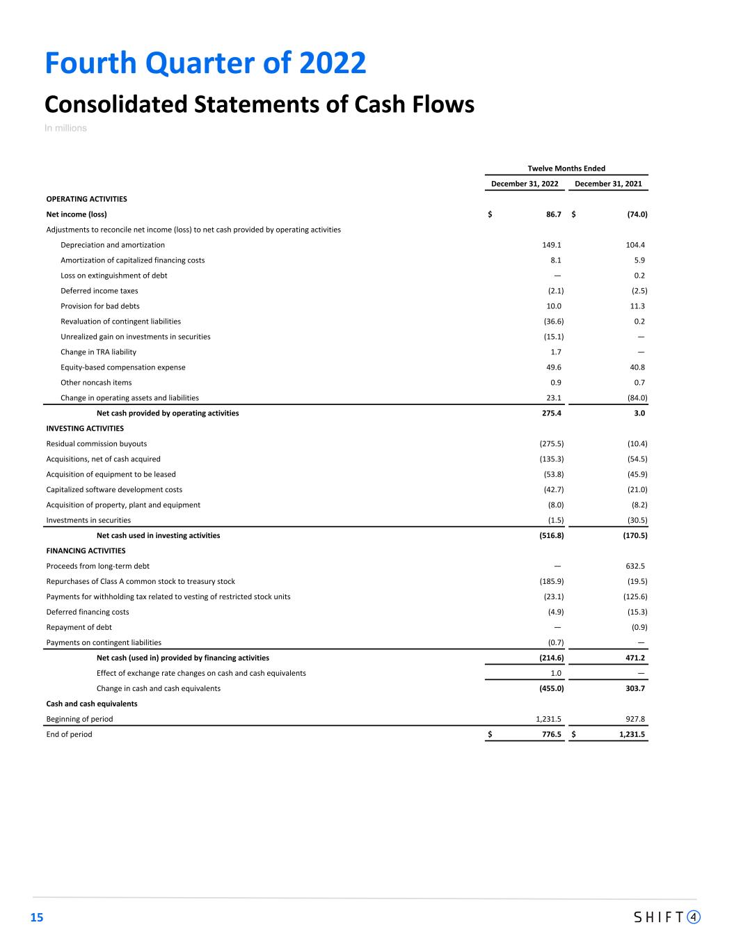 Fourth Quarter of 2022 15 Consolidated Statements of Cash Flows In millions Twelve Months Ended December 31, 2022 December 31, 2021 OPERATING ACTIVITIES Net income (loss) $ 86.7 $ (74.0) Adjustments to reconcile net income (loss) to net cash provided by operating activities Depreciation and amortization 149.1 104.4 Amortization of capitalized financing costs 8.1 5.9 Loss on extinguishment of debt — 0.2 Deferred income taxes (2.1) (2.5) Provision for bad debts 10.0 11.3 Revaluation of contingent liabilities (36.6) 0.2 Unrealized gain on investments in securities (15.1) — Change in TRA liability 1.7 — Equity-based compensation expense 49.6 40.8 Other noncash items 0.9 0.7 Change in operating assets and liabilities 23.1 (84.0) Net cash provided by operating activities 275.4 3.0 INVESTING ACTIVITIES Residual commission buyouts (275.5) (10.4) Acquisitions, net of cash acquired (135.3) (54.5) Acquisition of equipment to be leased (53.8) (45.9) Capitalized software development costs (42.7) (21.0) Acquisition of property, plant and equipment (8.0) (8.2) Investments in securities (1.5) (30.5) Net cash used in investing activities (516.8) (170.5) FINANCING ACTIVITIES Proceeds from long-term debt — 632.5 Repurchases of Class A common stock to treasury stock (185.9) (19.5) Payments for withholding tax related to vesting of restricted stock units (23.1) (125.6) Deferred financing costs (4.9) (15.3) Repayment of debt — (0.9) Payments on contingent liabilities (0.7) — Net cash (used in) provided by financing activities (214.6) 471.2 Effect of exchange rate changes on cash and cash equivalents 1.0 — Change in cash and cash equivalents (455.0) 303.7 Cash and cash equivalents Beginning of period 1,231.5 927.8 End of period $ 776.5 $ 1,231.5