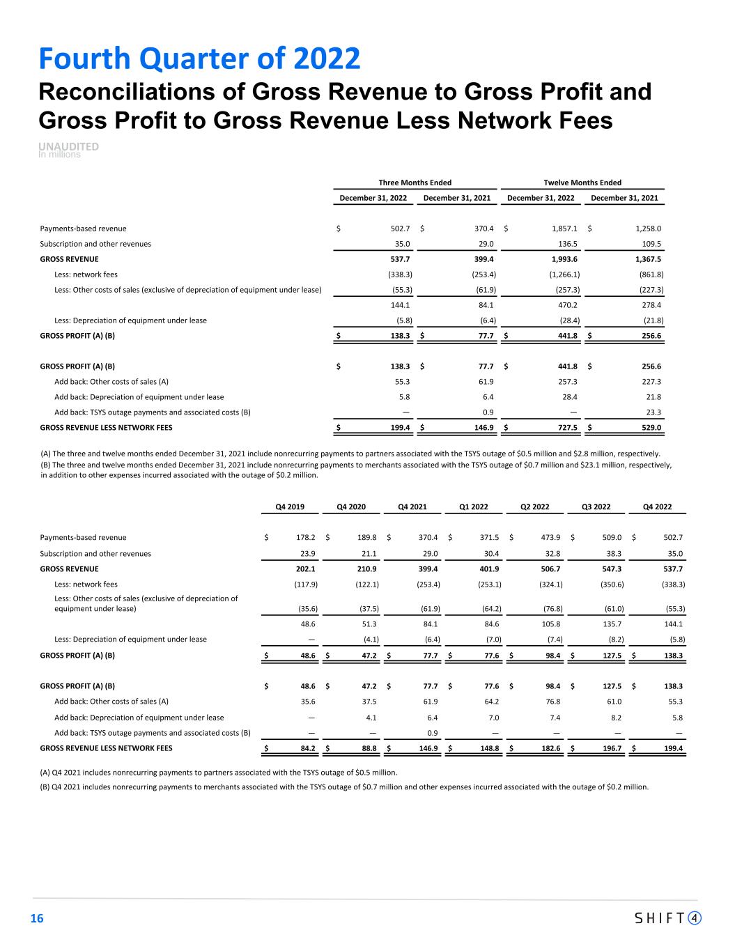 Fourth Quarter of 2022 Reconciliations of Gross Revenue to Gross Profit and Gross Profit to Gross Revenue Less Network Fees UNAUDITED In millions Three Months Ended Twelve Months Ended December 31, 2022 December 31, 2021 December 31, 2022 December 31, 2021 Payments-based revenue $ 502.7 $ 370.4 $ 1,857.1 $ 1,258.0 Subscription and other revenues 35.0 29.0 136.5 109.5 GROSS REVENUE 537.7 399.4 1,993.6 1,367.5 Less: network fees (338.3) (253.4) (1,266.1) (861.8) Less: Other costs of sales (exclusive of depreciation of equipment under lease) (55.3) (61.9) (257.3) (227.3) 144.1 84.1 470.2 278.4 Less: Depreciation of equipment under lease (5.8) (6.4) (28.4) (21.8) GROSS PROFIT (A) (B) $ 138.3 $ 77.7 $ 441.8 $ 256.6 GROSS PROFIT (A) (B) $ 138.3 $ 77.7 $ 441.8 $ 256.6 Add back: Other costs of sales (A) 55.3 61.9 257.3 227.3 Add back: Depreciation of equipment under lease 5.8 6.4 28.4 21.8 Add back: TSYS outage payments and associated costs (B) — 0.9 — 23.3 GROSS REVENUE LESS NETWORK FEES $ 199.4 $ 146.9 $ 727.5 $ 529.0 16 (A) The three and twelve months ended December 31, 2021 include nonrecurring payments to partners associated with the TSYS outage of $0.5 million and $2.8 million, respectively. (B) The three and twelve months ended December 31, 2021 include nonrecurring payments to merchants associated with the TSYS outage of $0.7 million and $23.1 million, respectively, in addition to other expenses incurred associated with the outage of $0.2 million. Q4 2019 Q4 2020 Q4 2021 Q1 2022 Q2 2022 Q3 2022 Q4 2022 Payments-based revenue $ 178.2 $ 189.8 $ 370.4 $ 371.5 $ 473.9 $ 509.0 $ 502.7 Subscription and other revenues 23.9 21.1 29.0 30.4 32.8 38.3 35.0 GROSS REVENUE 202.1 210.9 399.4 401.9 506.7 547.3 537.7 Less: network fees (117.9) (122.1) (253.4) (253.1) (324.1) (350.6) (338.3) Less: Other costs of sales (exclusive of depreciation of equipment under lease) (35.6) (37.5) (61.9) (64.2) (76.8) (61.0) (55.3) 48.6 51.3 84.1 84.6 105.8 135.7 144.1 Less: Depreciation of equipment under lease — (4.1) (6.4) (7.0) (7.4) (8.2) (5.8) GROSS PROFIT (A) (B) $ 48.6 $ 47.2 $ 77.7 $ 77.6 $ 98.4 $ 127.5 $ 138.3 GROSS PROFIT (A) (B) $ 48.6 $ 47.2 $ 77.7 $ 77.6 $ 98.4 $ 127.5 $ 138.3 Add back: Other costs of sales (A) 35.6 37.5 61.9 64.2 76.8 61.0 55.3 Add back: Depreciation of equipment under lease — 4.1 6.4 7.0 7.4 8.2 5.8 Add back: TSYS outage payments and associated costs (B) — — 0.9 — — — — GROSS REVENUE LESS NETWORK FEES $ 84.2 $ 88.8 $ 146.9 $ 148.8 $ 182.6 $ 196.7 $ 199.4 (A) Q4 2021 includes nonrecurring payments to partners associated with the TSYS outage of $0.5 million. (B) Q4 2021 includes nonrecurring payments to merchants associated with the TSYS outage of $0.7 million and other expenses incurred associated with the outage of $0.2 million.