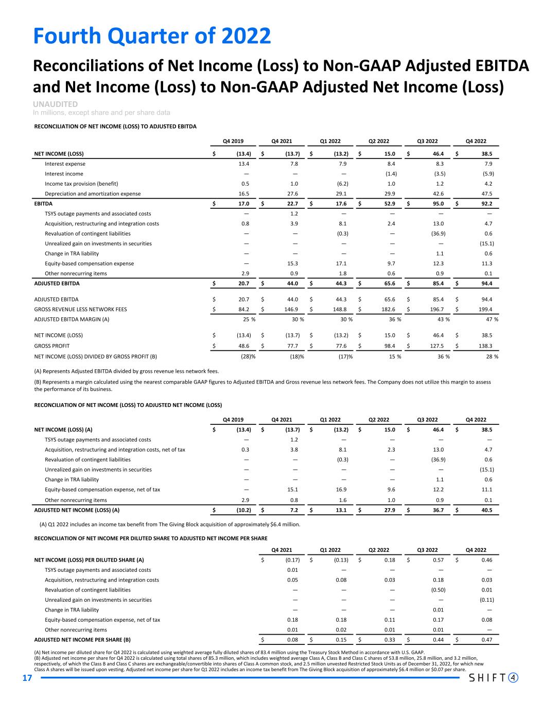 Fourth Quarter of 2022 17 Reconciliations of Net Income (Loss) to Non-GAAP Adjusted EBITDA and Net Income (Loss) to Non-GAAP Adjusted Net Income (Loss) UNAUDITED In millions, except share and per share data RECONCILIATION OF NET INCOME (LOSS) TO ADJUSTED EBITDA Q4 2019 Q4 2021 Q1 2022 Q2 2022 Q3 2022 Q4 2022 NET INCOME (LOSS) $ (13.4) $ (13.7) $ (13.2) $ 15.0 $ 46.4 $ 38.5 Interest expense 13.4 7.8 7.9 8.4 8.3 7.9 Interest income — — — (1.4) (3.5) (5.9) Income tax provision (benefit) 0.5 1.0 (6.2) 1.0 1.2 4.2 Depreciation and amortization expense 16.5 27.6 29.1 29.9 42.6 47.5 EBITDA $ 17.0 $ 22.7 $ 17.6 $ 52.9 $ 95.0 $ 92.2 TSYS outage payments and associated costs — 1.2 — — — — Acquisition, restructuring and integration costs 0.8 3.9 8.1 2.4 13.0 4.7 Revaluation of contingent liabilities — — (0.3) — (36.9) 0.6 Unrealized gain on investments in securities — — — — — (15.1) Change in TRA liability — — — — 1.1 0.6 Equity-based compensation expense — 15.3 17.1 9.7 12.3 11.3 Other nonrecurring items 2.9 0.9 1.8 0.6 0.9 0.1 ADJUSTED EBITDA $ 20.7 $ 44.0 $ 44.3 $ 65.6 $ 85.4 $ 94.4 ADJUSTED EBITDA $ 20.7 $ 44.0 $ 44.3 $ 65.6 $ 85.4 $ 94.4 GROSS REVENUE LESS NETWORK FEES $ 84.2 $ 146.9 $ 148.8 $ 182.6 $ 196.7 $ 199.4 ADJUSTED EBITDA MARGIN (A) 25 % 30 % 30 % 36 % 43 % 47 % NET INCOME (LOSS) $ (13.4) $ (13.7) $ (13.2) $ 15.0 $ 46.4 $ 38.5 GROSS PROFIT $ 48.6 $ 77.7 $ 77.6 $ 98.4 $ 127.5 $ 138.3 NET INCOME (LOSS) DIVIDED BY GROSS PROFIT (B) (28) % (18) % (17) % 15 % 36 % 28 % (A) Represents Adjusted EBITDA divided by gross revenue less network fees. (B) Represents a margin calculated using the nearest comparable GAAP figures to Adjusted EBITDA and Gross revenue less network fees. The Company does not utilize this margin to assess the performance of its business. RECONCILIATION OF NET INCOME (LOSS) TO ADJUSTED NET INCOME (LOSS) Q4 2019 Q4 2021 Q1 2022 Q2 2022 Q3 2022 Q4 2022 NET INCOME (LOSS) (A) $ (13.4) $ (13.7) $ (13.2) $ 15.0 $ 46.4 $ 38.5 TSYS outage payments and associated costs — 1.2 — — — — Acquisition, restructuring and integration costs, net of tax 0.3 3.8 8.1 2.3 13.0 4.7 Revaluation of contingent liabilities — — (0.3) — (36.9) 0.6 Unrealized gain on investments in securities — — — — — (15.1) Change in TRA liability — — — — 1.1 0.6 Equity-based compensation expense, net of tax — 15.1 16.9 9.6 12.2 11.1 Other nonrecurring items 2.9 0.8 1.6 1.0 0.9 0.1 ADJUSTED NET INCOME (LOSS) (A) $ (10.2) $ 7.2 $ 13.1 $ 27.9 $ 36.7 $ 40.5 (A) Q1 2022 includes an income tax benefit from The Giving Block acquisition of approximately $6.4 million. RECONCILIATION OF NET INCOME PER DILUTED SHARE TO ADJUSTED NET INCOME PER SHARE Q4 2021 Q1 2022 Q2 2022 Q3 2022 Q4 2022 NET INCOME (LOSS) PER DILUTED SHARE (A) $ (0.17) $ (0.13) $ 0.18 $ 0.57 $ 0.46 TSYS outage payments and associated costs 0.01 — — — — Acquisition, restructuring and integration costs 0.05 0.08 0.03 0.18 0.03 Revaluation of contingent liabilities — — — (0.50) 0.01 Unrealized gain on investments in securities — — — — (0.11) Change in TRA liability — — — 0.01 — Equity-based compensation expense, net of tax 0.18 0.18 0.11 0.17 0.08 Other nonrecurring items 0.01 0.02 0.01 0.01 — ADJUSTED NET INCOME PER SHARE (B) $ 0.08 $ 0.15 $ 0.33 $ 0.44 $ 0.47 (A) Net income per diluted share for Q4 2022 is calculated using weighted average fully diluted shares of 83.4 million using the Treasury Stock Method in accordance with U.S. GAAP. (B) Adjusted net income per share for Q4 2022 is calculated using total shares of 85.3 million, which includes weighted average Class A, Class B and Class C shares of 53.8 million, 25.8 million, and 3.2 million, respectively, of which the Class B and Class C shares are exchangeable/convertible into shares of Class A common stock, and 2.5 million unvested Restricted Stock Units as of December 31, 2022, for which new Class A shares will be issued upon vesting. Adjusted net income per share for Q1 2022 includes an income tax benefit from The Giving Block acquisition of approximately $6.4 million or $0.07 per share.