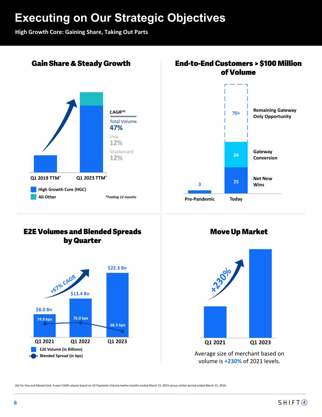 Dear Shareholders, 3 We just wrapped up what was a reasonably strong quarter. I am especially proud that we have established new quarterly records for volume, gross revenue less network fees, and free cash flow. Simply put, we achieved these results by executing & winning share in a large addressable market. Additionally, we completed a small but important acquisition, and advanced many of our organic initiatives. As a result, we are positively revising our 2023 guidance. Considering we were anticipating a more challenging economic climate, it’s hard not to be cautiously optimistic. More specifically, in Q1 2023 we grew our end-to-end volume, gross revenue, and gross revenue less network fees 66%, 36%, and 34%, respectively versus the comparable period a year ago. The majority of our growth continues to come from our high growth core, which represents restaurants and hotels. This past quarter also benefited from our new verticals, especially Sports & Entertainment including ticketing, as well as Travel, Gaming and our strategic enterprise relationships. Our average customer size has increased 230% over the last 3 years and we now serve approximately 50 enterprise merchants that process in excess of $100 million a year in payments and over 70 on our gateway that we are working on converting to our end-to-end offering. This quarter, we added several new signature merchants including a mega resort in Arizona called VAI, as well as the Chicago White Sox, Washington Commanders, and two large Las Vegas properties that we are not permitted to disclose. Additionally, we signed an agreement with Six Flags theme parks to use our software and payment technology for their food and beverage operations. Keep in mind, we also get excited when we renew and expand our relationship with existing merchants. For example, we renewed & expanded our agreements with two major undisclosed hospitality operators. We now have a hunting license to promote SkyTab POS across hundreds of hotel properties, and will deploy our VenueNext mobile software in the other resort operator. The Shift4 story is about more than moving the top line. We have been EBITDA positive for nearly 20 years and self-funded through our first 15 years in business. This past quarter, we generated net income of $20.4 million versus a net loss of ($13.2) million a year ago, and we increased our Adjusted EBITDA 102% over the similar period. Considering how quickly we are generating cash and deleveraging, the Board has authorized a $250 million share buyback program. Although there are clearly other capital allocation priorities as well. The expanding profitability profile of the company is being driven by our move upmarket to enterprise merchants as well as the largely direct-sales approach we have taken with our new SkyTab POS program. Additionally, we remain very disciplined with the goal of keeping expenses & headcount as flat as possible exiting 2022. To sustain our growth, we fully expect to upgrade talent throughout the year, we just don’t plan to add to it.