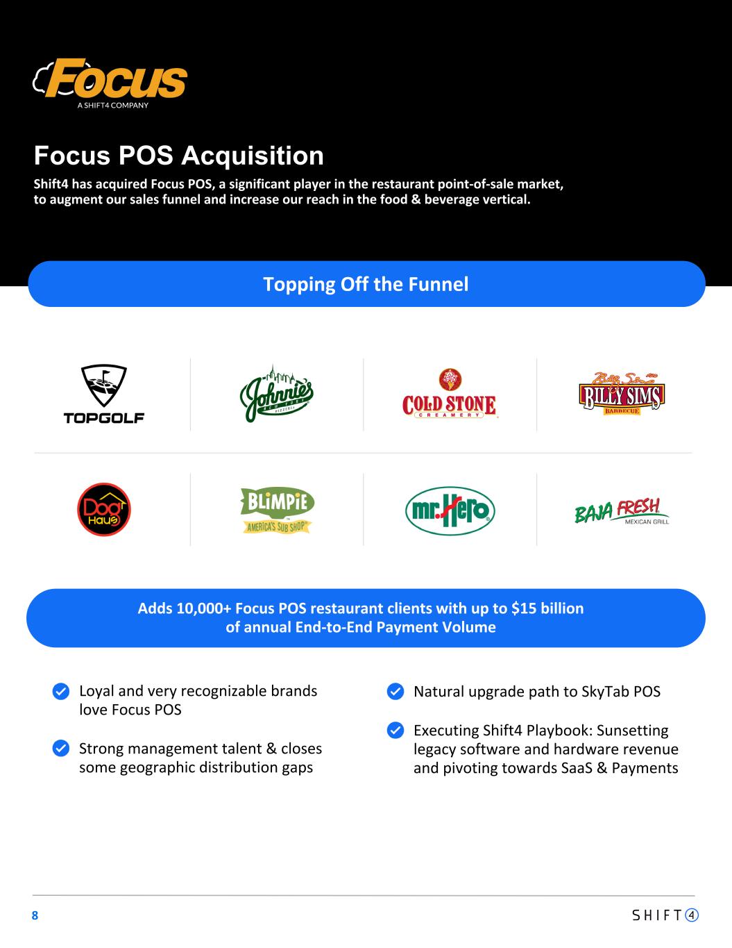 Non-GAAP Financial Measures and Key Performance Indicators Safe Harbor Statement and Forward-Looking Information We use supplemental measures of our performance which are derived from our consolidated financial information but which are not presented in our consolidated financial statements prepared in accordance with generally accepted accounting principles ("GAAP"). These non-GAAP financial measures include: gross revenue less network fees, which includes interchange and assessment fees; adjusted net income; adjusted net income per share; free cash flow; adjusted free cash flow; earnings before interest, income taxes, depreciation, and amortization (“EBITDA”); Adjusted EBITDA, Adjusted EBITDA conversion rate; and Adjusted EBITDA margin. Gross revenue less network fees represents a key performance metric that management uses to measure changes in the mix and value derived from our customer base as we continue to execute our strategy to expand our reach to serve larger, complex merchants. Adjusted net income represents net income (loss) adjusted for certain non-cash and other nonrecurring items that management believes are not indicative of ongoing operations, such as acquisition, restructuring and integration costs, revaluation of contingent liabilities, unrealized gain on investments in securities, change in TRA liability, equity-based compensation expense, and other nonrecurring items. Adjusted EBITDA is the primary financial performance measure used by management to evaluate its business and monitor results of operations. Adjusted EBITDA represents EBITDA further adjusted for certain non- cash and other nonrecurring items that management believes are not indicative of ongoing operations. These adjustments include acquisition, restructuring and integration costs, revaluation of contingent liabilities, unrealized gain on investments in securities, change in TRA liability, equity-based compensation expense, and other nonrecurring items. Free cash flow represents net cash provided by operating activities adjusted for non-discretionary capital expenditures. This presentation contains forward-looking statements within the meaning of the Private Securities Litigation Reform Act of 1995. All statements contained in this presentation that do not relate to matters of historical fact should be considered forward-looking statements, including statements regarding Shift4 Payments, Inc.’s (“our”, the “Company” or "Shift4”) expectations regarding new customers; acquisitions and other transactions, including of our sales partners and their residual streams, and our ability to close said transactions on the timeline we expect or at all; our plans and agreements regarding future payment processing commitments; our expectations with respect to economic recovery; our stock price; and anticipated financial performance, including our financial outlook for fiscal year 2023 and future periods. These statements are neither promises nor guarantees, but involve known and unknown risks, uncertainties and other important factors that may cause our actual results, performance or achievements to be materially different from any future results, performance or achievements expressed or implied by the forward-looking statements, including, but not limited to, the following: our ability to differentiate ourselves from our competitors and compete effectively; our ability to anticipate and respond to changing industry trends and merchant and consumer needs; our ability to continue making acquisitions of businesses or assets; our Adjusted Free Cash Flow represents free cash flow further adjusted for certain transactions that are not indicative of future operating cash flows, including settlement activity, which represents the change in our settlement obligation, which fluctuated based on volumes and calendar timing, acquisition, restructuring and integration costs, the impact of timing of annual performance bonuses, other nonrecurring expenses, and nonrecurring strategic capital expenditures that are not indicative of ongoing activities. We believe Adjusted Free Cash Flow is useful to measure the funds generated in a given period that are available to invest in the business, to repurchase stock and to make strategic decisions. We believe this supplemental information enhances shareholders’ ability to evaluate the Company’s performance. The Adjusted EBITDA conversion rate is calculated as Adjusted Free Cash Flow divided by Adjusted EBITDA. We use non-GAAP financial measures to supplement financial information presented on a GAAP basis. We believe that excluding certain items from our GAAP results allows management to better understand our consolidated financial performance from period to period and better project our future consolidated financial performance as forecasts are developed at a level of detail different from that used to prepare GAAP-based financial measures. Moreover, we believe these non-GAAP financial measures provide our stakeholders with useful information to help them evaluate our operating results by facilitating an enhanced understanding of our operating performance and enabling them to make more meaningful period to period comparisons. There are limitations to the use of the non-GAAP financial measures presented in this presentation. Our non-GAAP financial measures may not be comparable to similarly titled measures of other companies. Other companies, including companies in our industry, may calculate non-GAAP financial measures differently than we do, limiting the usefulness of those measures for comparative purposes. The non- GAAP financial measures are not meant to be ability to continue to expand our market share or expand into new markets; our reliance on third-party vendors to provide products and services; our ability to integrate our services and products with operating systems, devices, software and web browsers; our ability to maintain merchant and software partner relati