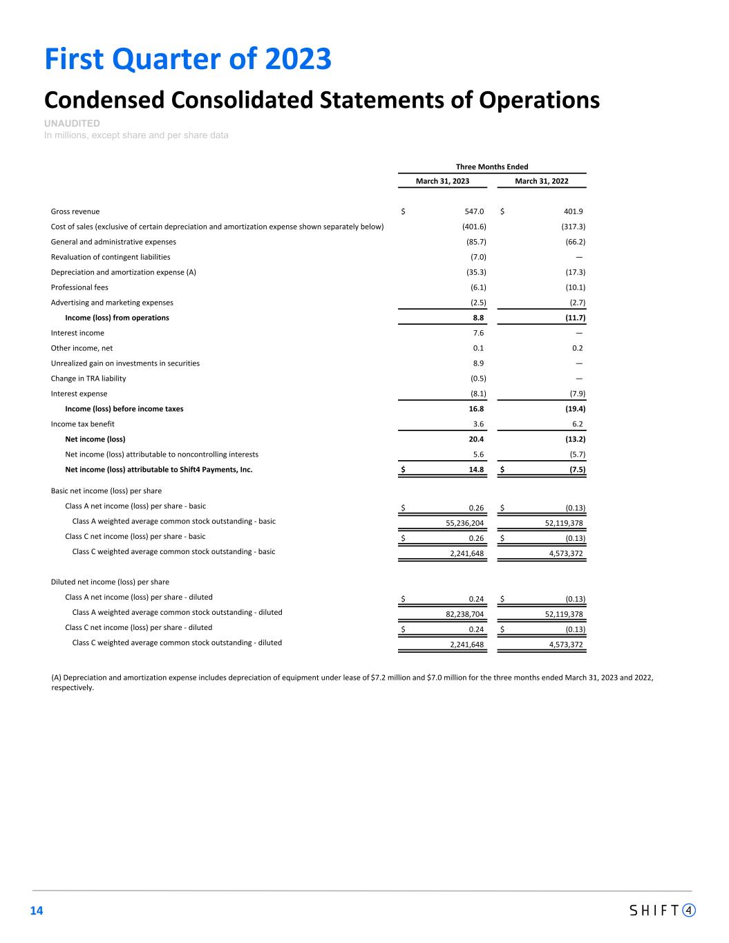 14 First Quarter of 2023 Condensed Consolidated Statements of Operations UNAUDITED In millions, except share and per share data Three Months Ended March 31, 2023 March 31, 2022 Gross revenue $ 547.0 $ 401.9 Cost of sales (exclusive of certain depreciation and amortization expense shown separately below) (401.6) (317.3) General and administrative expenses (85.7) (66.2) Revaluation of contingent liabilities (7.0) — Depreciation and amortization expense (A) (35.3) (17.3) Professional fees (6.1) (10.1) Advertising and marketing expenses (2.5) (2.7) Income (loss) from operations 8.8 (11.7) Interest income 7.6 — Other income, net 0.1 0.2 Unrealized gain on investments in securities 8.9 — Change in TRA liability (0.5) — Interest expense (8.1) (7.9) Income (loss) before income taxes 16.8 (19.4) Income tax benefit 3.6 6.2 Net income (loss) 20.4 (13.2) Net income (loss) attributable to noncontrolling interests 5.6 (5.7) Net income (loss) attributable to Shift4 Payments, Inc. $ 14.8 $ (7.5) Basic net income (loss) per share Class A net income (loss) per share - basic $ 0.26 $ (0.13) Class A weighted average common stock outstanding - basic 55,236,204 52,119,378 Class C net income (loss) per share - basic $ 0.26 $ (0.13) Class C weighted average common stock outstanding - basic 2,241,648 4,573,372 Diluted net income (loss) per share Class A net income (loss) per share - diluted $ 0.24 $ (0.13) Class A weighted average common stock outstanding - diluted 82,238,704 52,119,378 Class C net income (loss) per share - diluted $ 0.24 $ (0.13) Class C weighted average common stock outstanding - diluted 2,241,648 4,573,372 (A) Depreciation and amortization expense includes depreciation of equipment under lease of $7.2 million and $7.0 million for the three months ended March 31, 2023 and 2022, respectively.
