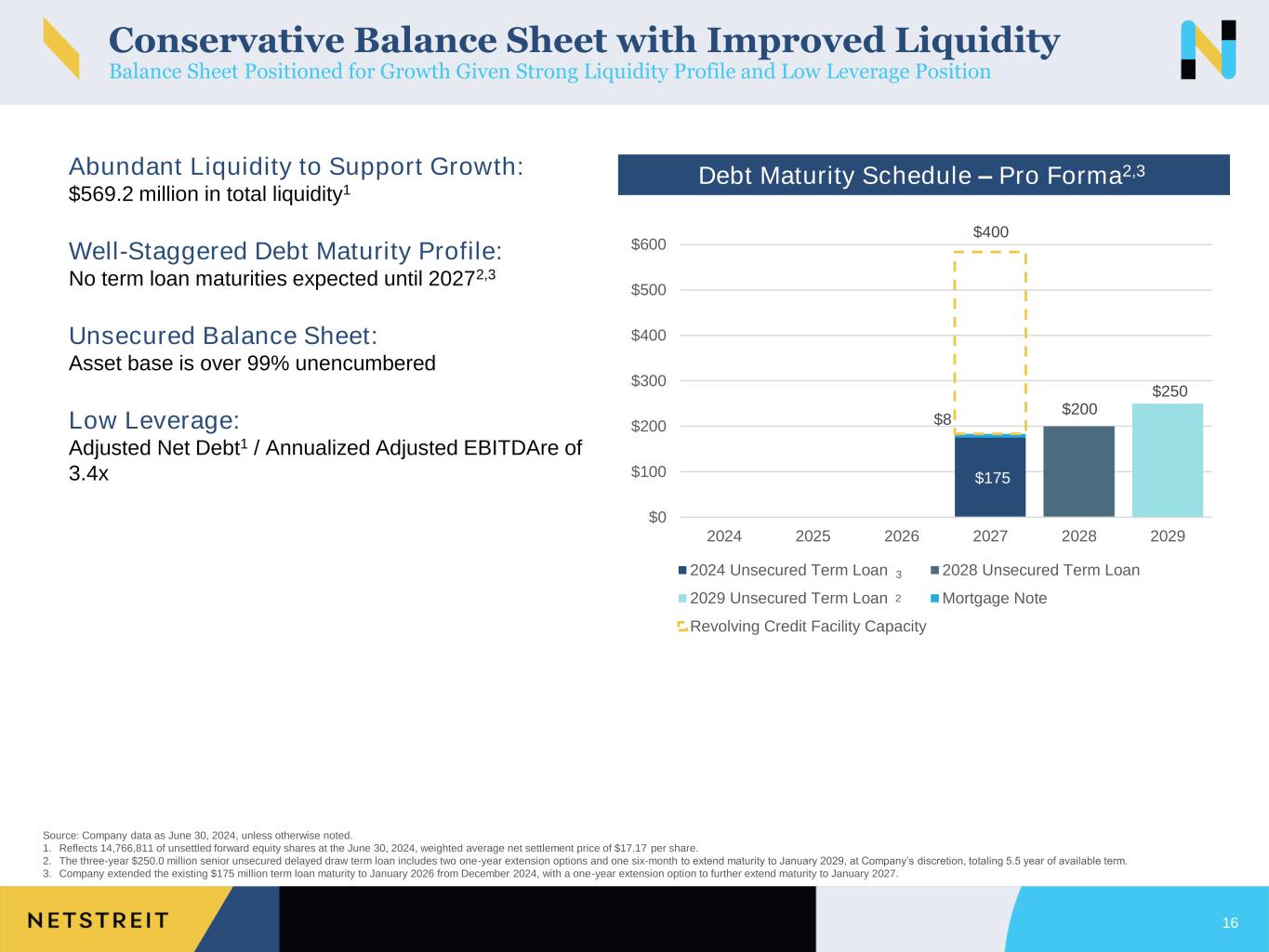 Source: Company data as June 30, 2024, unless otherwise noted. 1. Reflects 14,766,811 of unsettled forward equity shares at the June 30, 2024, weighted average net settlement price of $17.17 per share. 2. The three-year $250.0 million senior unsecured delayed draw term loan includes two one-year extension options and one six-month to extend maturity to January 2029, at Company’s discretion, totaling 5.5 year of available term. 3. Company extended the existing $175 million term loan maturity to January 2026 from December 2024, with a one-year extension option to further extend maturity to January 2027. Conservative Balance Sheet with Improved Liquidity Balance Sheet Positioned for Growth Given Strong Liquidity Profile and Low Leverage Position Debt Maturity Schedule – Pro Forma2,3 Abundant Liquidity to Support Growth: $569.2 million in total liquidity1 Well-Staggered Debt Maturity Profile: No term loan maturities expected until 20272,3 Unsecured Balance Sheet: Asset base is over 99% unencumbered Low Leverage: Adjusted Net Debt1 / Annualized Adjusted EBITDAre of 3.4x 3 2 16 $175 $200 $250 $8 $400 $0 $100 $200 $300 $400 $500 $600 2024 2025 2026 2027 2028 2029 2024 Unsecured Term Loan 2028 Unsecured Term Loan 2029 Unsecured Term Loan Mortgage Note Revolving Credit Facility Capacity