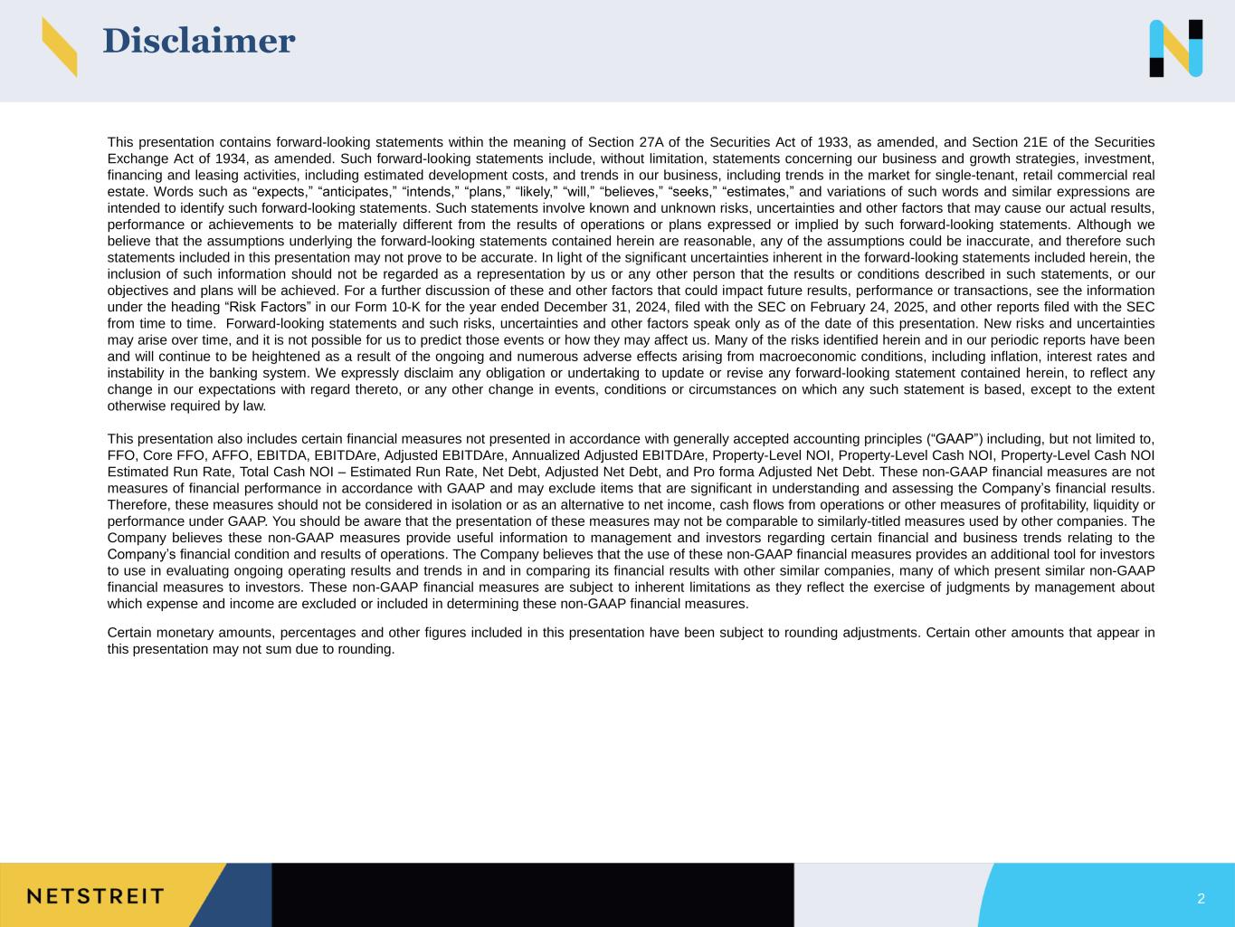 Disclaimer 2 This presentation contains forward-looking statements within the meaning of Section 27A of the Securities Act of 1933, as amended, and Section 21E of the Securities Exchange Act of 1934, as amended. Such forward-looking statements include, without limitation, statements concerning our business and growth strategies, investment, financing and leasing activities, including estimated development costs, and trends in our business, including trends in the market for single-tenant, retail commercial real estate. Words such as “expects,” “anticipates,” “intends,” “plans,” “likely,” “will,” “believes,” “seeks,” “estimates,” and variations of such words and similar expressions are intended to identify such forward-looking statements. Such statements involve known and unknown risks, uncertainties and other factors that may cause our actual results, performance or achievements to be materially different from the results of operations or plans expressed or implied by such forward-looking statements. Although we believe that the assumptions underlying the forward-looking statements contained herein are reasonable, any of the assumptions could be inaccurate, and therefore such statements included in this presentation may not prove to be accurate. In light of the significant uncertainties inherent in the forward-looking statements included herein, the inclusion of such information should not be regarded as a representation by us or any other person that the results or conditions described in such statements, or our objectives and plans will be achieved. For a further discussion of these and other factors that could impact future results, performance or transactions, see the information under the heading “Risk Factors” in our Form 10-K for the year ended December 31, 2024, filed with the SEC on February 24, 2025, and other reports filed with the SEC from time to time. Forward-looking statements and such risks, uncertainties and other factors speak only as of the date of this presentation. New risks and uncertainties may arise over time, and it is not possible for us to predict those events or how they may affect us. Many of the risks identified herein and in our periodic reports have been and will continue to be heightened as a result of the ongoing and numerous adverse effects arising from macroeconomic conditions, including inflation, interest rates and instability in the banking system. We expressly disclaim any obligation or undertaking to update or revise any forward-looking statement contained herein, to reflect any change in our expectations with regard thereto, or any other change in events, conditions or circumstances on which any such statement is based, except to the extent otherwise required by law. This presentation also includes certain financial measures not presented in accordance with generally accepted accounting principles (“GAAP”) including, but not limited to, FFO, Core FFO, AFFO, EBITDA, EBITDAre, Adjusted EBITDAre, Annualized Adjusted EBITDAre, Property-Level NOI, Property-Level Cash NOI, Property-Level Cash NOI Estimated Run Rate, Total Cash NOI – Estimated Run Rate, Net Debt, Adjusted Net Debt, and Pro forma Adjusted Net Debt. These non-GAAP financial measures are not measures of financial performance in accordance with GAAP and may exclude items that are significant in understanding and assessing the Company’s financial results. Therefore, these measures should not be considered in isolation or as an alternative to net income, cash flows from operations or other measures of profitability, liquidity or performance under GAAP. You should be aware that the presentation of these measures may not be comparable to similarly-titled measures used by other companies. The Company believes these non-GAAP measures provide useful information to management and investors regarding certain financial and business trends relating to the Company’s financial condition and results of operations. The Company believes that the use of these non-GAAP financial measures provides an additional tool for investors to use in evaluating ongoing operating results and trends in and in comparing its financial results with other similar companies, many of which present similar non-GAAP financial measures to investors. These non-GAAP financial measures are subject to inherent limitations as they reflect the exercise of judgments by management about which expense and income are excluded or included in determining these non-GAAP financial measures. Certain monetary amounts, percentages and other figures included in this presentation have been subject to rounding adjustments. Certain other amounts that appear in this presentation may not sum due to rounding.