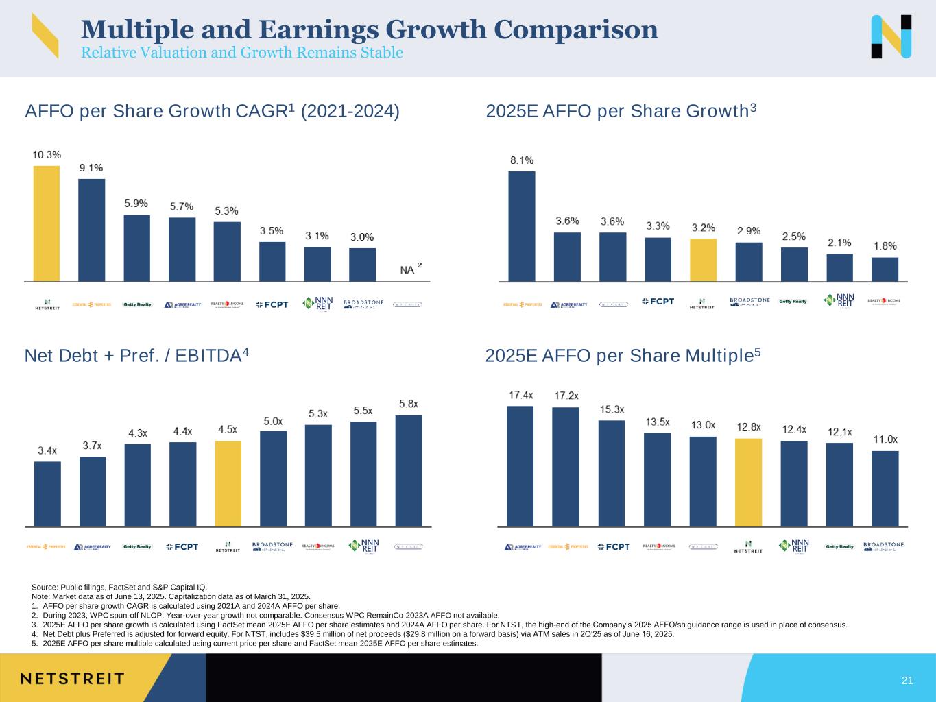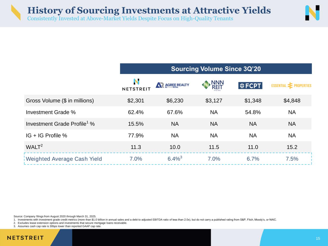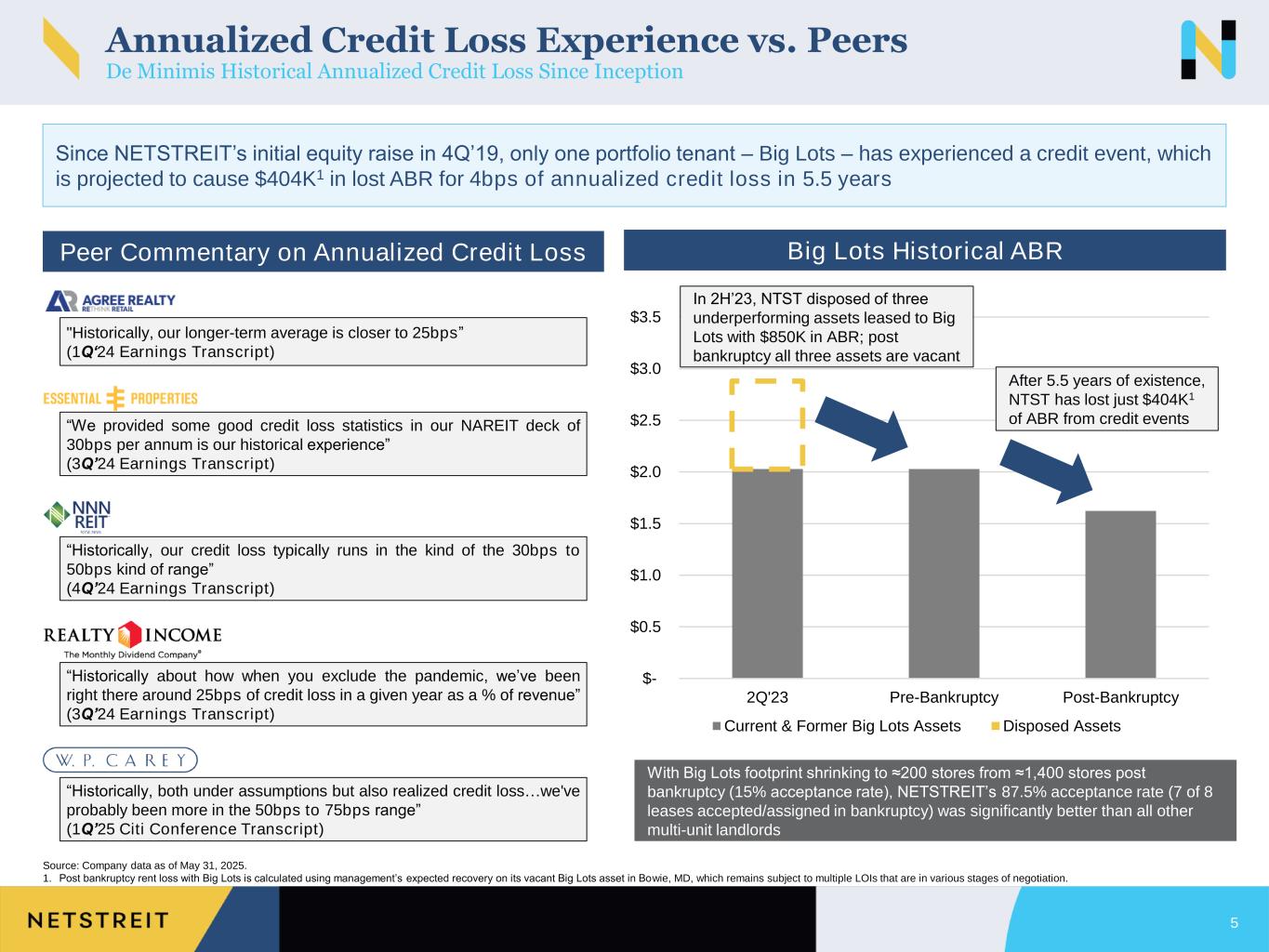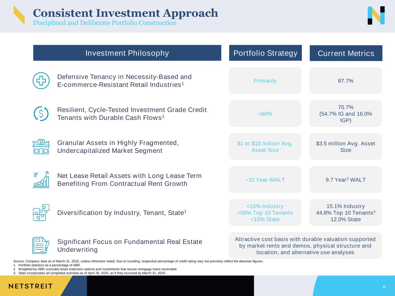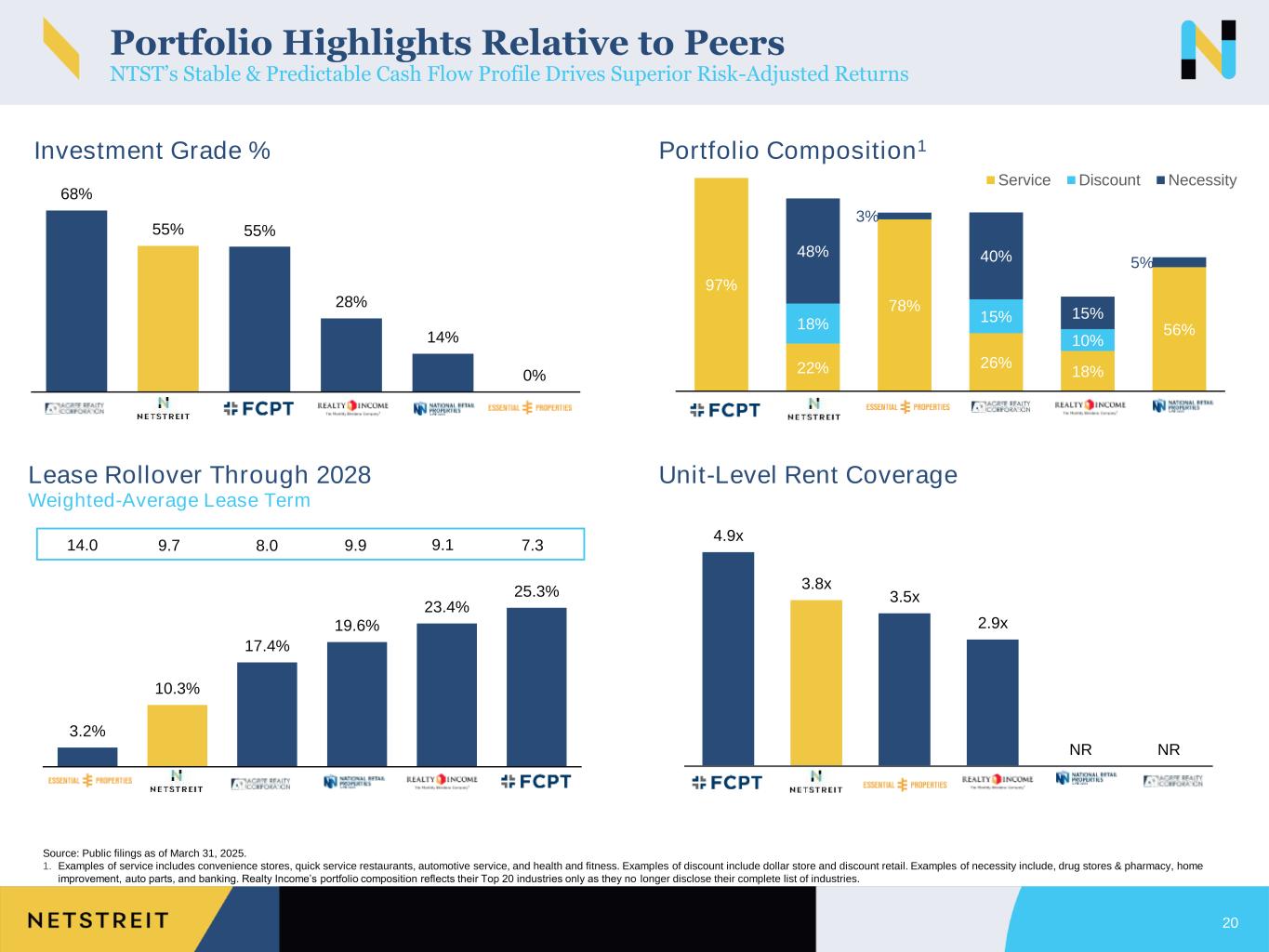 4.9x 3.8x 3.5x 2.9x NR NR FCPT NTST EPRT O NNN ADC 97% 22% 78% 26% 18% 56%18% 15% 10% 48% 3% 40% 15% 5% FCPT NTST EPRT ADC O NNN Service Discount Necessity 55% 68% 55% 28% 14% 0% ADC FCPT NTST O NNN EPRT 3.2% 10.3% 17.4% 19.6% 23.4% 25.3% EPRT NTST ADC NNN O FCPT Source: Public filings as of March 31, 2025. 1. Examples of service includes convenience stores, quick service restaurants, automotive service, and health and fitness. Examples of discount include dollar store and discount retail. Examples of necessity include, drug stores & pharmacy, home improvement, auto parts, and banking. Realty Income’s portfolio composition reflects their Top 20 industries only as they no longer disclose their complete list of industries. Portfolio Highlights Relative to Peers NTST’s Stable & Predictable Cash Flow Profile Drives Superior Risk-Adjusted Returns Lease Rollover Through 2028 Unit-Level Rent Coverage Investment Grade % Portfolio Composition1 Weighted-Average Lease Term 20 14.0 9.7 8.0 9.9 9.1 7.3