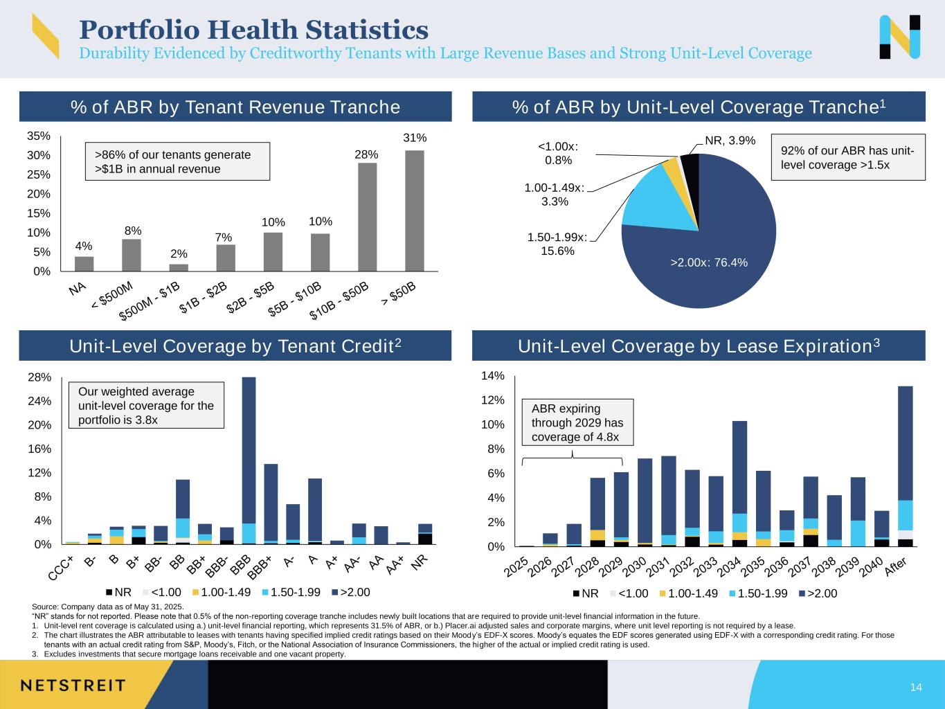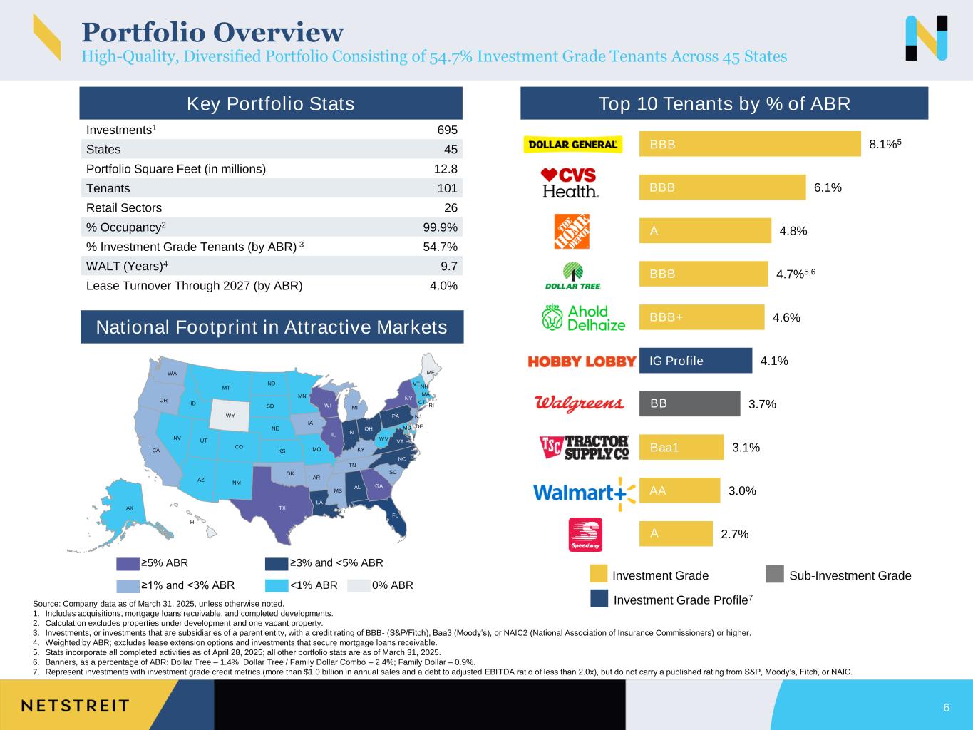 Investment Highlights & Business Update 3 Source: Company data and balance sheet as of March 31, 2025, unless otherwise noted. Figures represent percentage of ABR unless otherwise noted. Due to rounding, respective percentage of credit rating may not precisely reflect the absolute figures. 1. Represents tenants with investment grade credit metrics (more than $1.0 billion in annual sales and a debt to adjusted EBITDA ratio of less than 2.0x), but do not carry a published rating from S&P, Fitch, Moody's, or NAIC. 2. See slides 4, 5, or 14 for further details. 3. Reflects 10,735,647 of unsettled forward equity shares at the March 31, 2025, weighted average net settlement price of $17.18 per share, and an additional $39.5 million of net proceeds ($29.8 million on a forward basis) via ATM sales in 2Q’25 as of June 16, 2025. 4bps Annualized Rent Loss from Credit Events2 99.9% Occupancy 3.8x Unit-Level Rent Coverage2 $624 million Total Liquidity3 4.5x Adj. Net Debt3 / Annualized Adj. EBITDAre ✓Focused on growing portfolio with high quality tenants that offer strong credit profiles and provide consistent performance through various economic cycles ✓Proven track record of full occupancy and strong unit-level coverage; NTST’s lone vacancy has received strong interest from multiple retailers at or above current rent ✓Long weighted average lease term and de minimis intermediate-term lease expirations within the pharmacy and dollar store industries ✓Low leverage with no immediate-term debt maturities ✓$184.5 million of unsettled forward equity at 1Q’25-end ✓Strong liquidity to provide ample runway for 2025 investments ✓$39.5 million of net proceeds generated via ATM sales quarter-to-date in 2Q’25 High Credit Quality & Resilient Net Lease Portfolio Well Capitalized Balance Sheet 71% Investment Grade (IG) and Investment Grade Profile (IGP)1 7.0% Wtd. Avg. Cash Yield Since 3Q’20 ✓Strong investment pace since 2020 with a solid pipeline of investment opportunities at attractive cash yields ✓$90.7 million of gross investments completed in 1Q’25 Proven Ability to Source Attractive Investment Opportunities 2028 First Term Loan Maturity $104 million Avg. Net Investments Per Quarter Since 3Q’20 27% Adj. Net Debt3 / Undepreciated Gross Assets $46 million YTD Net Investments 7.7% YTD Cash Yield 9.7 Years Weighted Average Lease Term (WALT) 26bps Pharmacy & Dollar Store ABR2 Expiring Thru YE’28