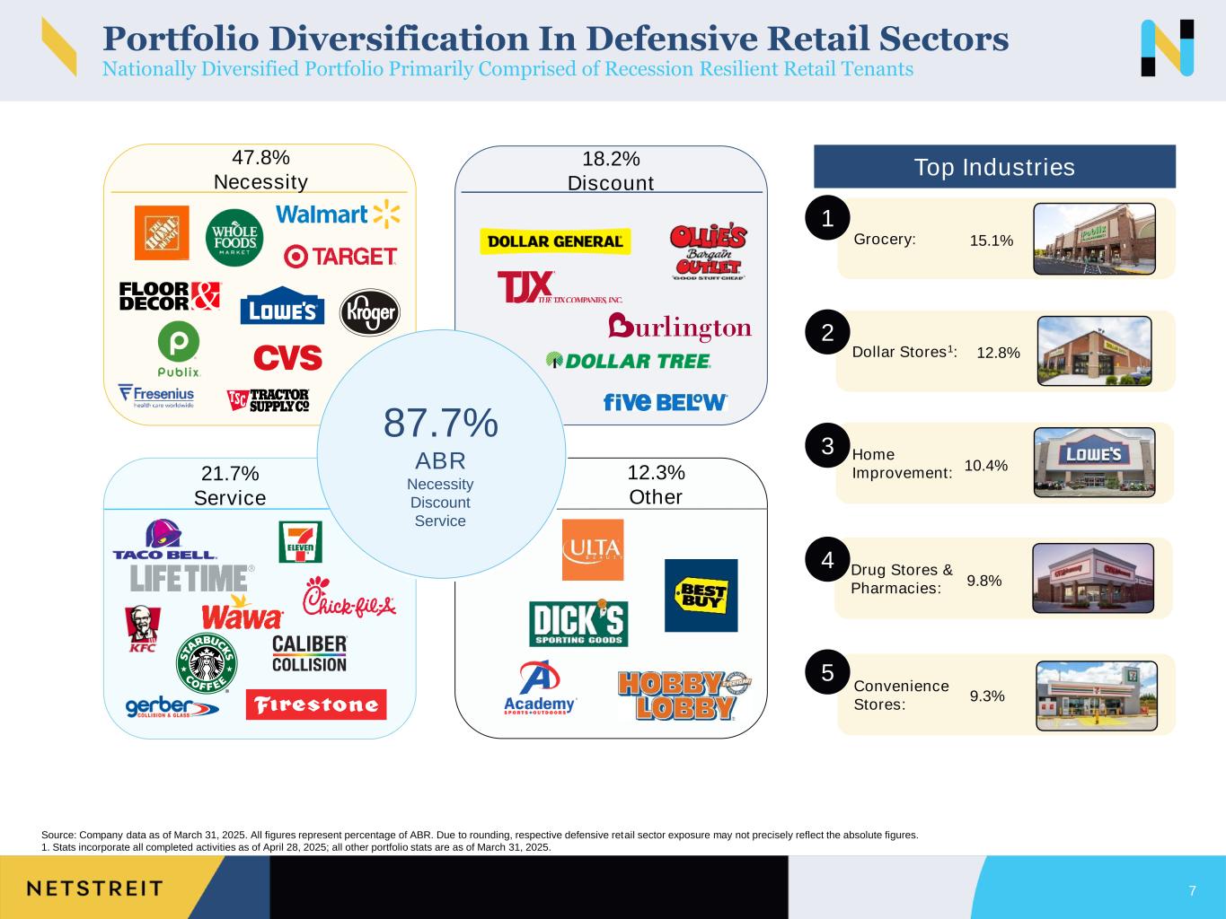 8.1%5 6.1% 4.8% 4.7%5,6 4.6% 4.1% 3.7% 3.1% 3.0% 2.7% BBB Portfolio Overview High-Quality, Diversified Portfolio Consisting of 54.7% Investment Grade Tenants Across 45 States 6 Source: Company data as of March 31, 2025, unless otherwise noted. 1. Includes acquisitions, mortgage loans receivable, and completed developments. 2. Calculation excludes properties under development and one vacant property. 3. Investments, or investments that are subsidiaries of a parent entity, with a credit rating of BBB- (S&P/Fitch), Baa3 (Moody’s), or NAIC2 (National Association of Insurance Commissioners) or higher. 4. Weighted by ABR; excludes lease extension options and investments that secure mortgage loans receivable. 5. Stats incorporate all completed activities as of April 28, 2025; all other portfolio stats are as of March 31, 2025. 6. Banners, as a percentage of ABR: Dollar Tree – 1.4%; Dollar Tree / Family Dollar Combo – 2.4%; Family Dollar – 0.9%. 7. Represent investments with investment grade credit metrics (more than $1.0 billion in annual sales and a debt to adjusted EBITDA ratio of less than 2.0x), but do not carry a published rating from S&P, Moody’s, Fitch, or NAIC. Key Portfolio Stats Investments1 695 States 45 Portfolio Square Feet (in millions) 12.8 Tenants 101 Retail Sectors 26 % Occupancy2 99.9% % Investment Grade Tenants (by ABR) 3 54.7% WALT (Years)4 9.7 Lease Turnover Through 2027 (by ABR) 4.0% National Footprint in Attractive Markets Top 10 Tenants by % of ABR Investment Grade BBB Sub-Investment Grade ≥1% and <3% ABR <1% ABR ≥5% ABR ≥3% and <5% ABR 0% ABR AK HI WA OR MT CA AZ WY NV ID UT CO NM TX OK ND SD NE KS LA AR MO IA MN WI IL IN MI OH KY TN FL MS AL GA SC NC VA WV PA DE NJ NY ME VT NH MA MD CT RI Baa1 IG Profile BBB BB BBB+ AA A A Investment Grade Profile7