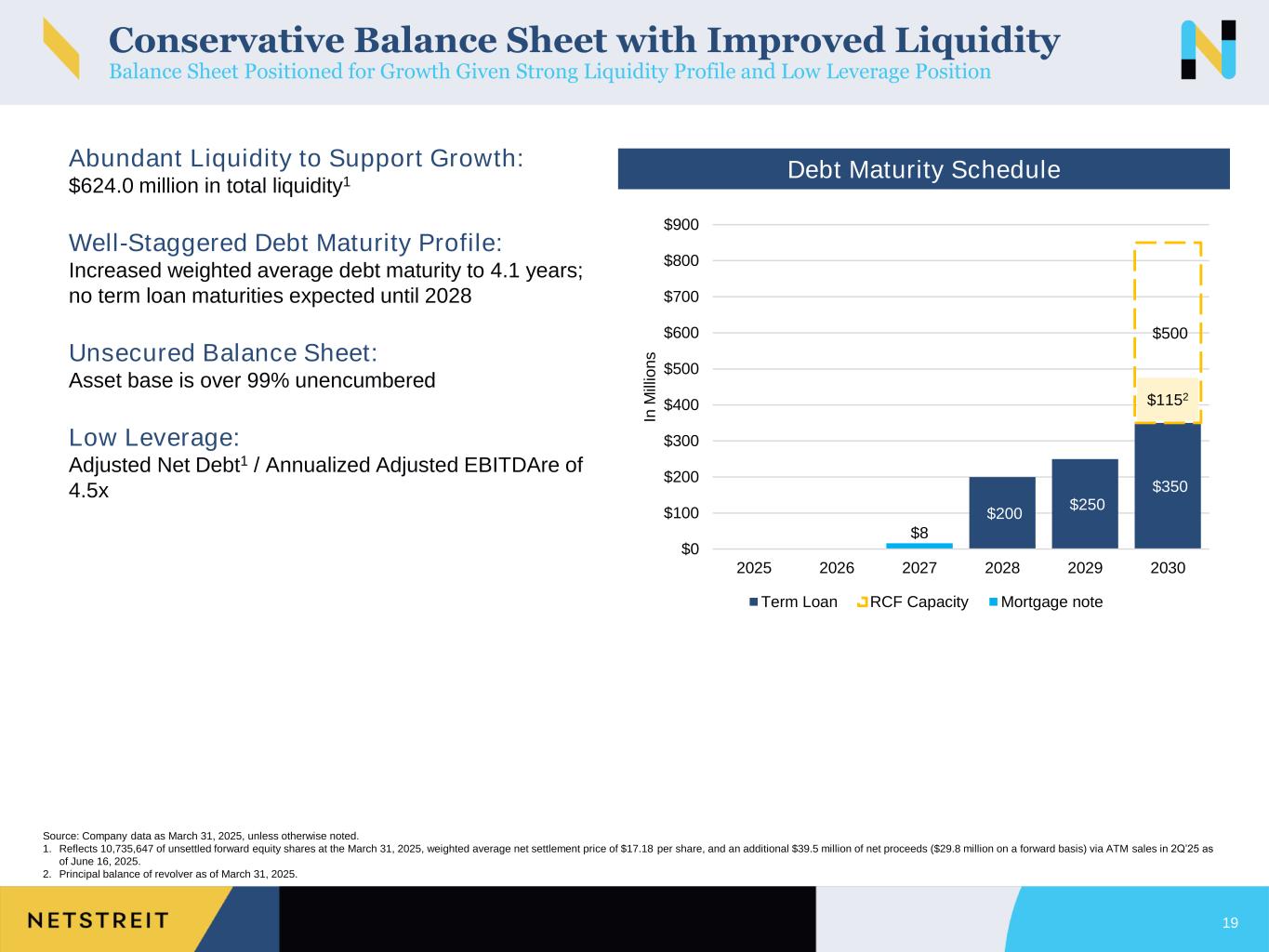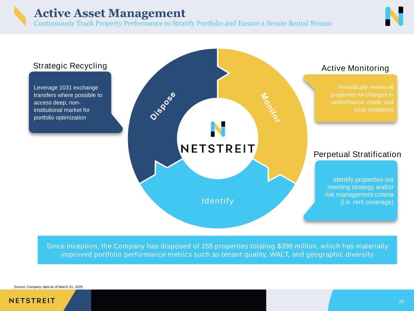 18 Source: Company data as of March 31, 2025. Since inception, the Company has disposed of 155 properties totaling $398 million, which has materially improved portfolio performance metrics such as tenant quality, WALT, and geographic diversity Identify properties not meeting strategy and/or risk management criteria (i.e. rent coverage) Periodically review all properties for changes in performance, credit, and local conditions Leverage 1031 exchange transfers where possible to access deep, non- institutional market for portfolio optimization Strategic Recycling Perpetual Stratification Active Monitoring Identify Active Asset Management Continuously Track Property Performance to Stratify Portfolio and Ensure a Secure Rental Stream