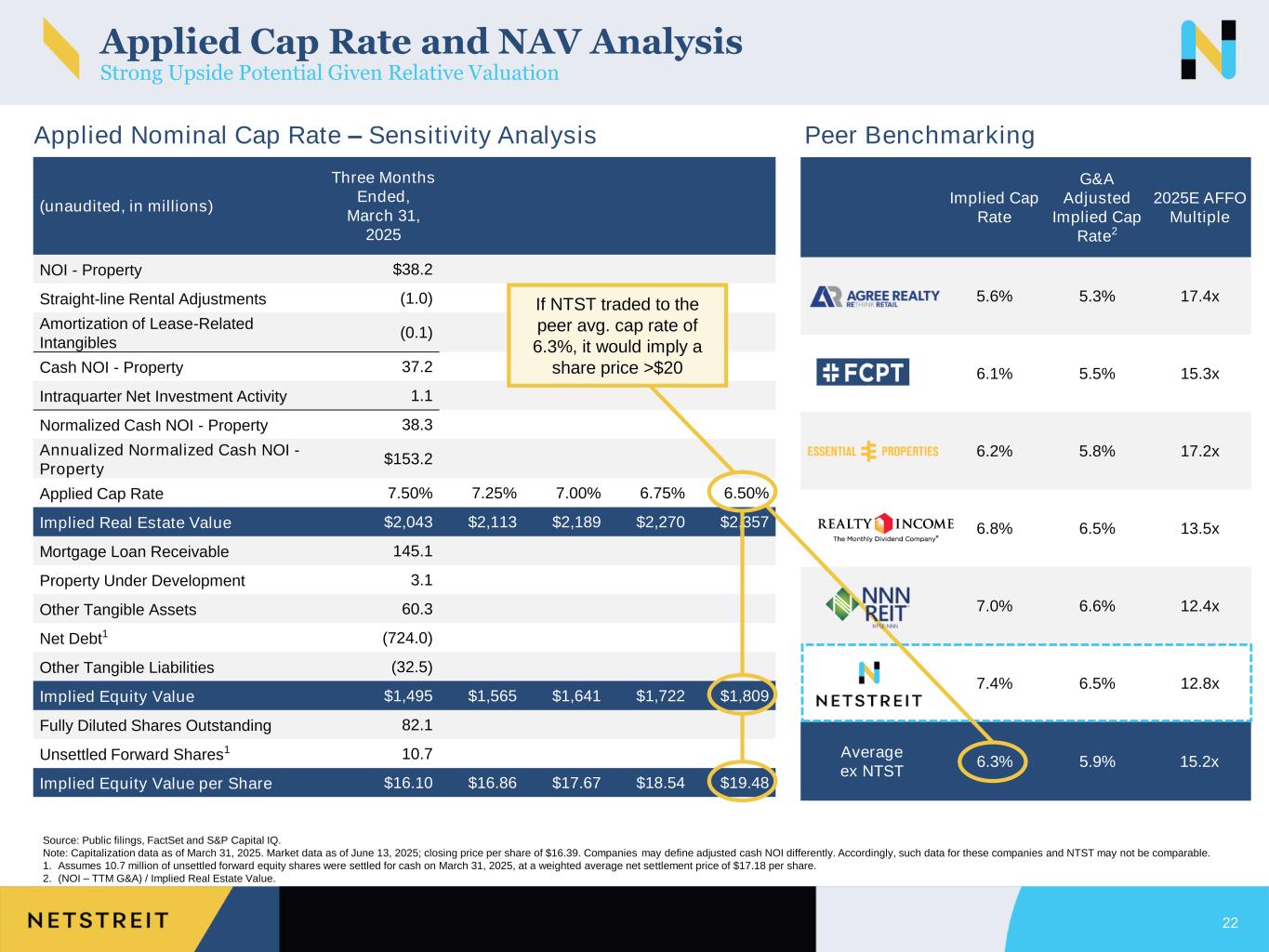 Implied Cap Rate G&A Adjusted Implied Cap Rate2 2025E AFFO Multiple 5.6% 5.3% 17.4x 6.1% 5.5% 15.3x 6.2% 5.8% 17.2x 6.8% 6.5% 13.5x 7.0% 6.6% 12.4x 7.4% 6.5% 12.8x Average ex NTST 6.3% 5.9% 15.2x Applied Cap Rate and NAV Analysis Strong Upside Potential Given Relative Valuation Applied Nominal Cap Rate – Sensitivity Analysis 22 Peer Benchmarking (unaudited, in millions) Three Months Ended, March 31, 2025 NOI - Property $38.2 Straight-line Rental Adjustments (1.0) Amortization of Lease-Related Intangibles (0.1) Cash NOI - Property 37.2 Intraquarter Net Investment Activity 1.1 Normalized Cash NOI - Property 38.3 Annualized Normalized Cash NOI - Property $153.2 Applied Cap Rate 7.50% 7.25% 7.00% 6.75% 6.50% Implied Real Estate Value $2,043 $2,113 $2,189 $2,270 $2,357 Mortgage Loan Receivable 145.1 Property Under Development 3.1 Other Tangible Assets 60.3 Net Debt1 (724.0) Other Tangible Liabilities (32.5) Implied Equity Value $1,495 $1,565 $1,641 $1,722 $1,809 Fully Diluted Shares Outstanding 82.1 Unsettled Forward Shares1 10.7 Implied Equity Value per Share $16.10 $16.86 $17.67 $18.54 $19.48 Source: Public filings, FactSet and S&P Capital IQ. Note: Capitalization data as of March 31, 2025. Market data as of June 13, 2025; closing price per share of $16.39. Companies may define adjusted cash NOI differently. Accordingly, such data for these companies and NTST may not be comparable. 1. Assumes 10.7 million of unsettled forward equity shares were settled for cash on March 31, 2025, at a weighted average net settlement price of $17.18 per share. 2. (NOI – TTM G&A) / Implied Real Estate Value. If NTST traded to the peer avg. cap rate of 6.3%, it would imply a share price >$20